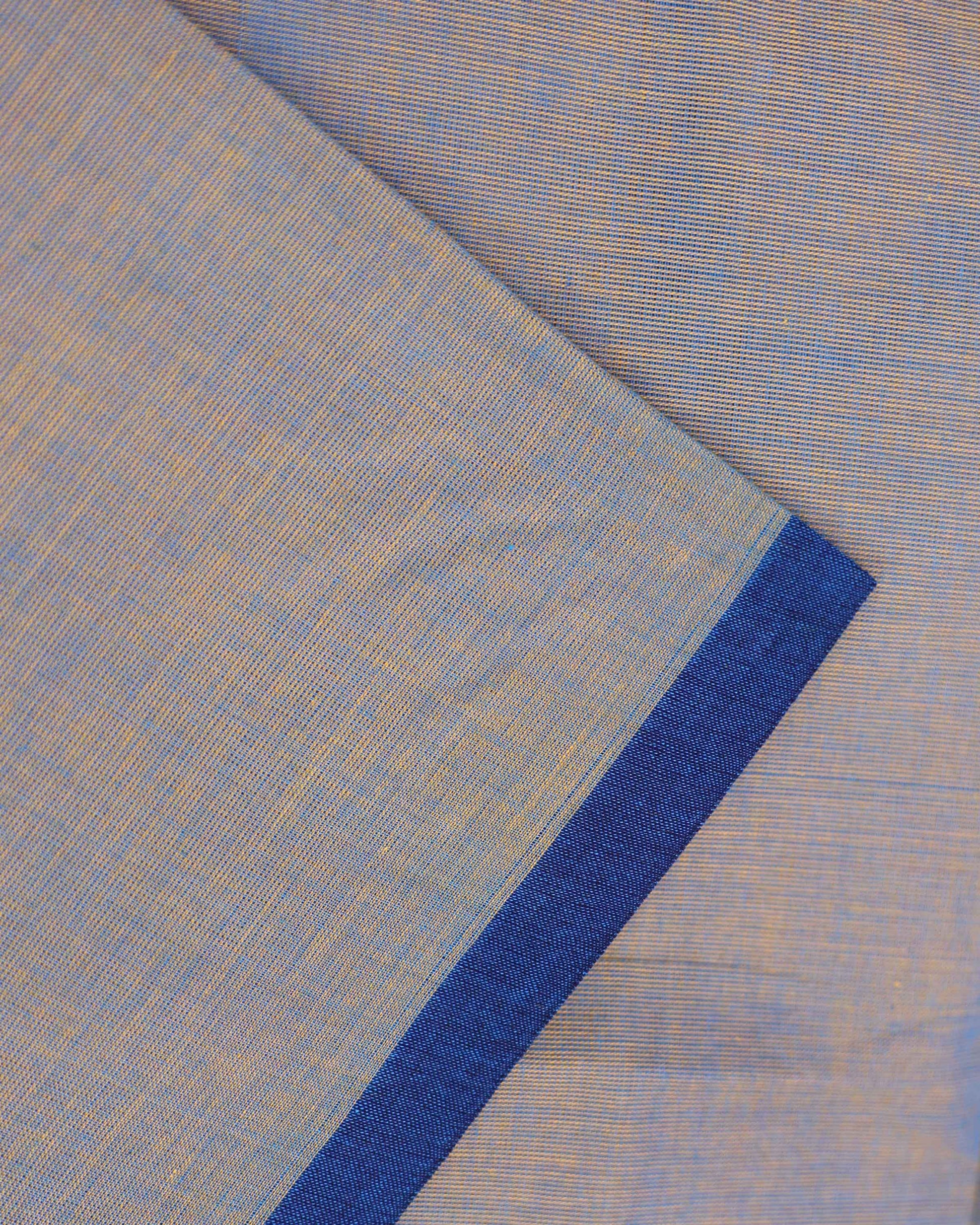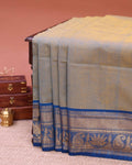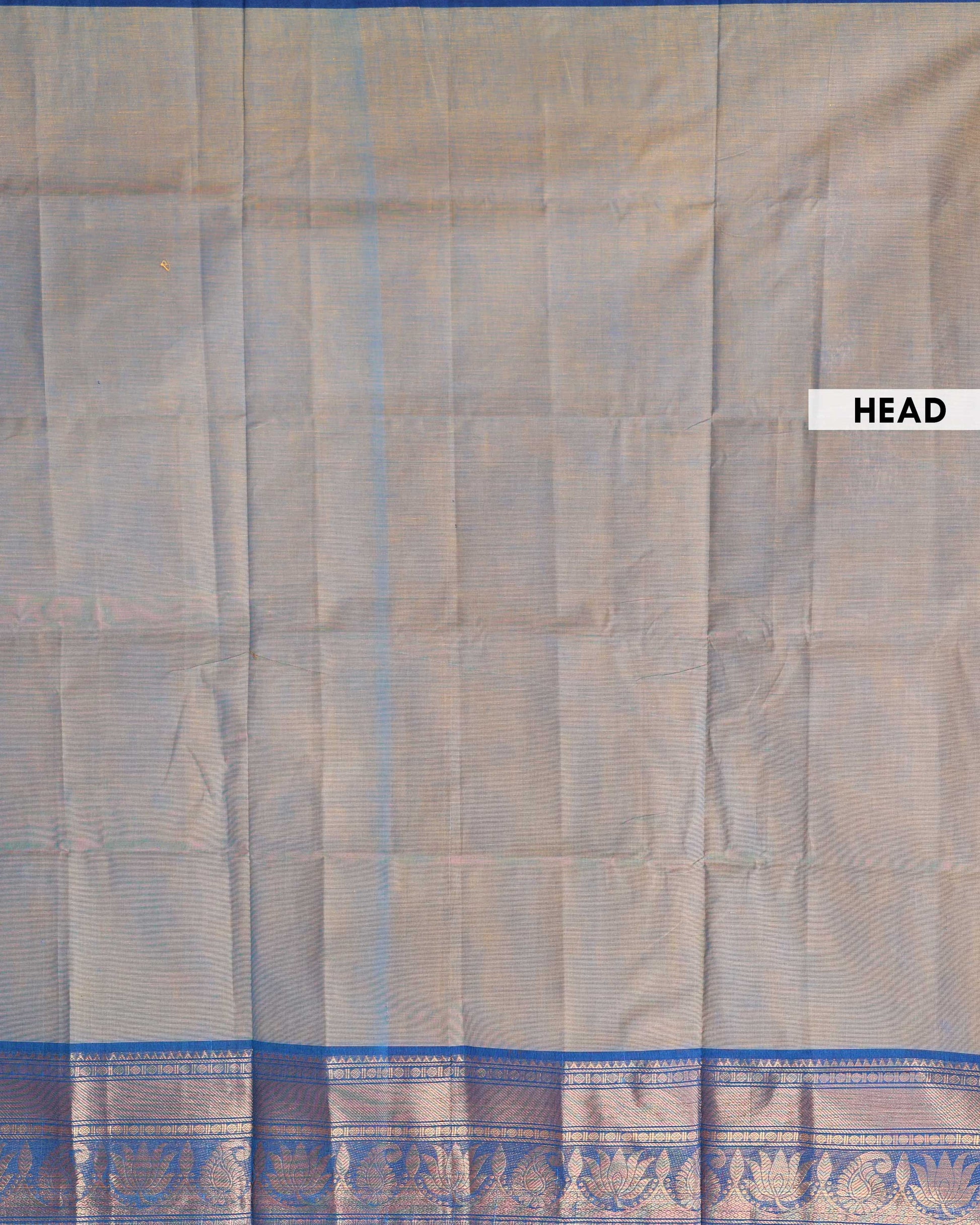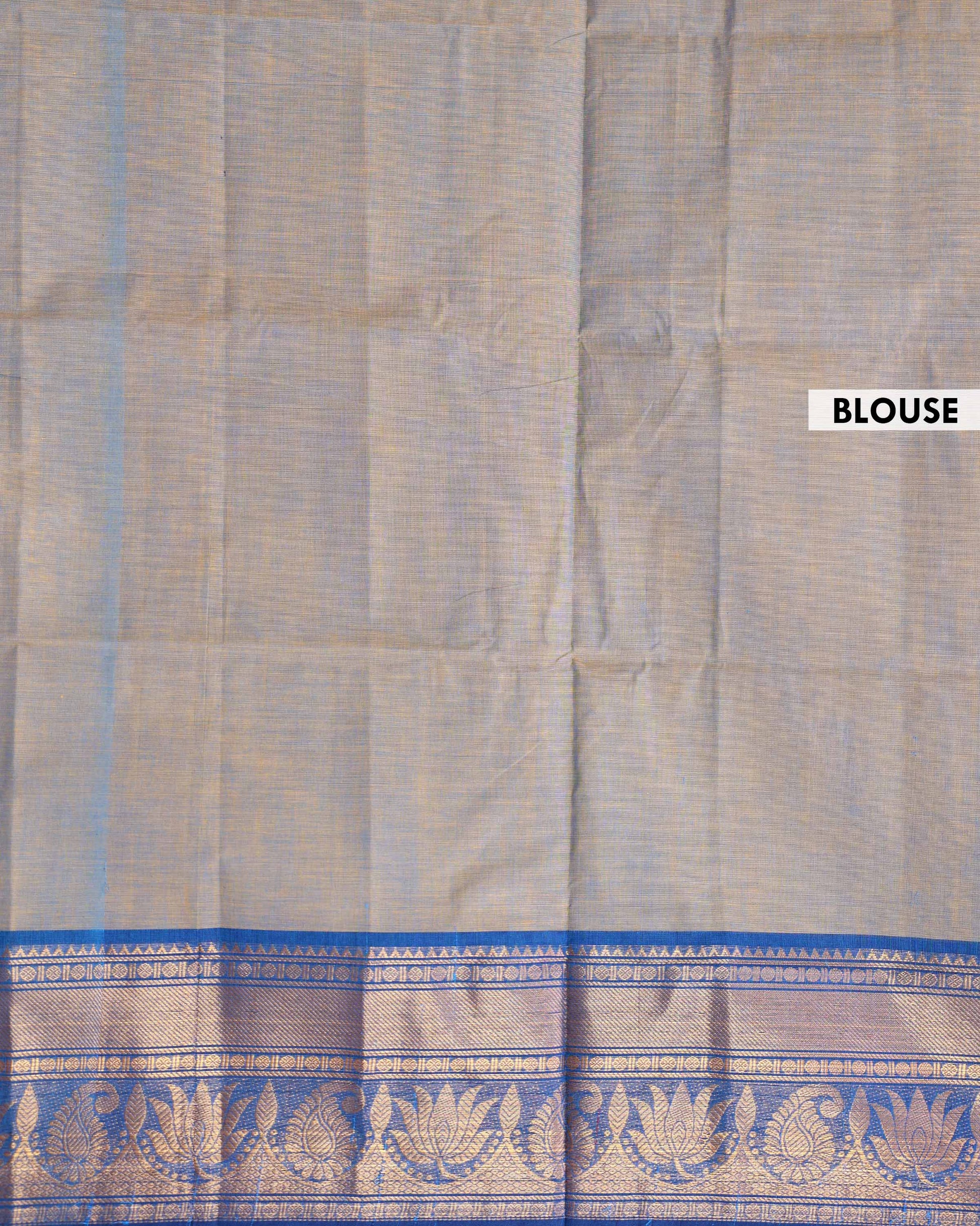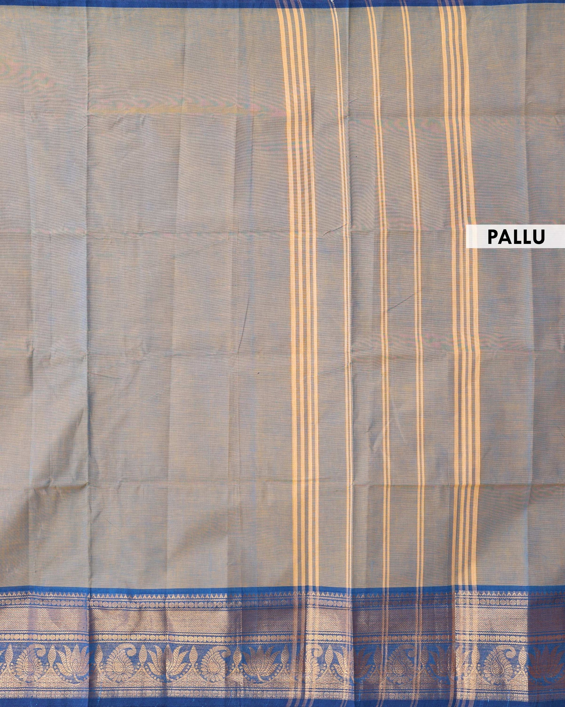 - This handwoven Venkatagiri cotton saree in a subtle Grey a striking royal blue and gold zari border, perfect for both daily elegance and festive occasions.