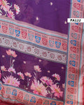 - This elegant purple georgette saree a vibrant floral print and an intricately woven traditional border