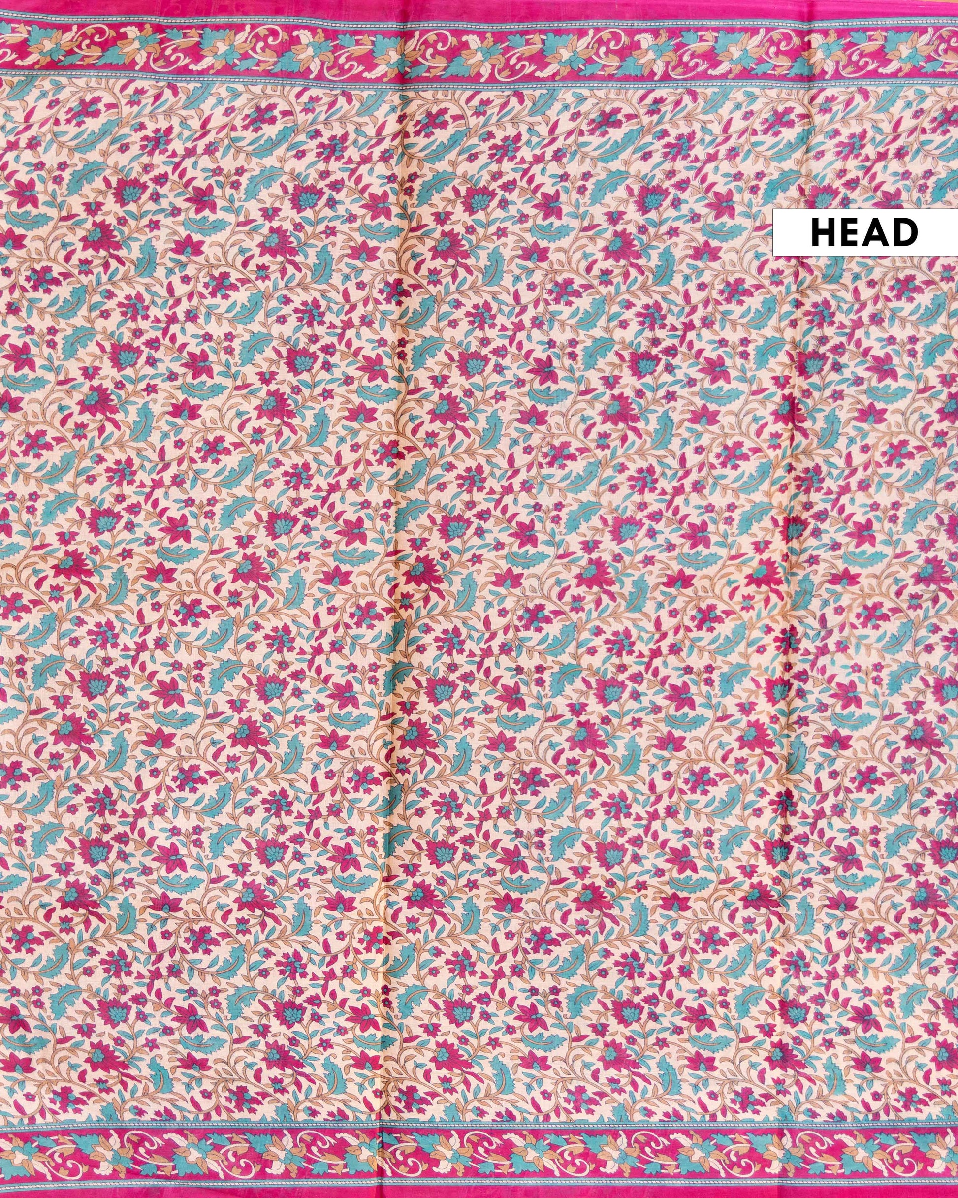 Disclaimer :- Product color may slightly vary due to photographic lighting sources or your monitor settingsIts vibrant pink and teal motifs on a soft beige base complemented by a rich border, make it perfect for comfortable and stylish summer wear.