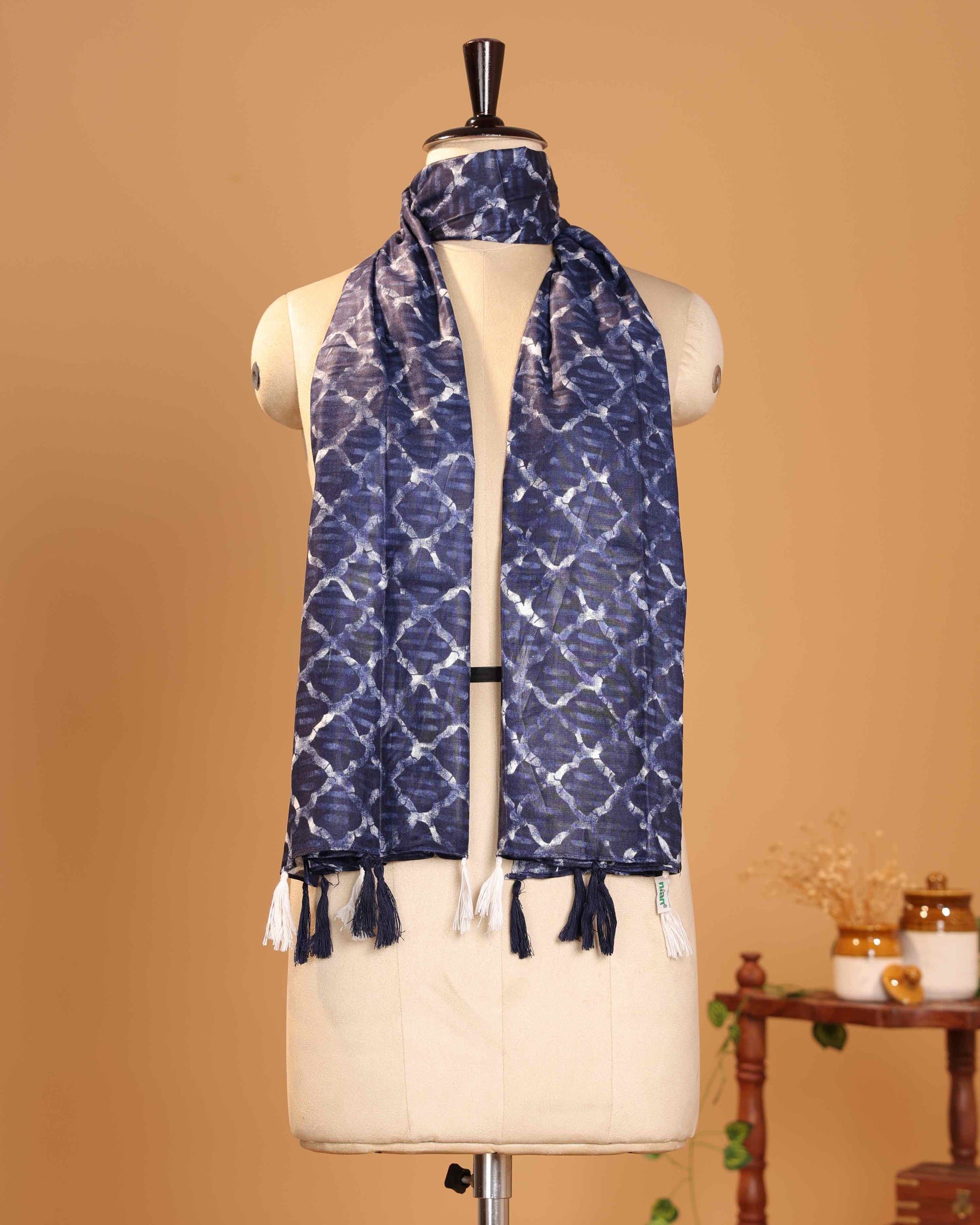 Elegant Women’s Abstract Geometric Printed Dupatta with Handcrafted Tassel Detailing - Navy Blue