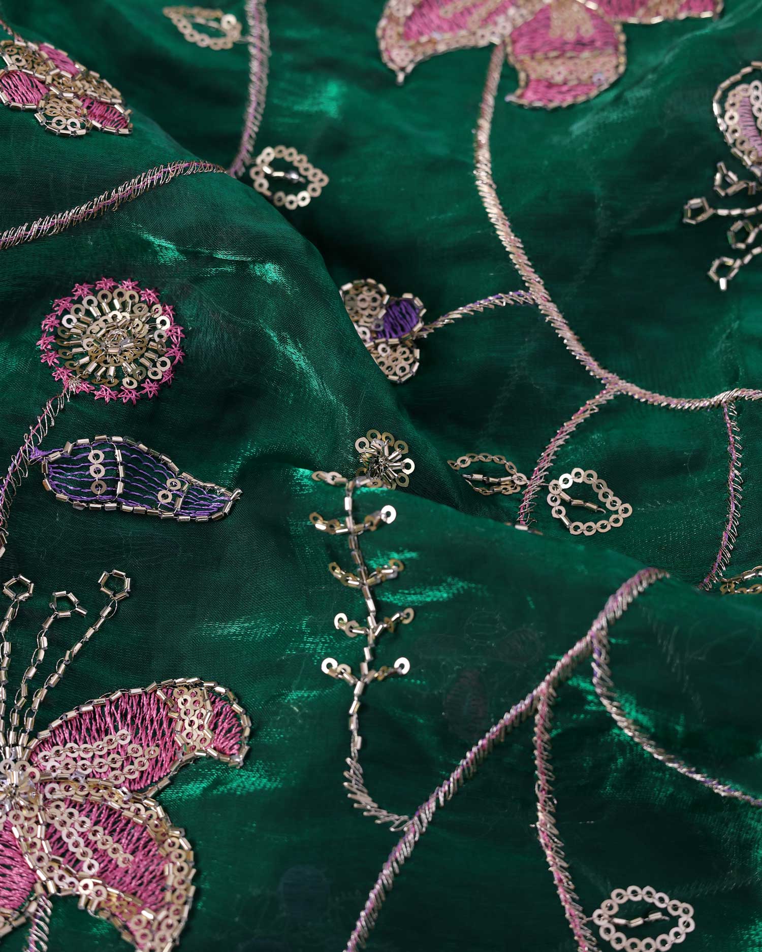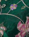Elegant Women’s Blouse Material with Intricate Floral Vine Embroidery Sequin Work - Dark Green