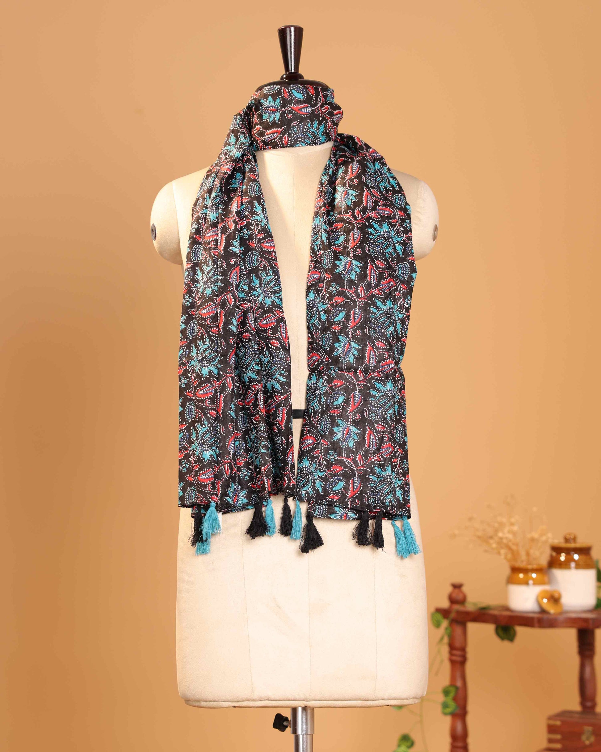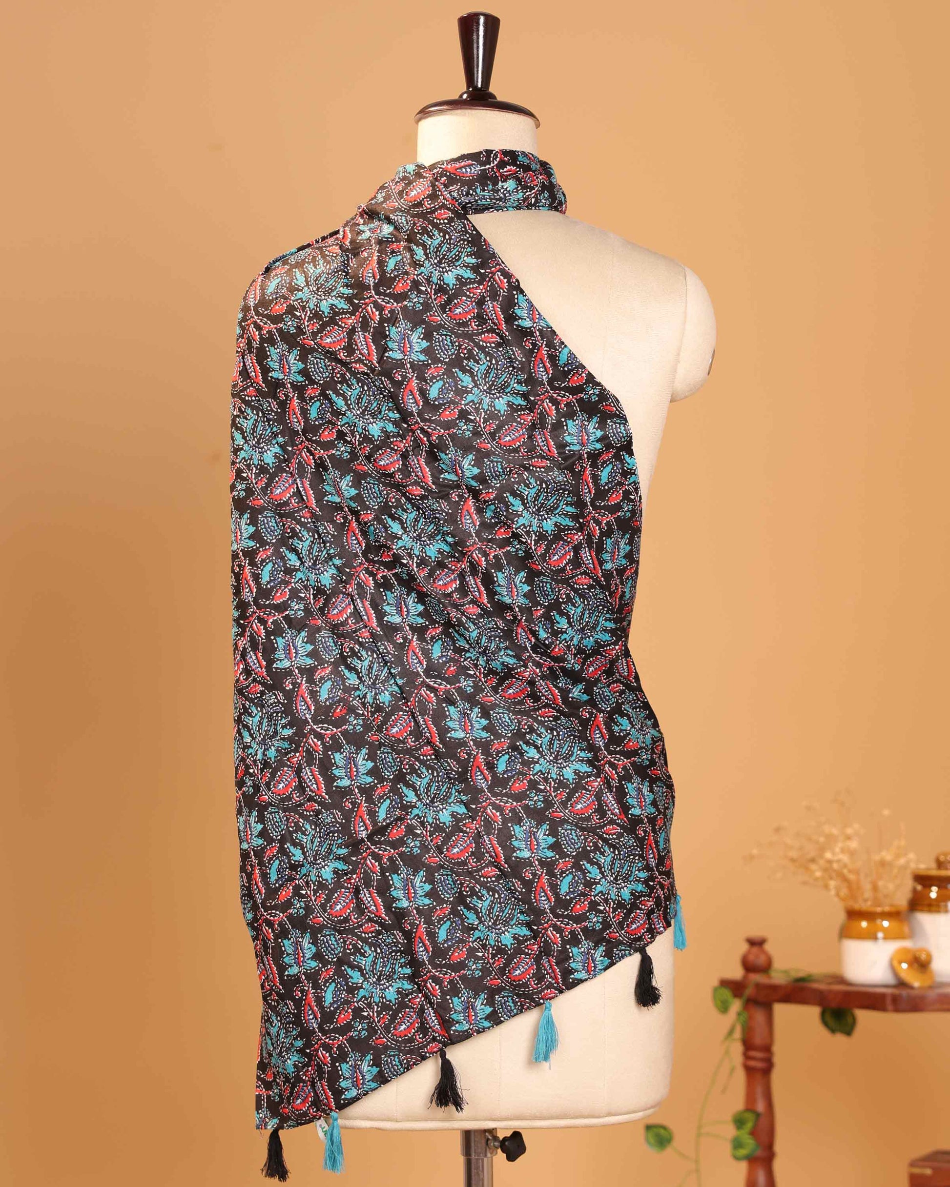 - Enhance your ethnic wardrobe with this elegant women’s dupatta featuring delicate all over floral vine motifs and neatly finished tasselled ends.