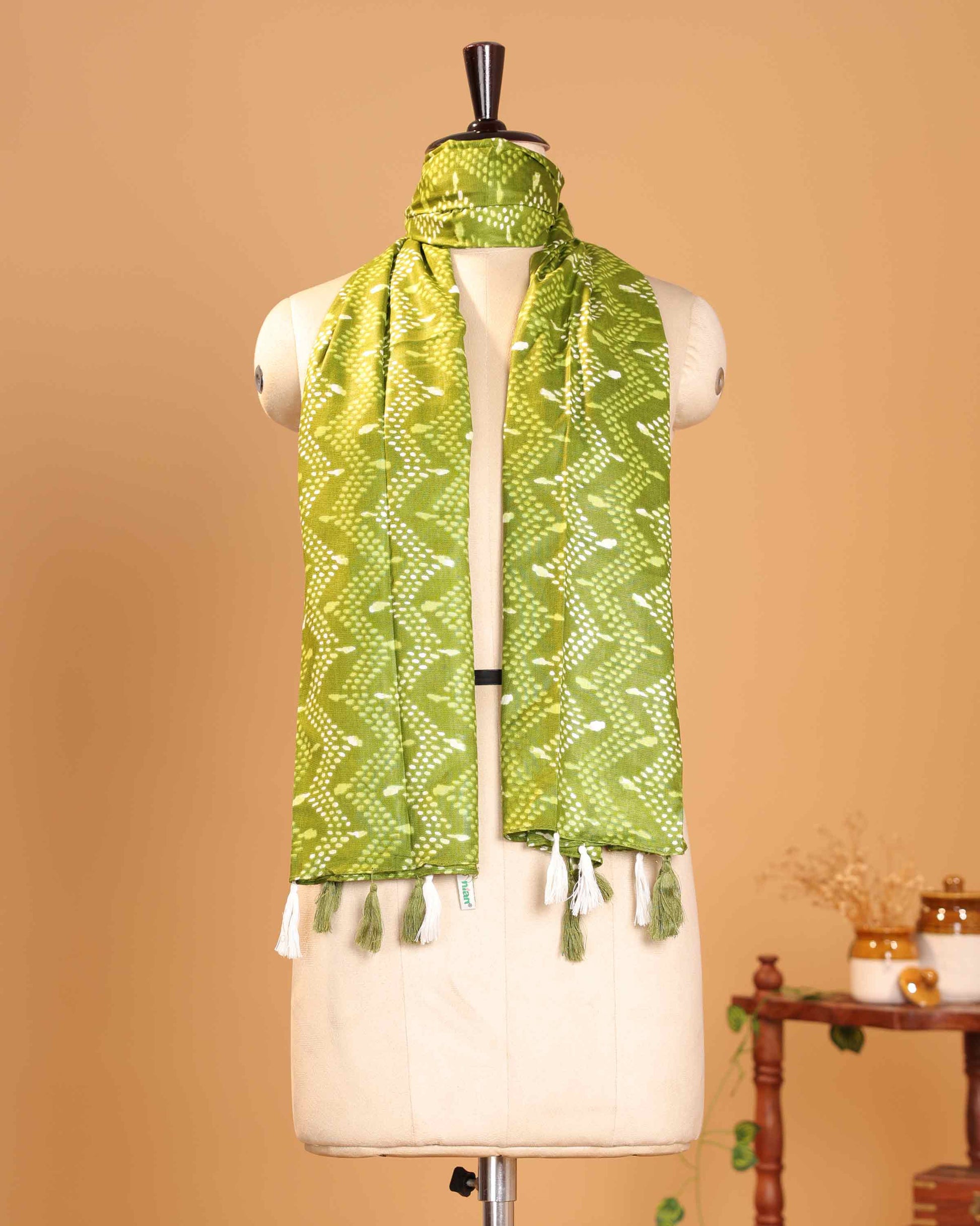 Elegant Women’s Dupatta with Traditional Bandhani Inspired Pattern Design and Tasselled Ends - Green