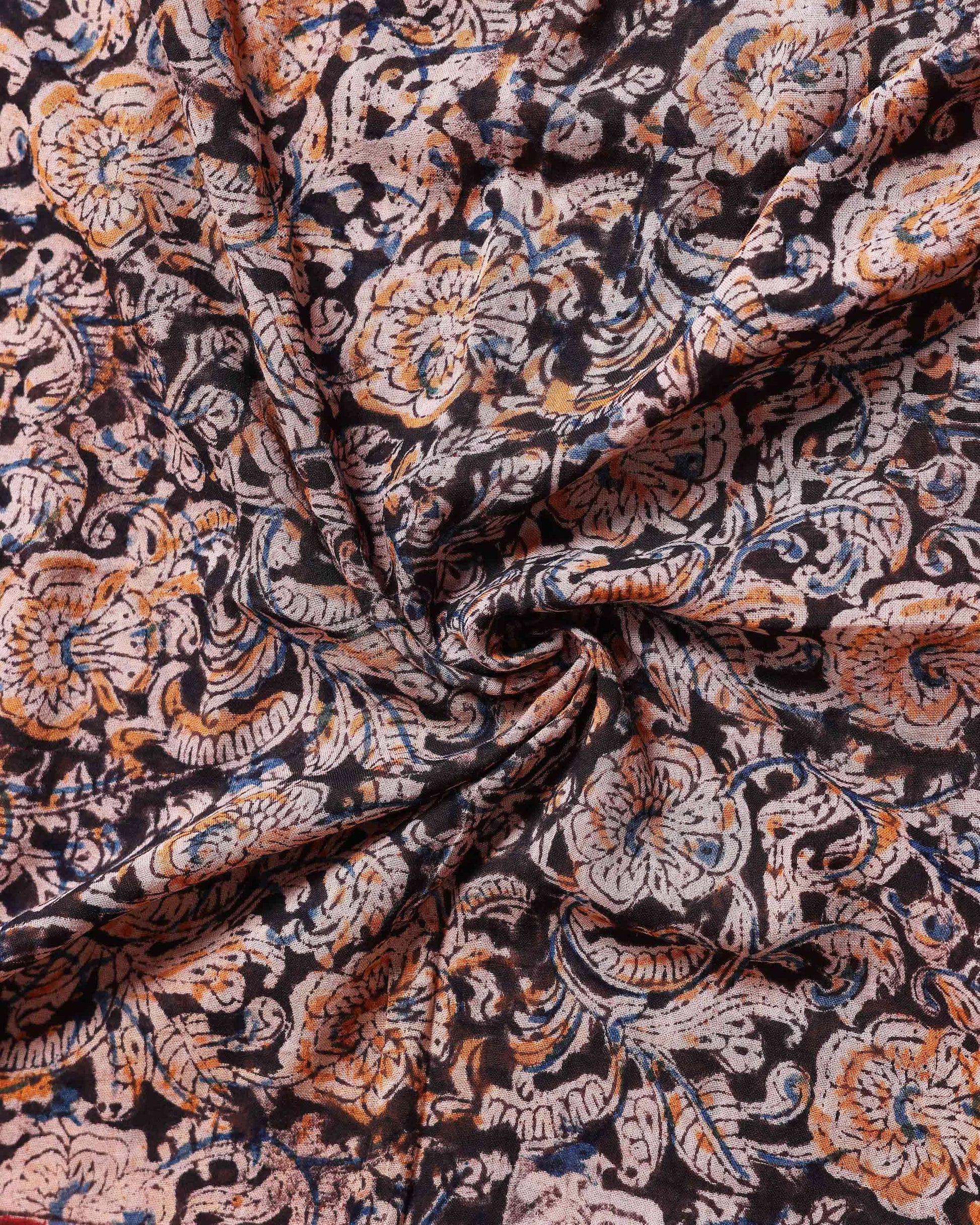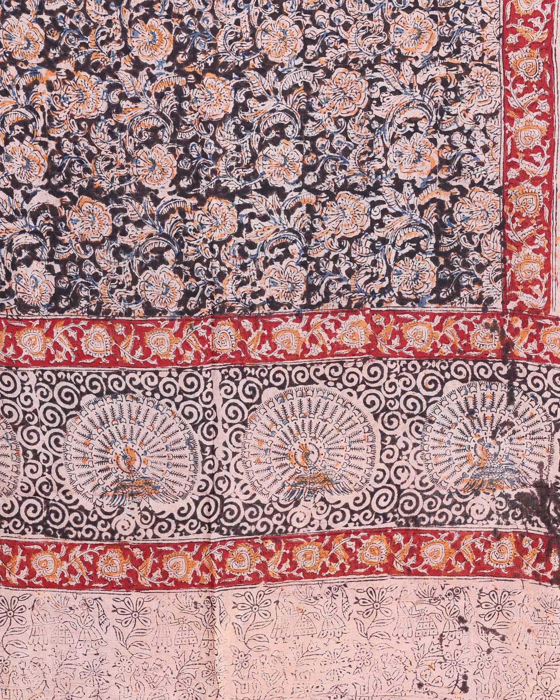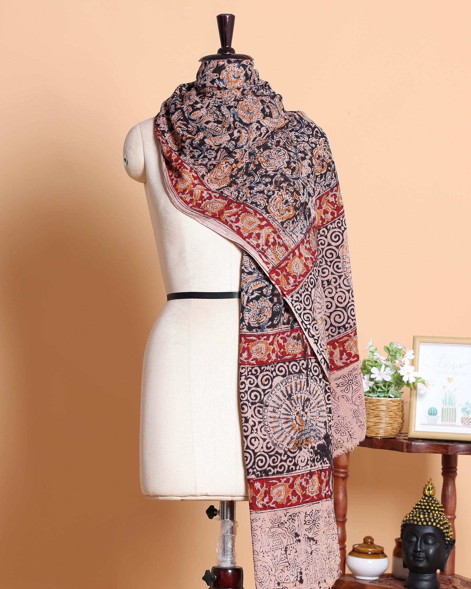 - This traditional Kalamkari block print cotton dupatta intricate floral and peacock motifs in a vibrant, multi color design
