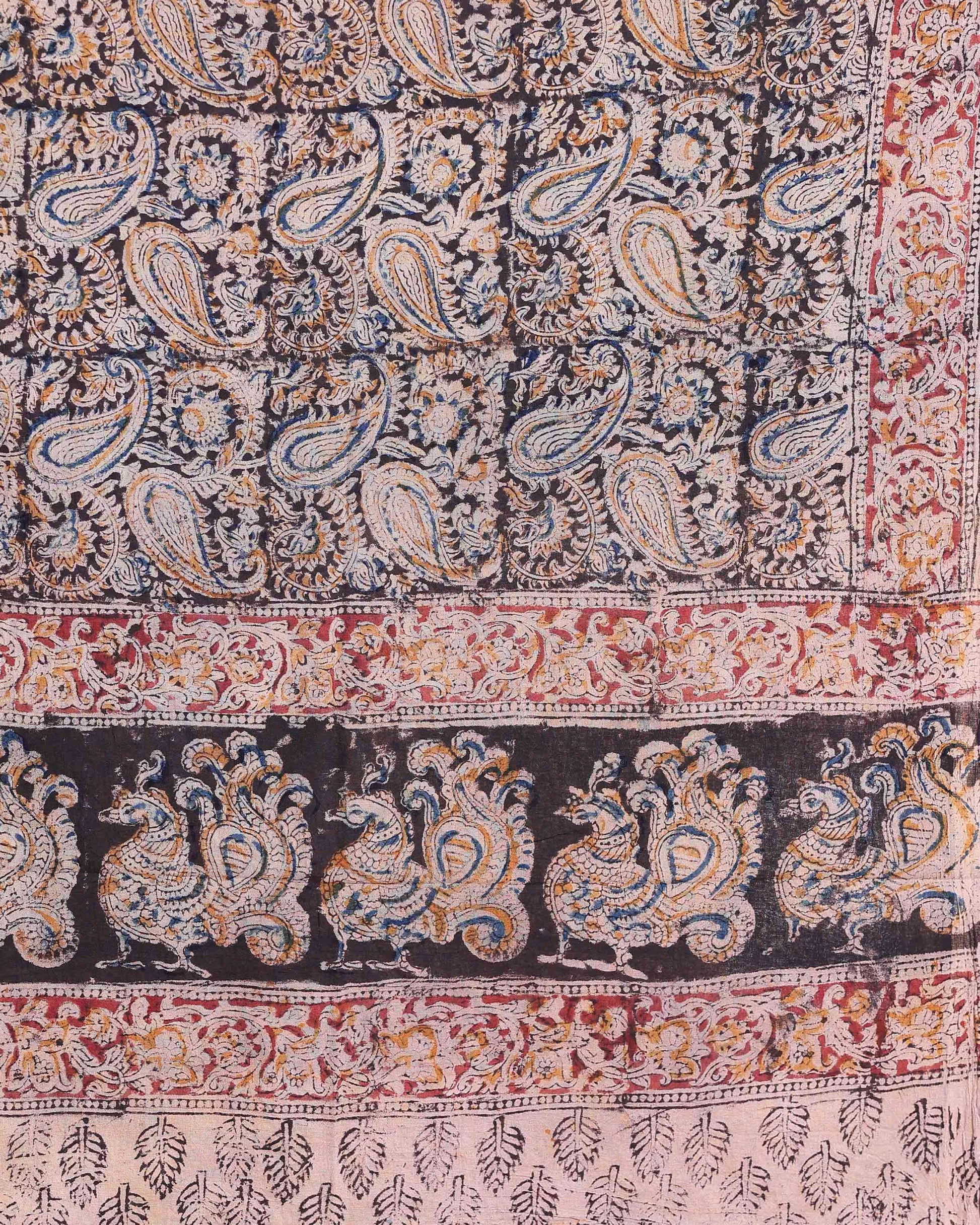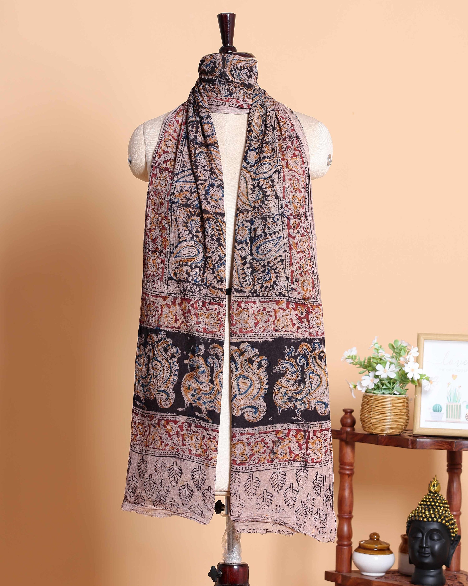 Elegant Women’s Kalamkari Printed Cotton Dupatta with Paisley and Traditional Peacock Motifs - Multi