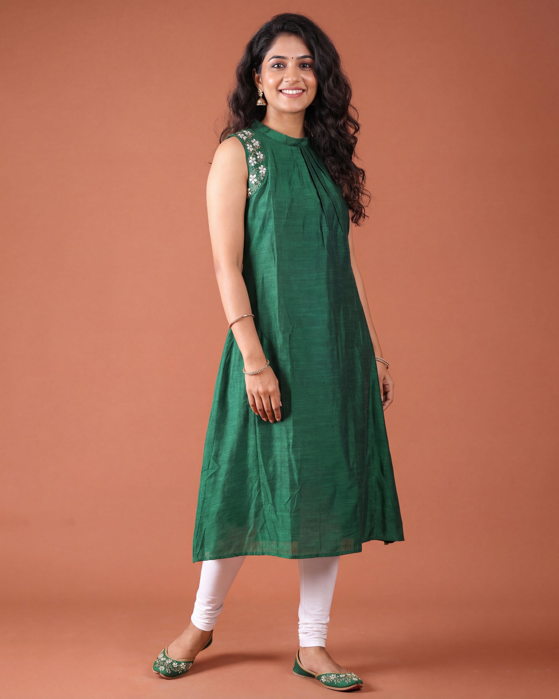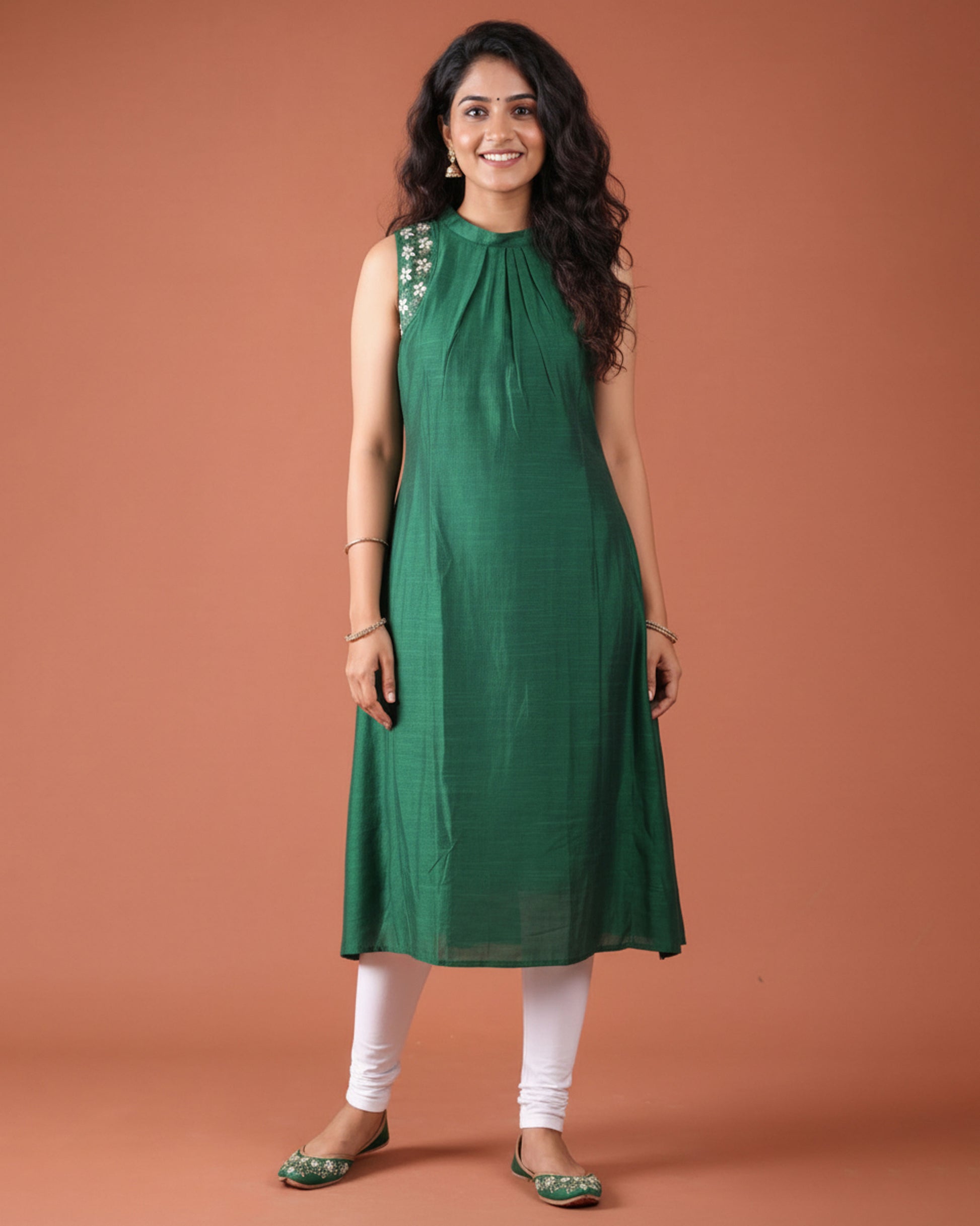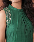 Elegant Women’s Sleeveless A-Line Kurta with Embroidered Shoulder - Green