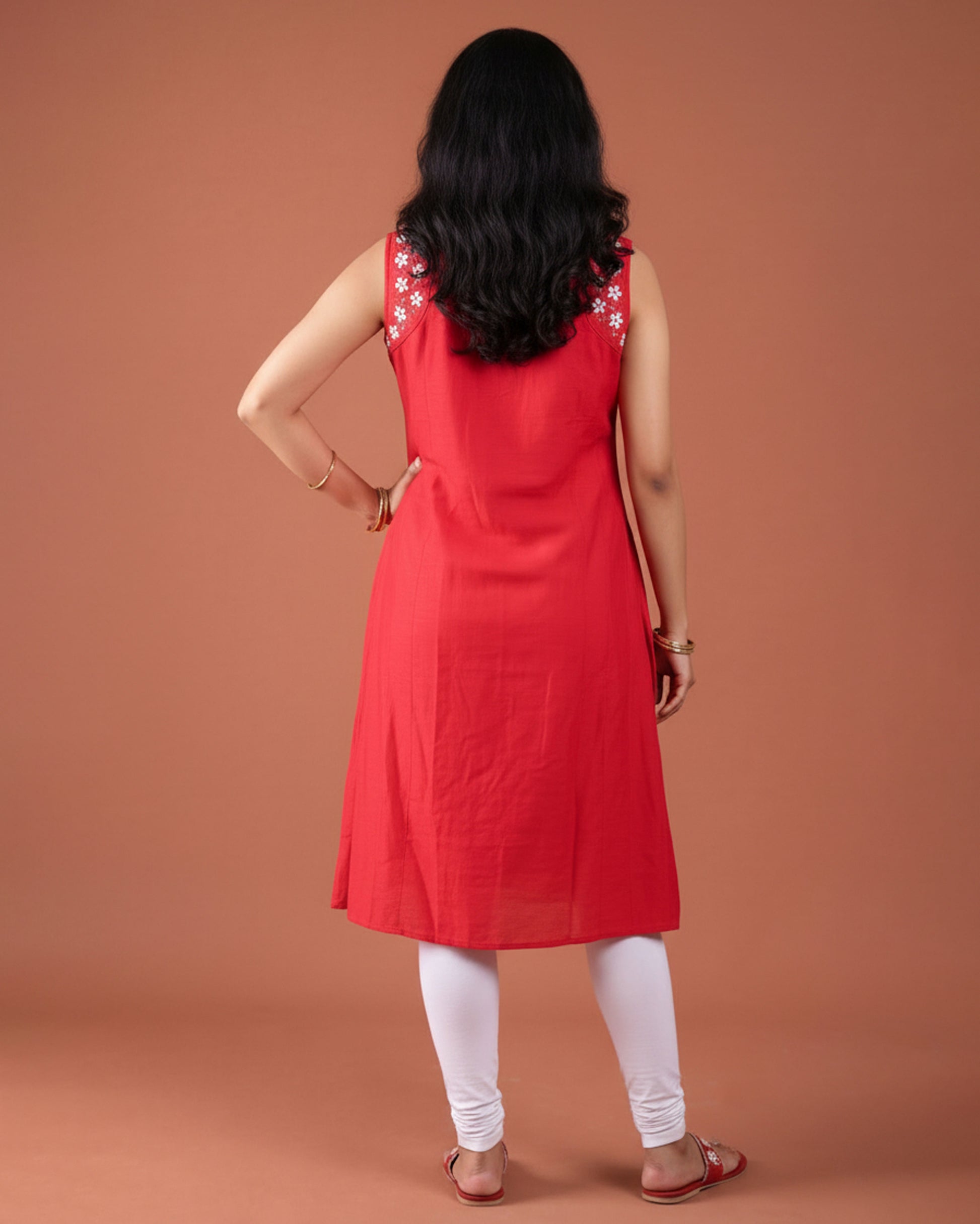 Elegant Women’s Sleeveless A-Line Kurta with Embroidered Shoulder - Red