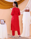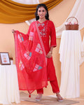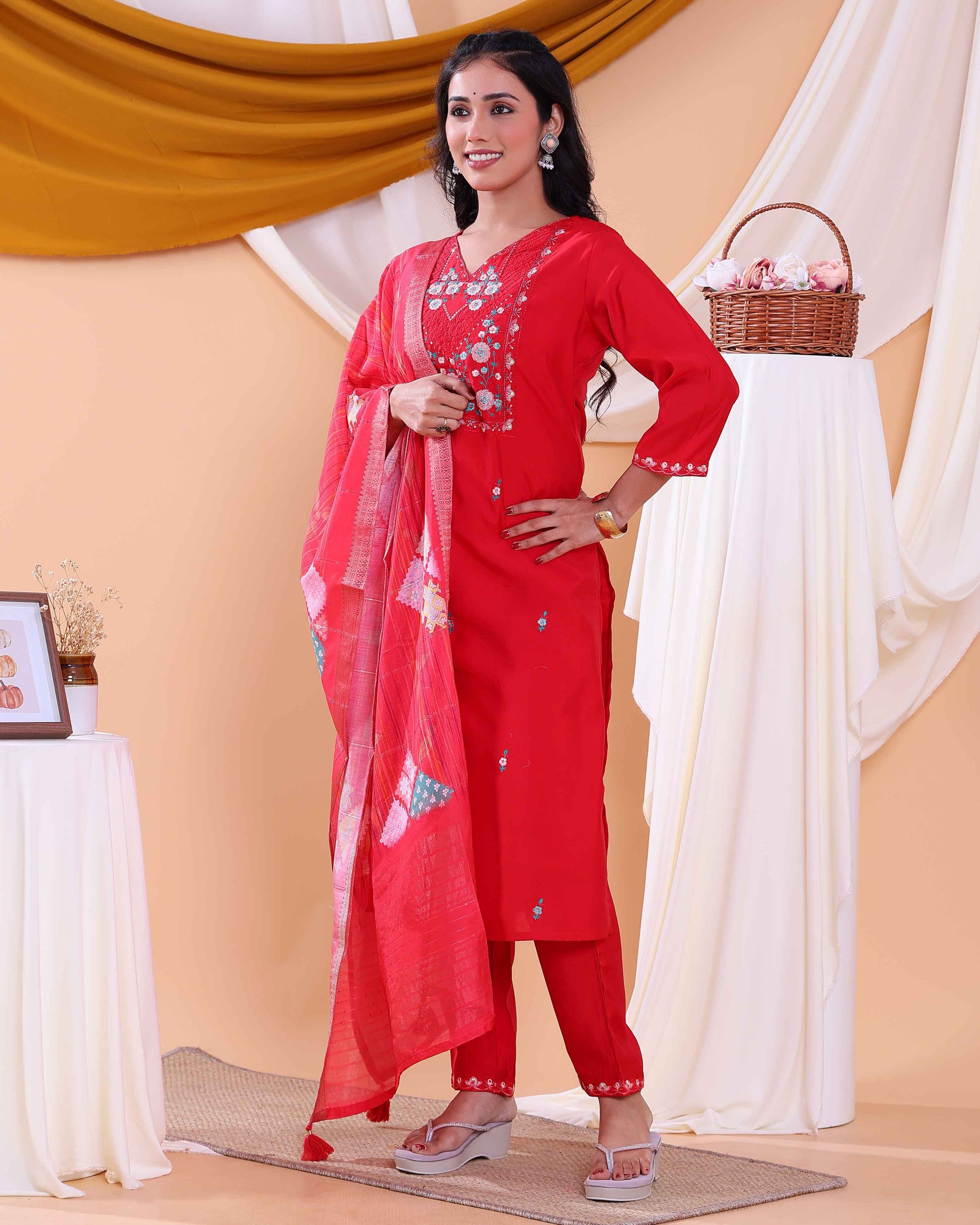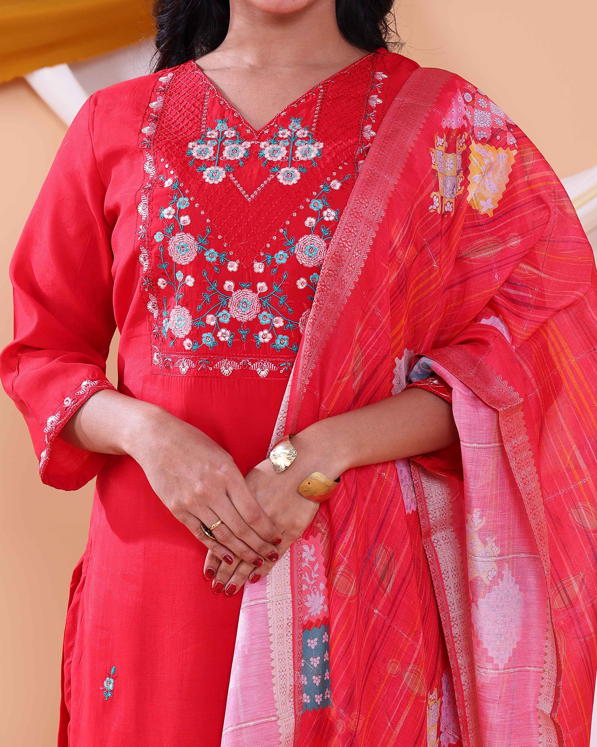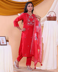 Elegant Women's Floral Embroidered Straight Fit Kurta Set with Dupatta - Red
