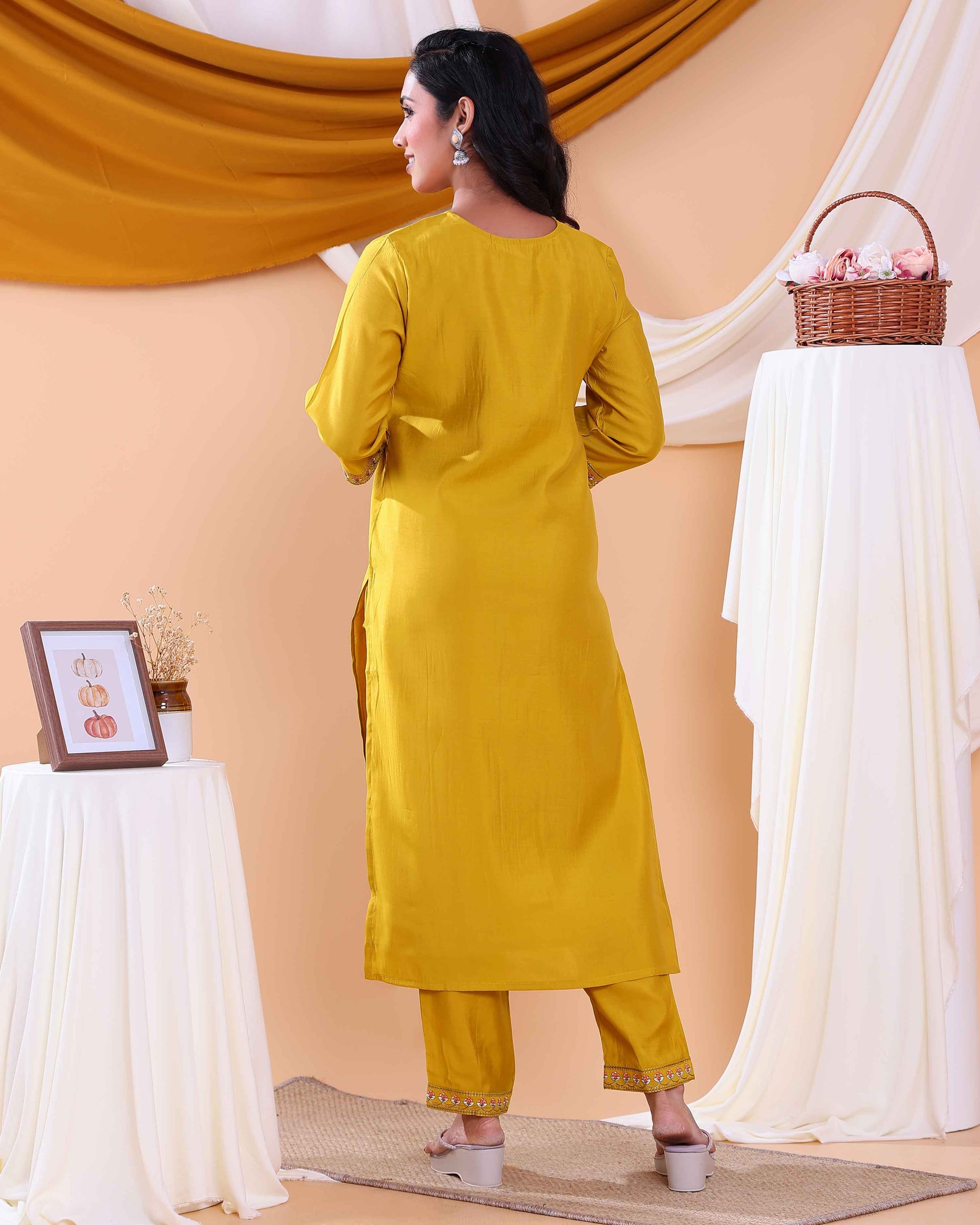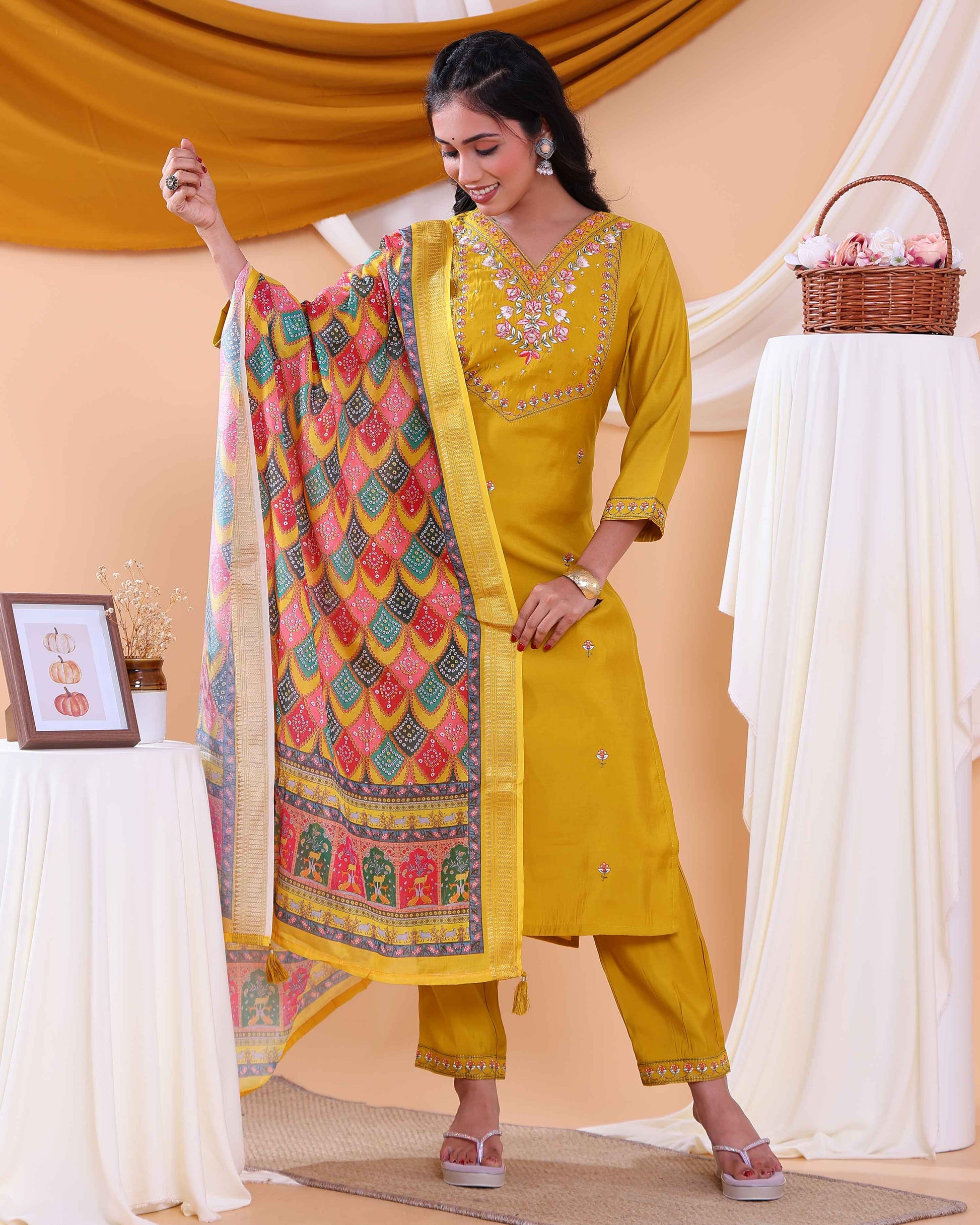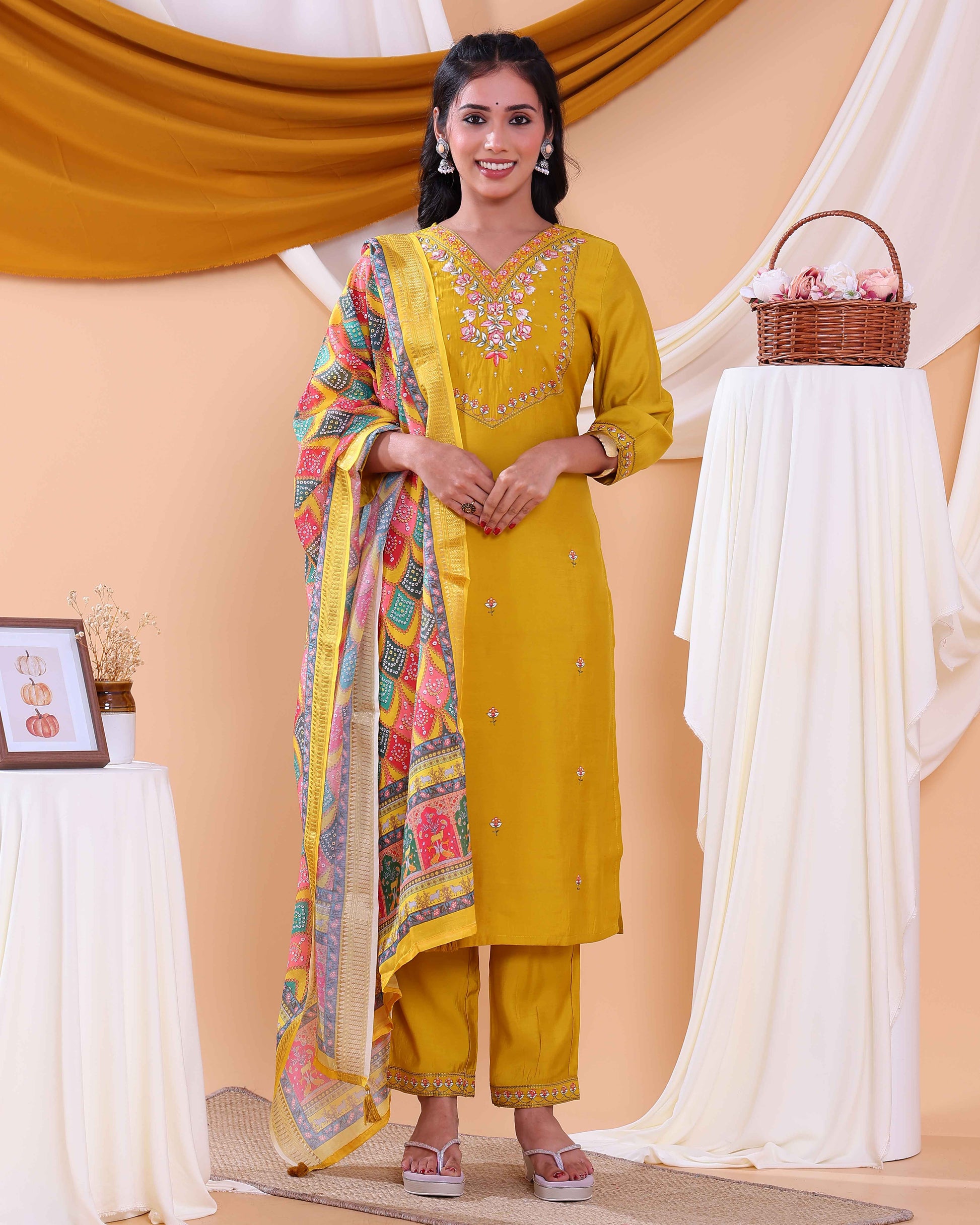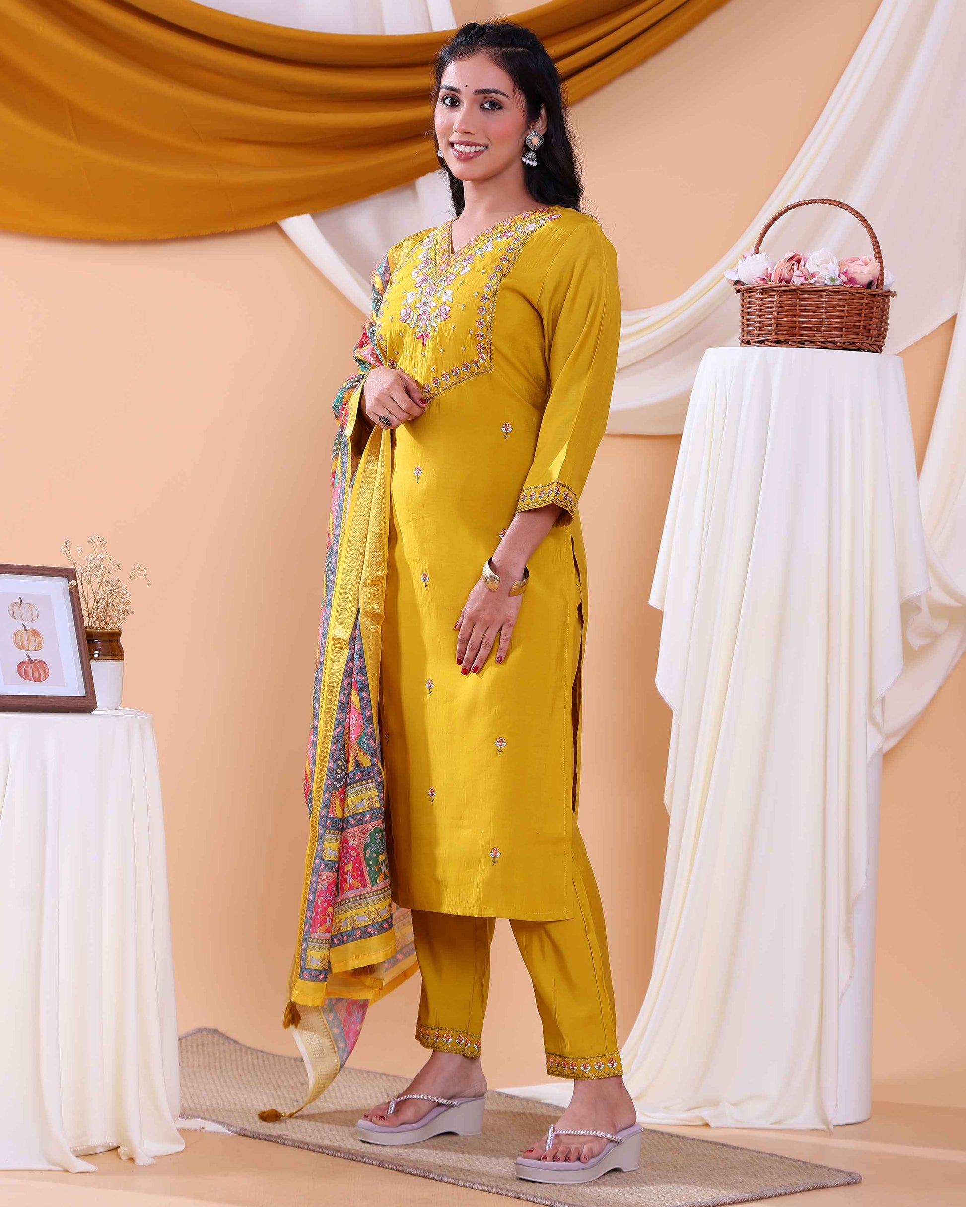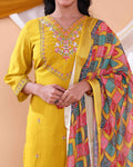 Elegant Women's Kurta Set with Floral Embroidery and Printed Dupatta - Yellow