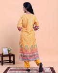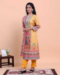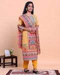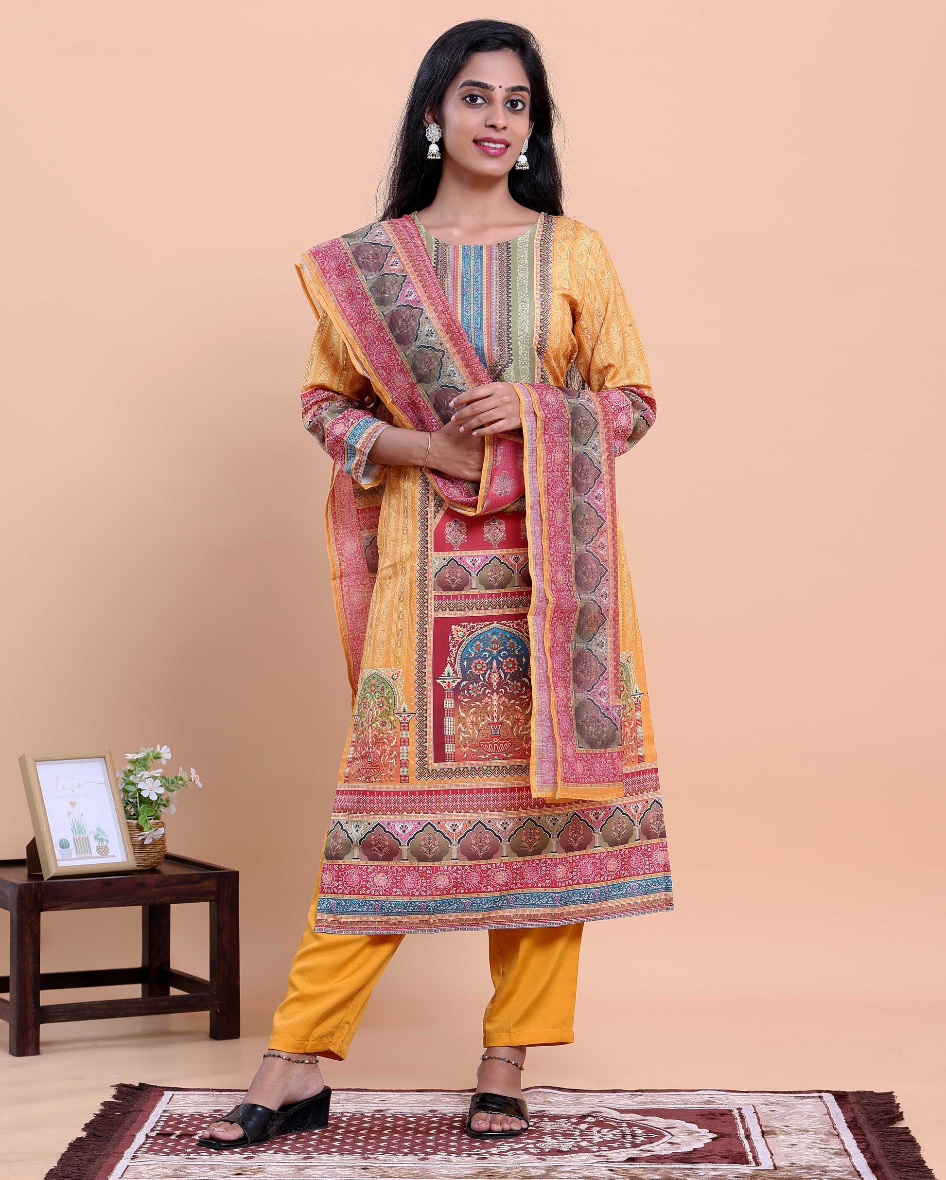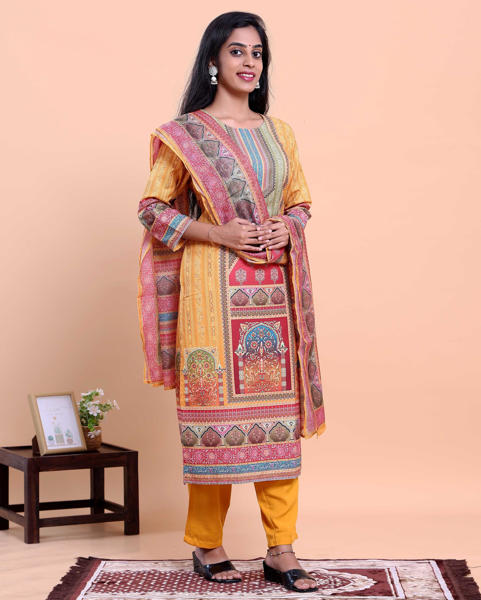 - Elevate your ethnic style with this stunning mustard yellow readymade salwar suit, intricate digital prints and a vibrant, contrasting dupatta.