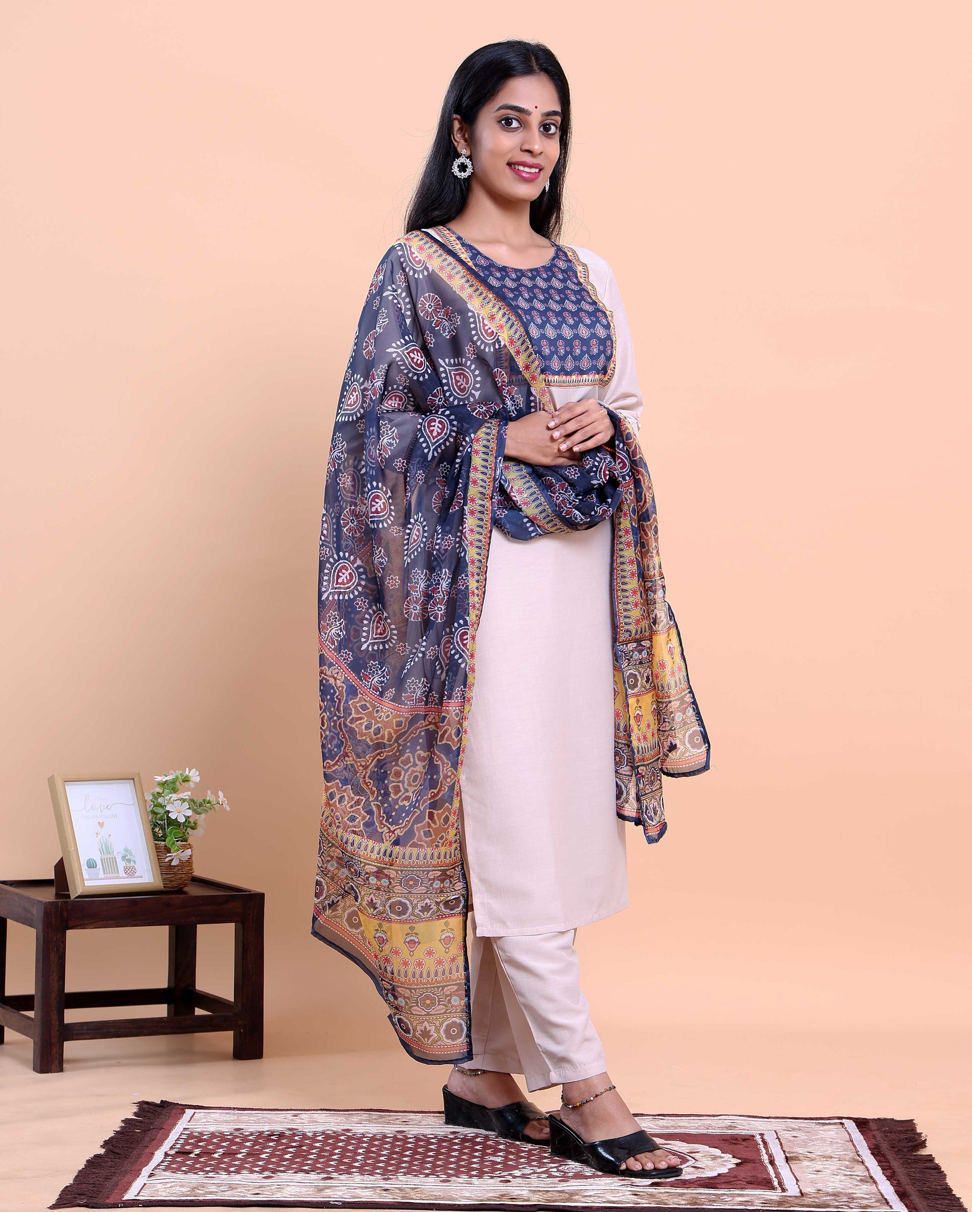 - Elevate your ethnic wardrobe with this elegant readymade salwar suit set, a solid-colored kurta and pants paired with a stunning, multi-hued printed dupatta
