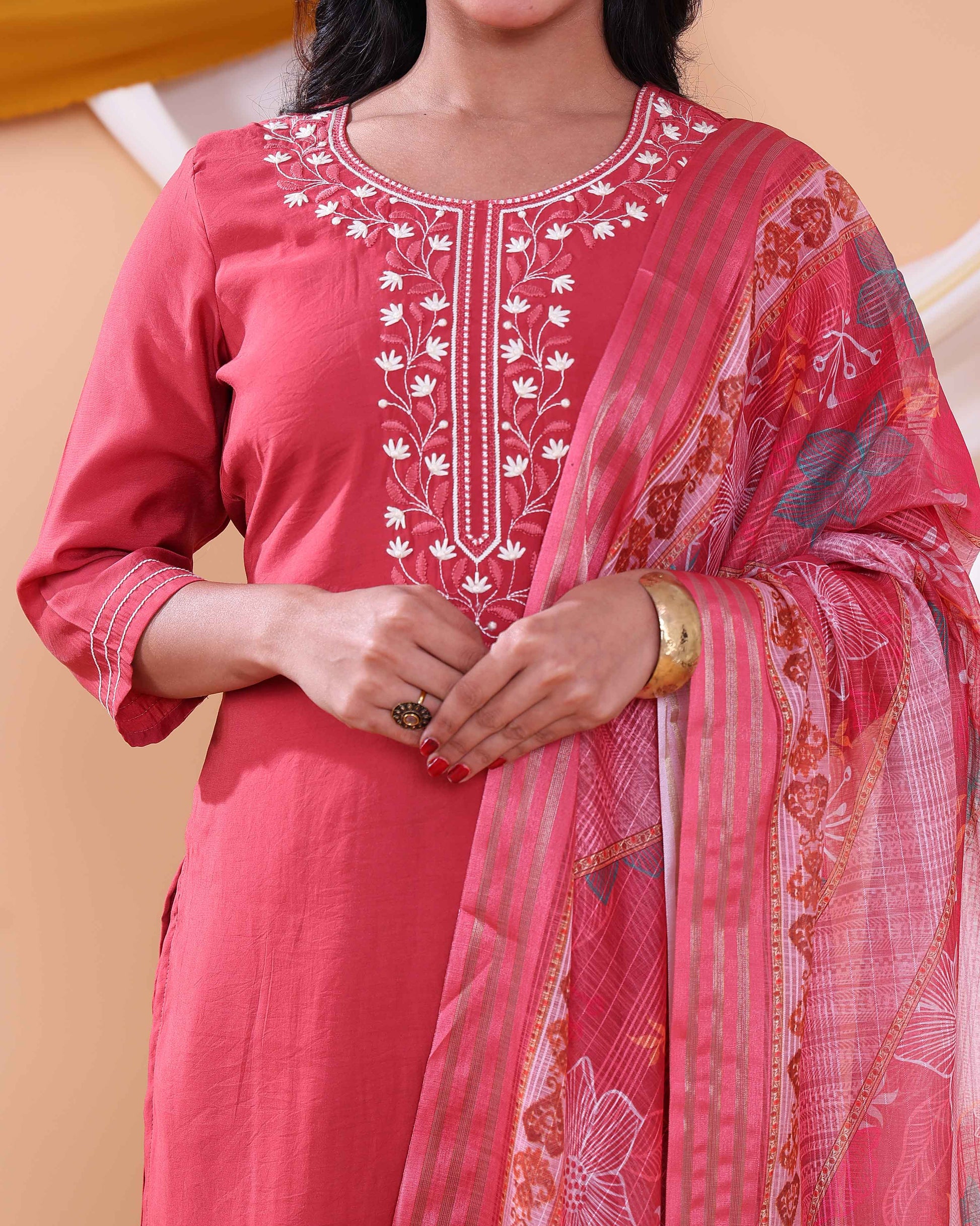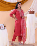 Elegant Women's Straight Kurta with Pants and Jacquard Printed Dupatta - Red