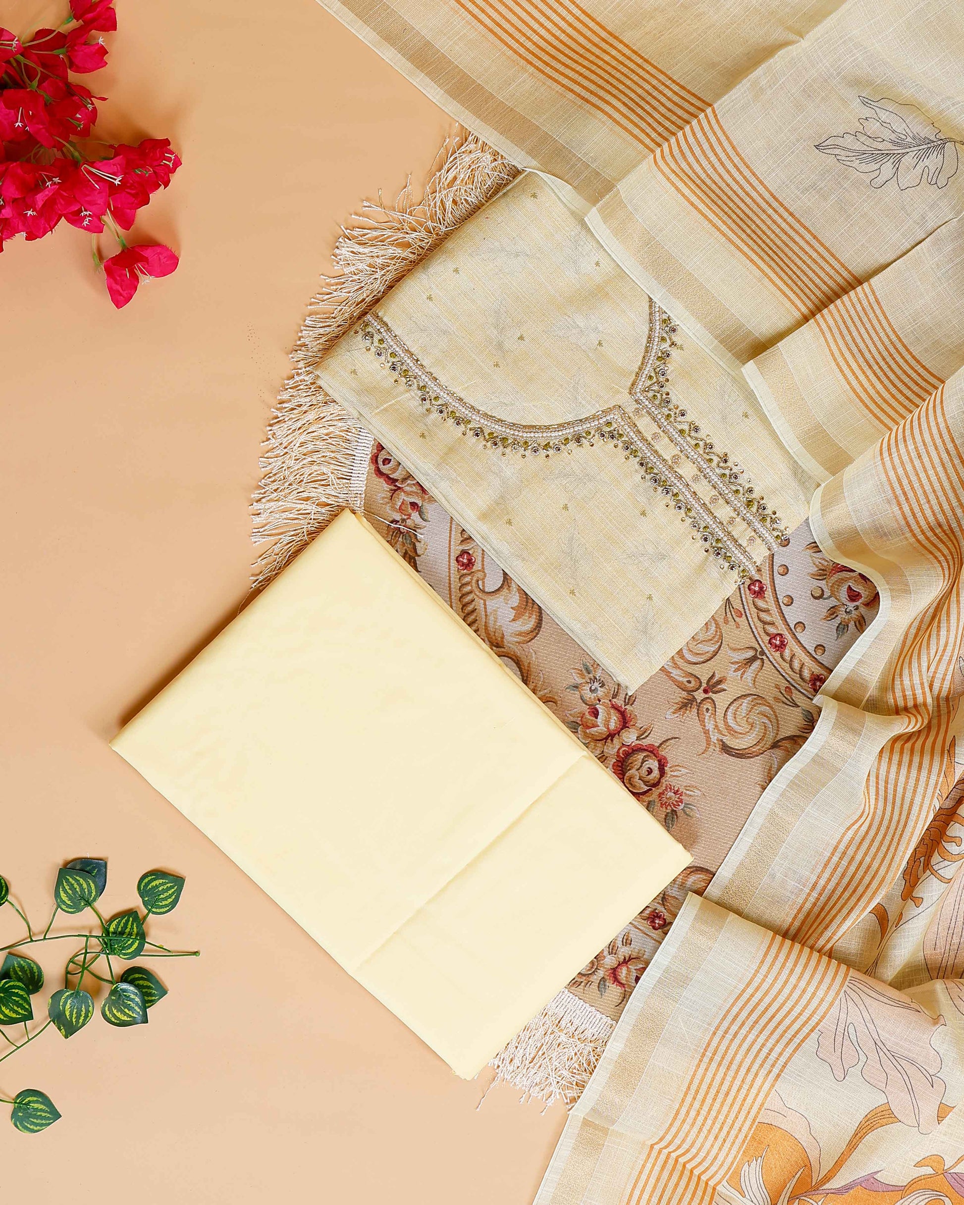 Women's Embroidered Neckline Unstitched Salwar Suit Material with Dupatta - Sandal