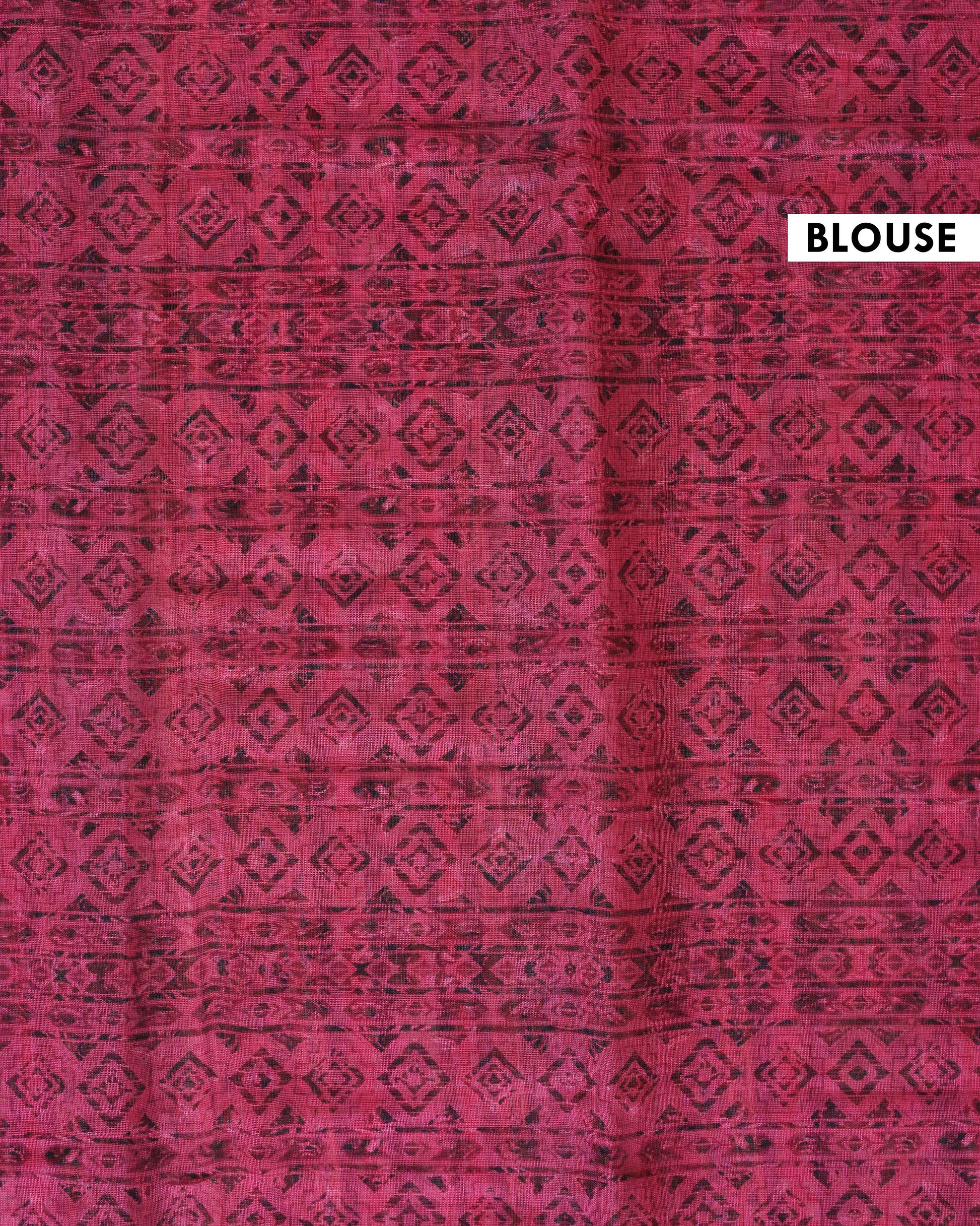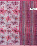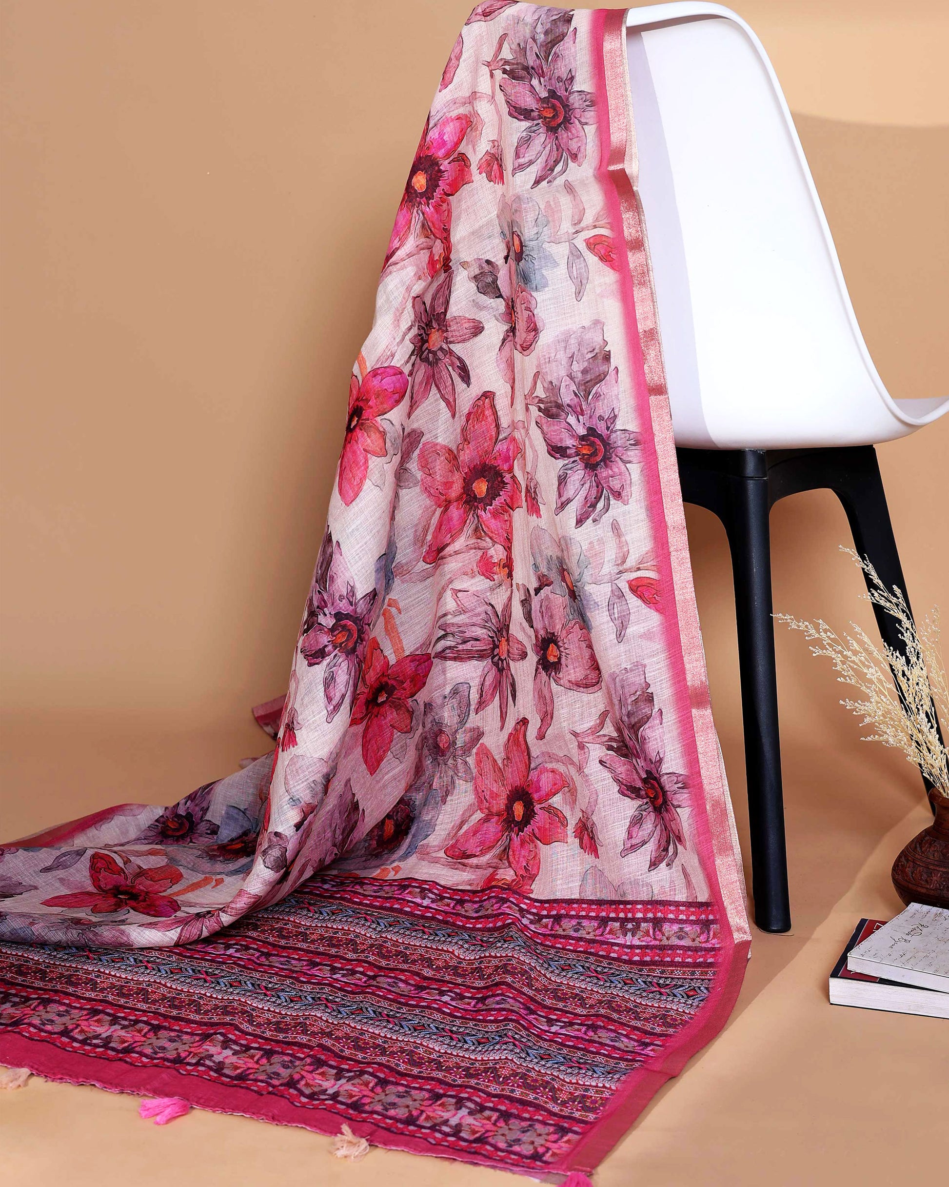 - This captivating linen cotton saree a beautiful floral print in shades of pink and purple, with a contrasting patterned border