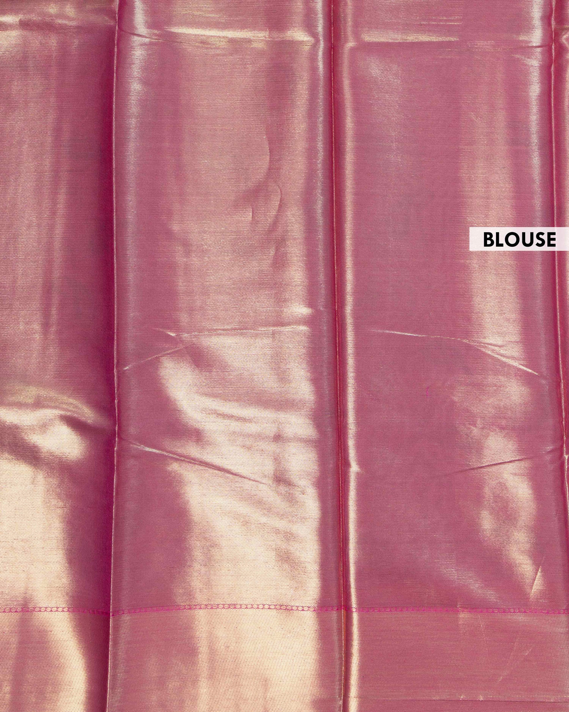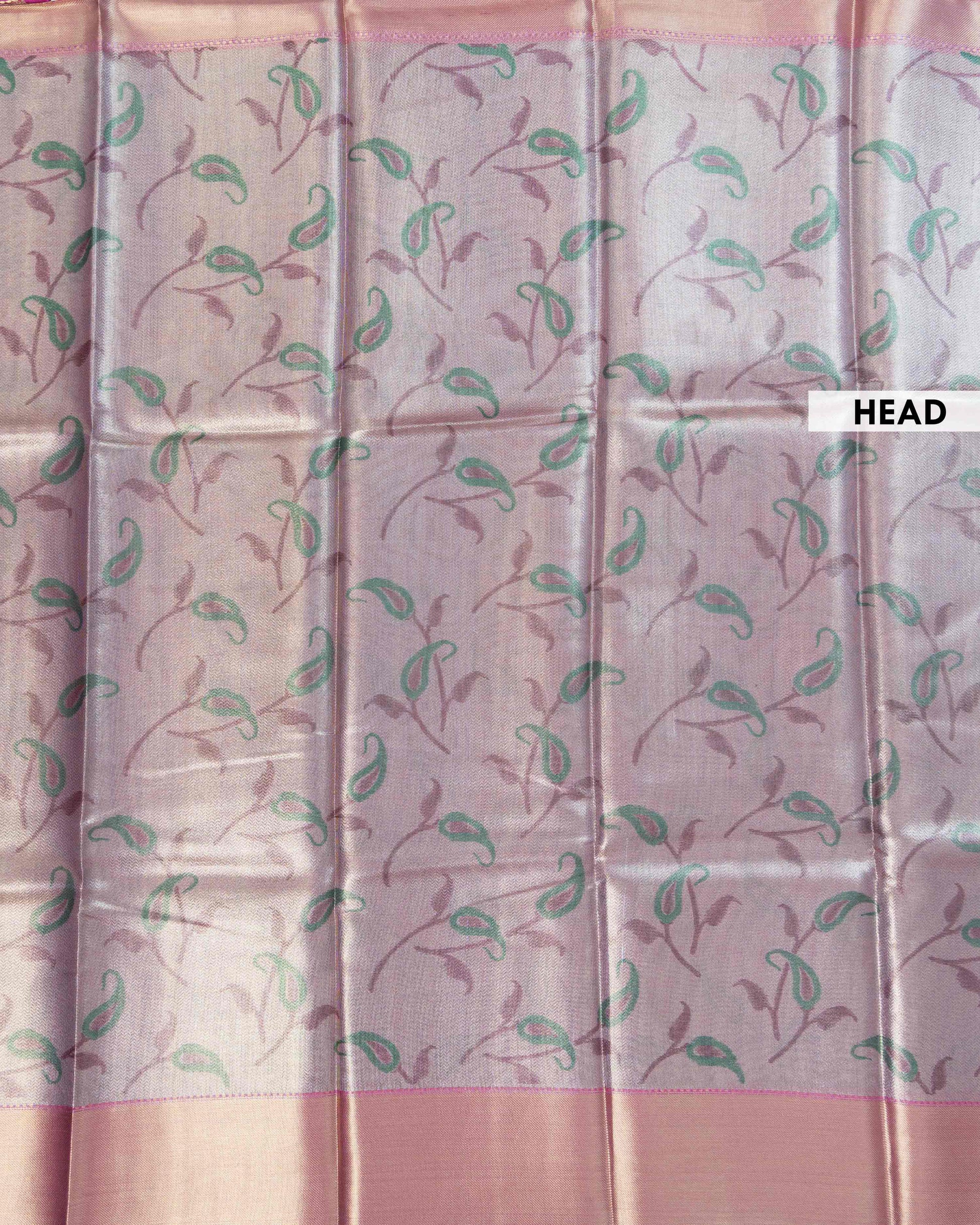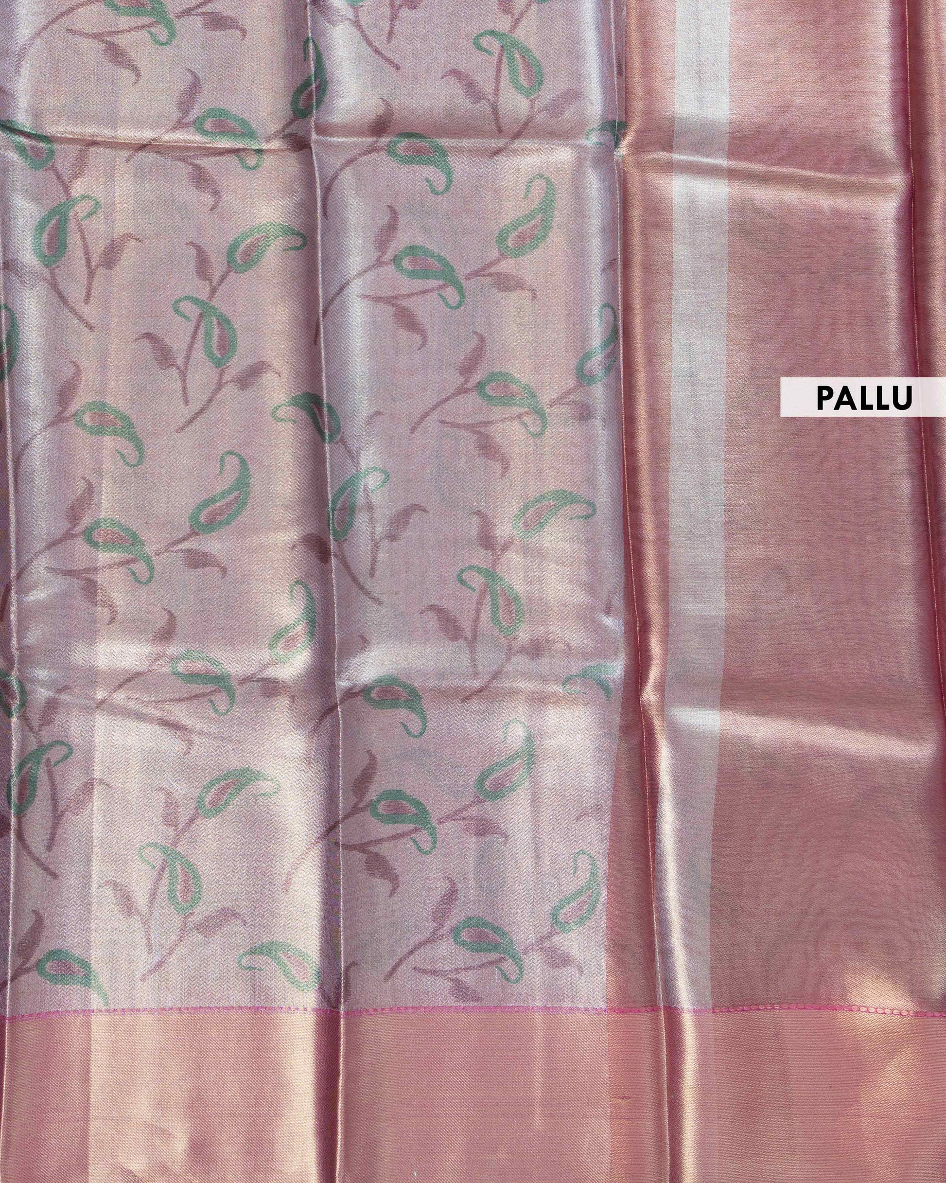 - This is a light pink tissue silk saree with a woven paisley pattern on the body and a contrasting solid pink border.