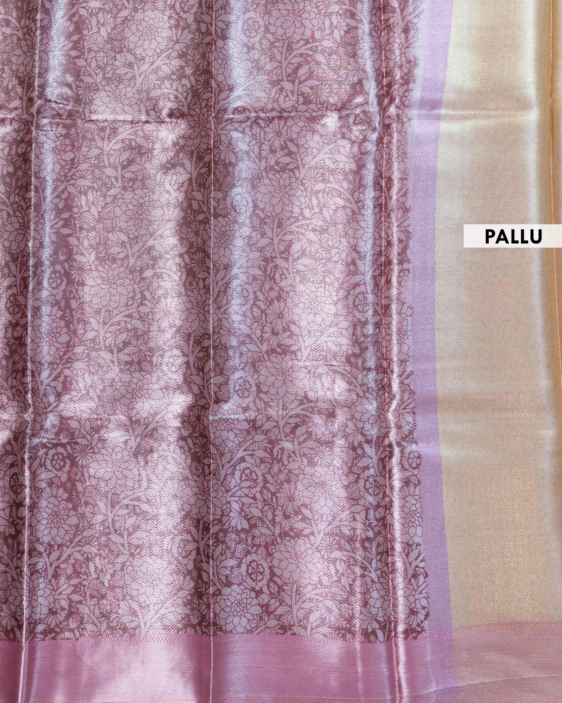 - This elegant tissue saree a rich maroon-gold body with intricate floral motifs, beautifully complemented by a contrasting pink border.