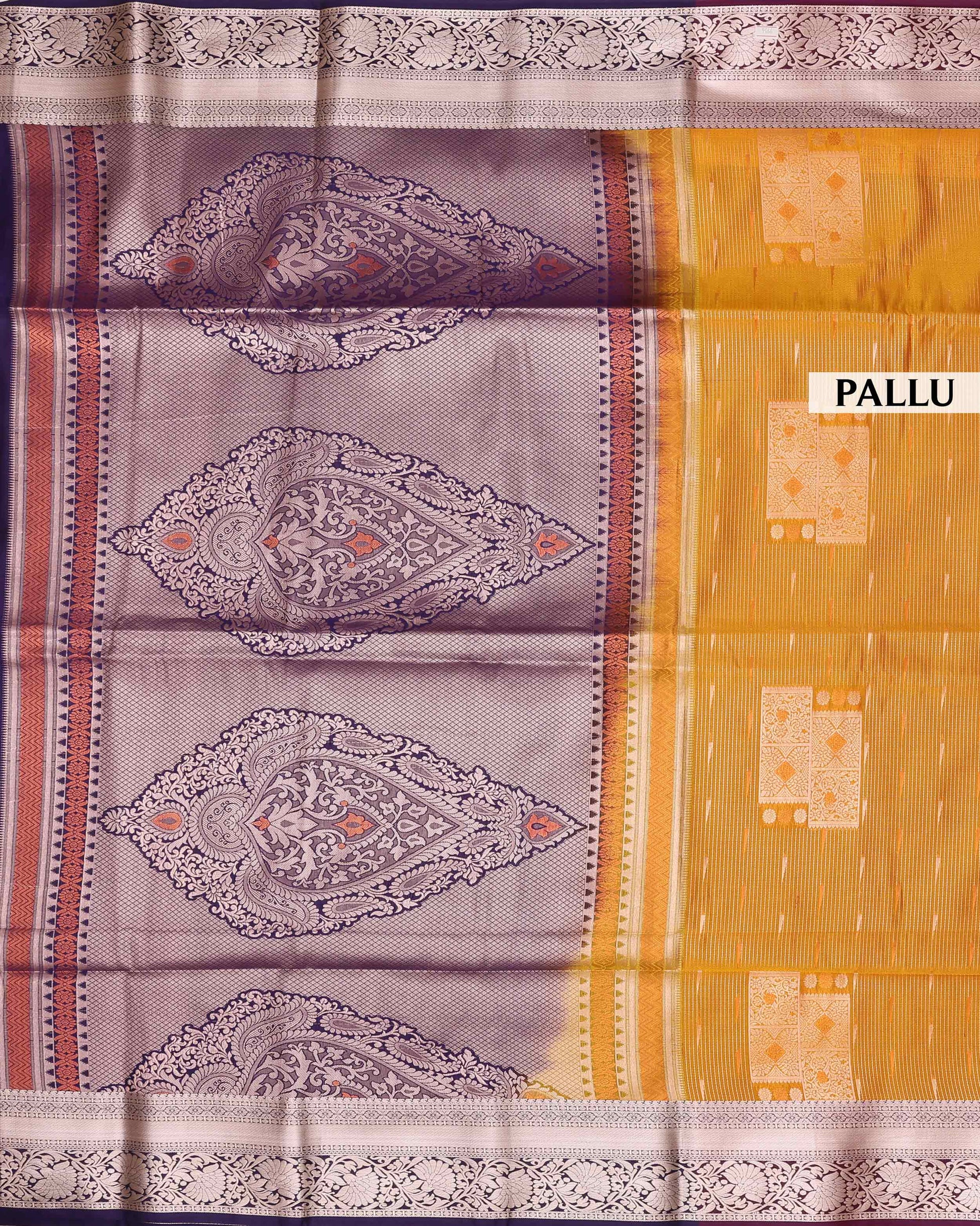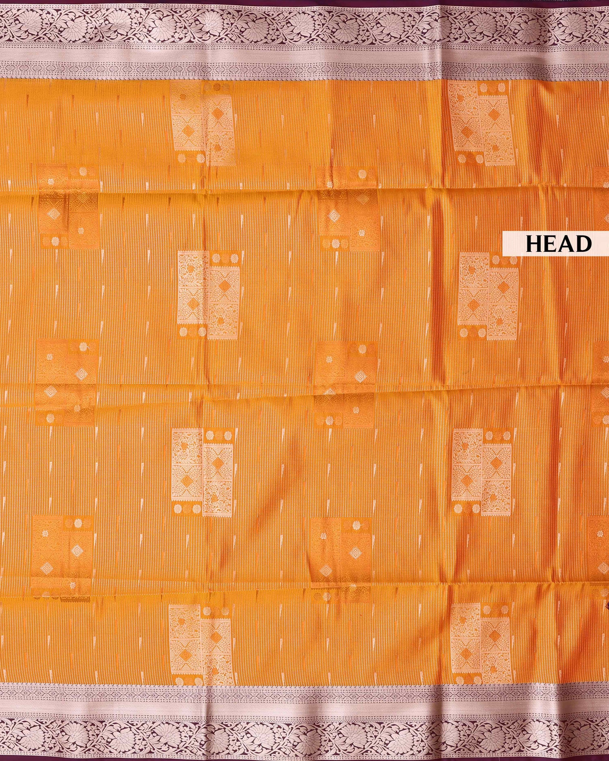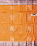 - This vibrant orange soft silk saree intricate gold zari work with delicate white diamond and vertical stripe patterns.