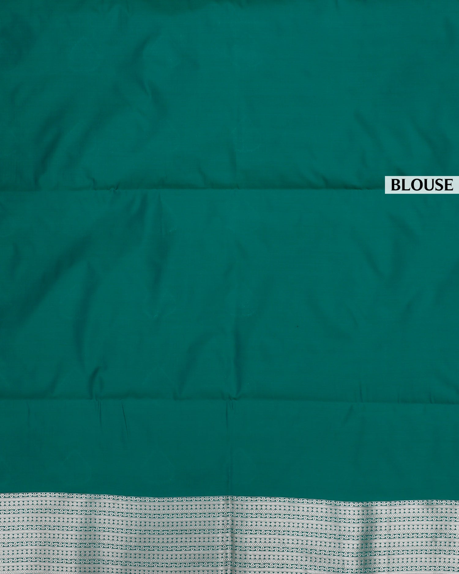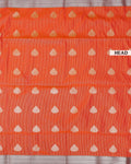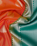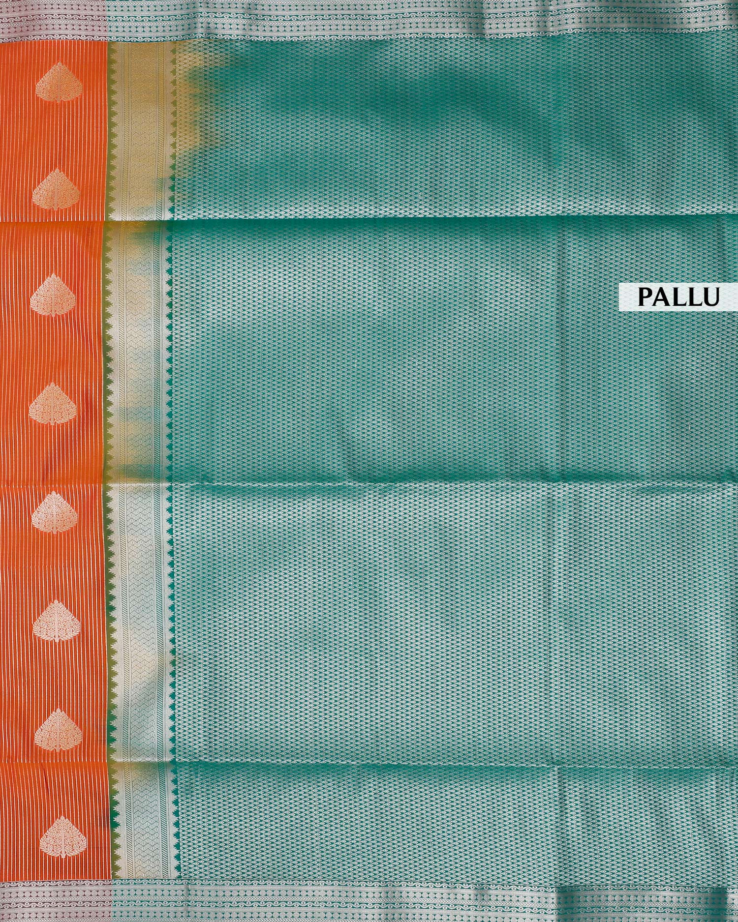 - Drape yourself in elegance with this vibrant reddish-orange soft silk saree, intricate silver zari leaf motifs and a contrasting teal border with geometric patterns.