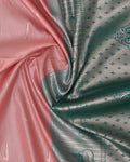 - This elegant soft silk saree in a delicate pink a contrasting green border, perfect for a graceful look.
