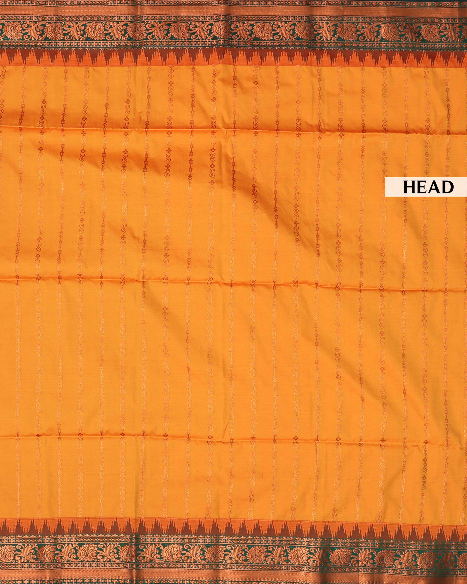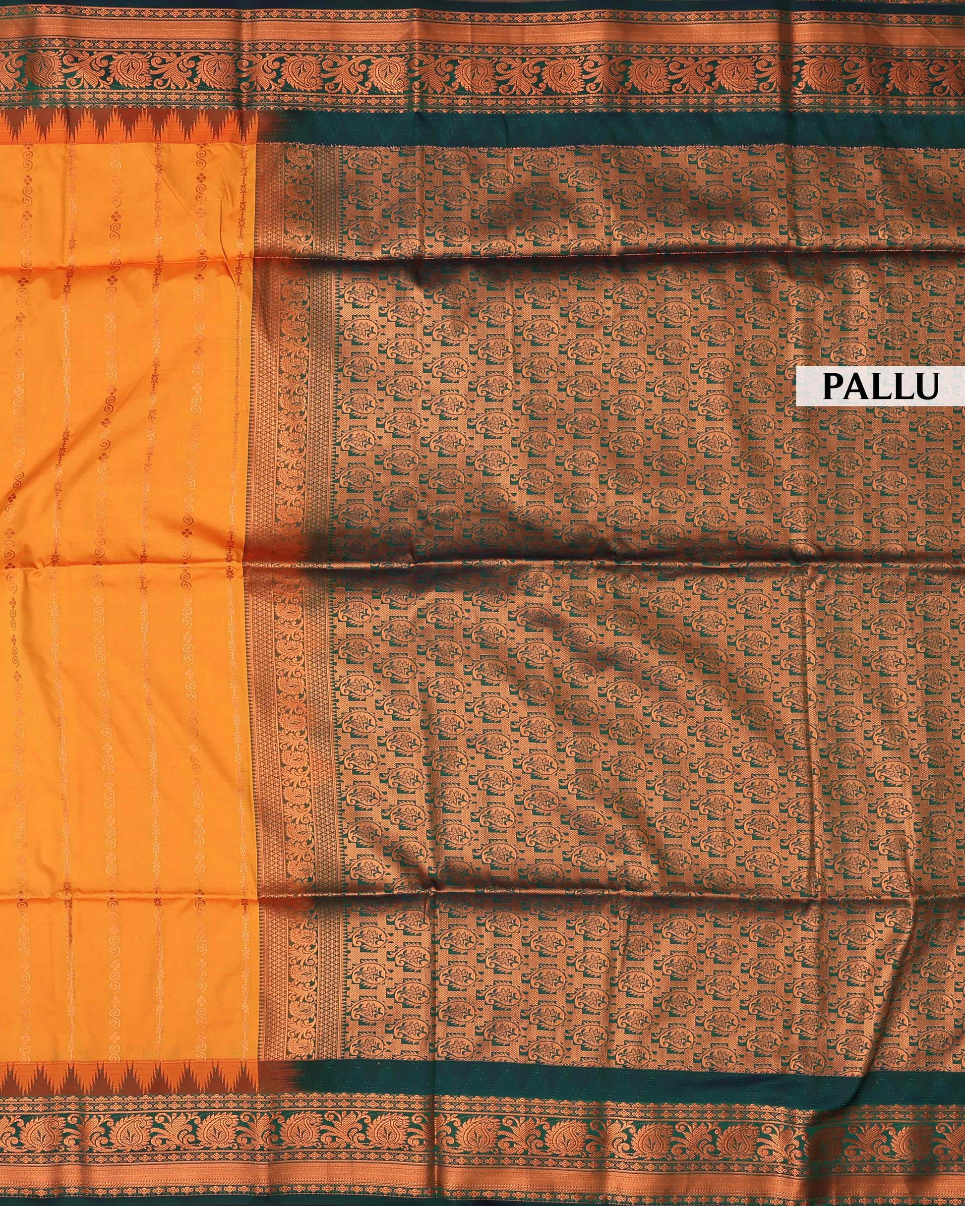 - This elegant soft silk saree in a beautiful mustard yellow intricate zari work and a striped design.
