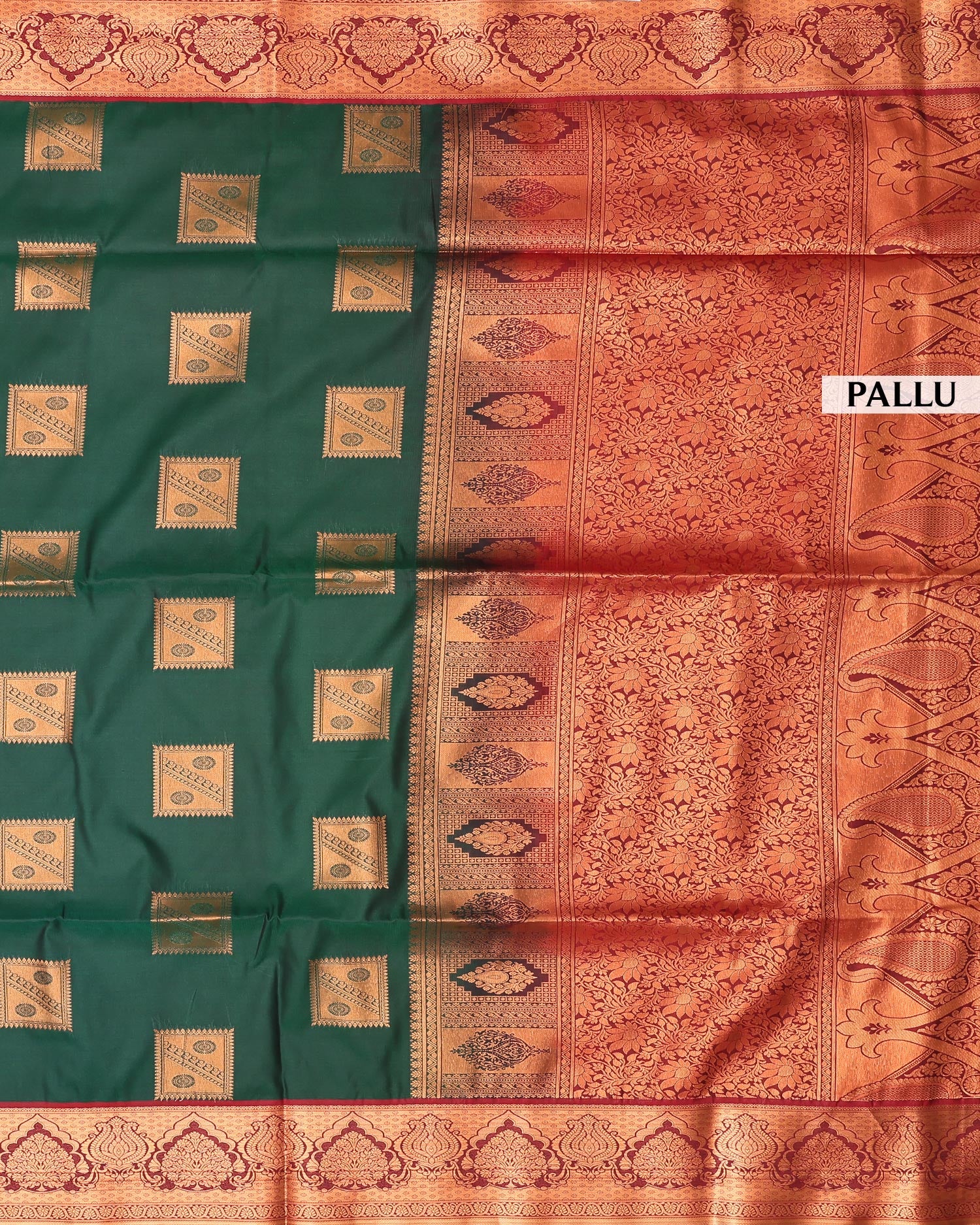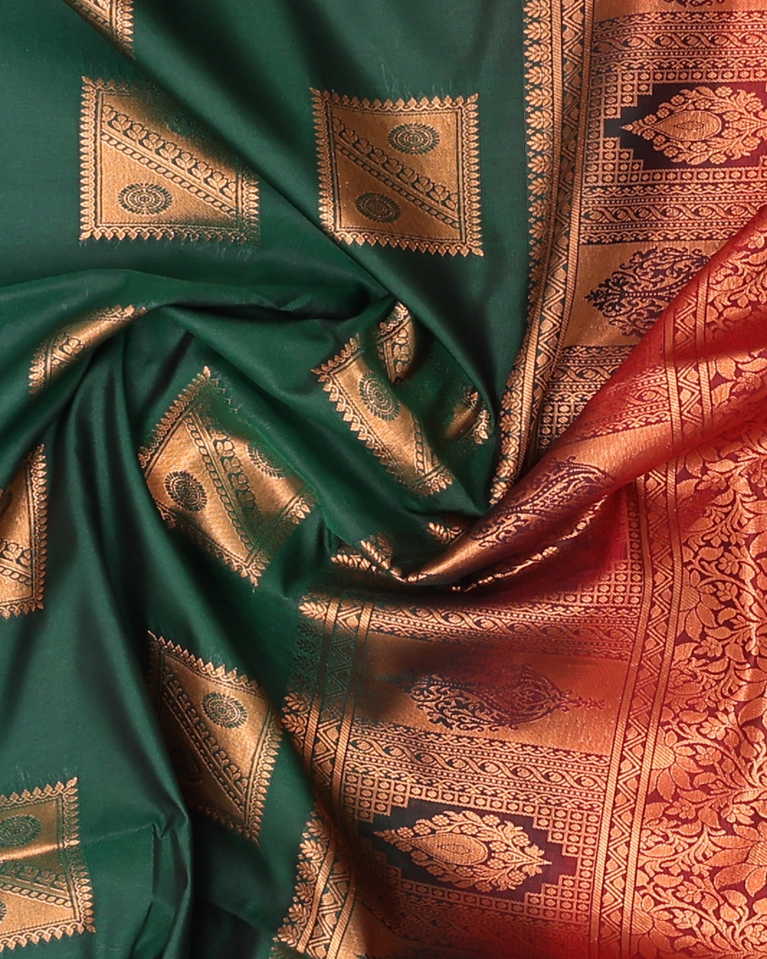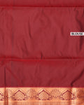 - Drape yourself in elegance with this vibrant reddish-orange soft silk saree, intricate silver zari leaf motifs and a contrasting teal border with geometric patterns.