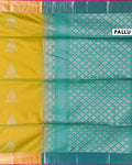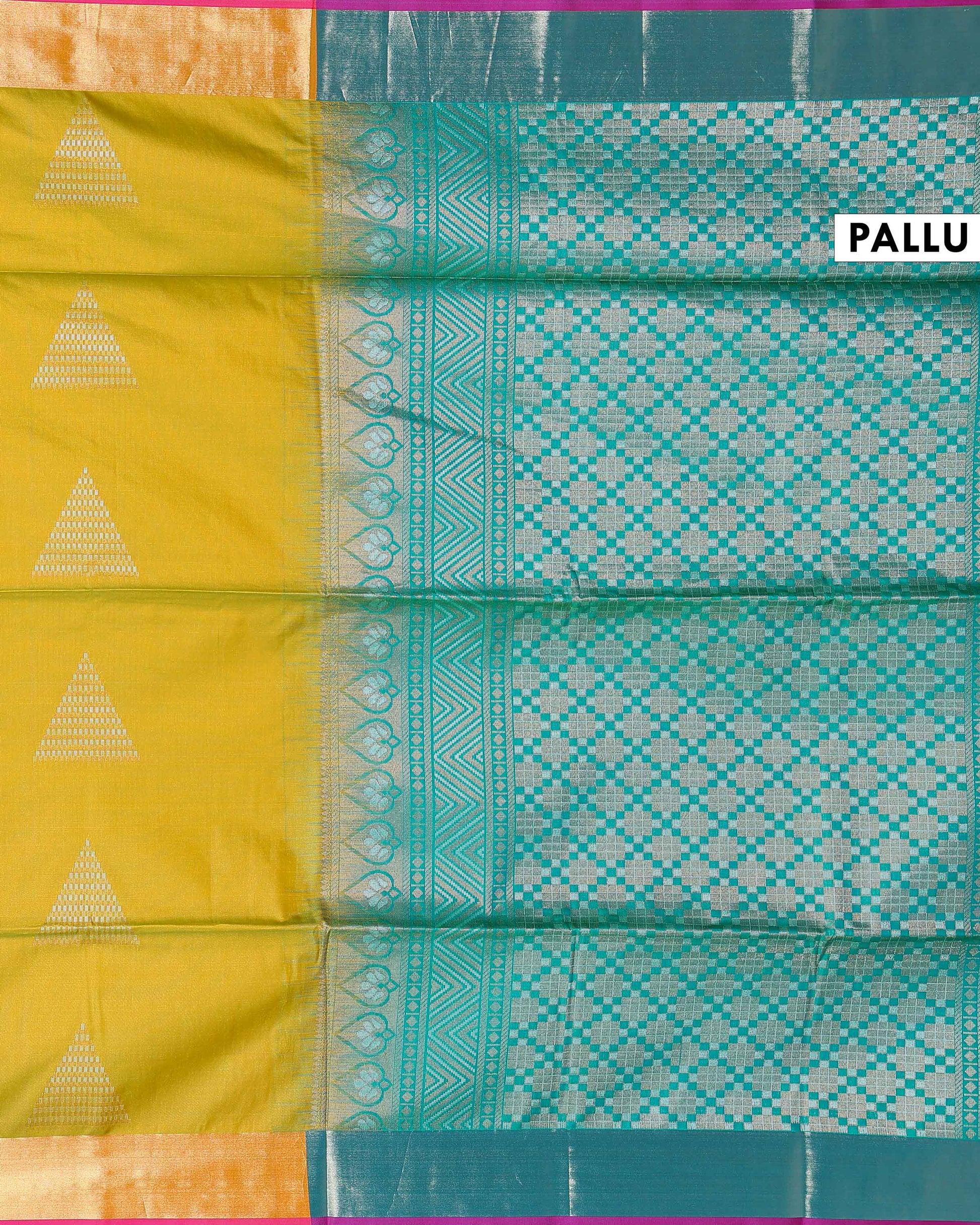 - Elevate your ethnic style with this stunning yellow and green soft silk saree a beautiful zari border and intricate woven designs