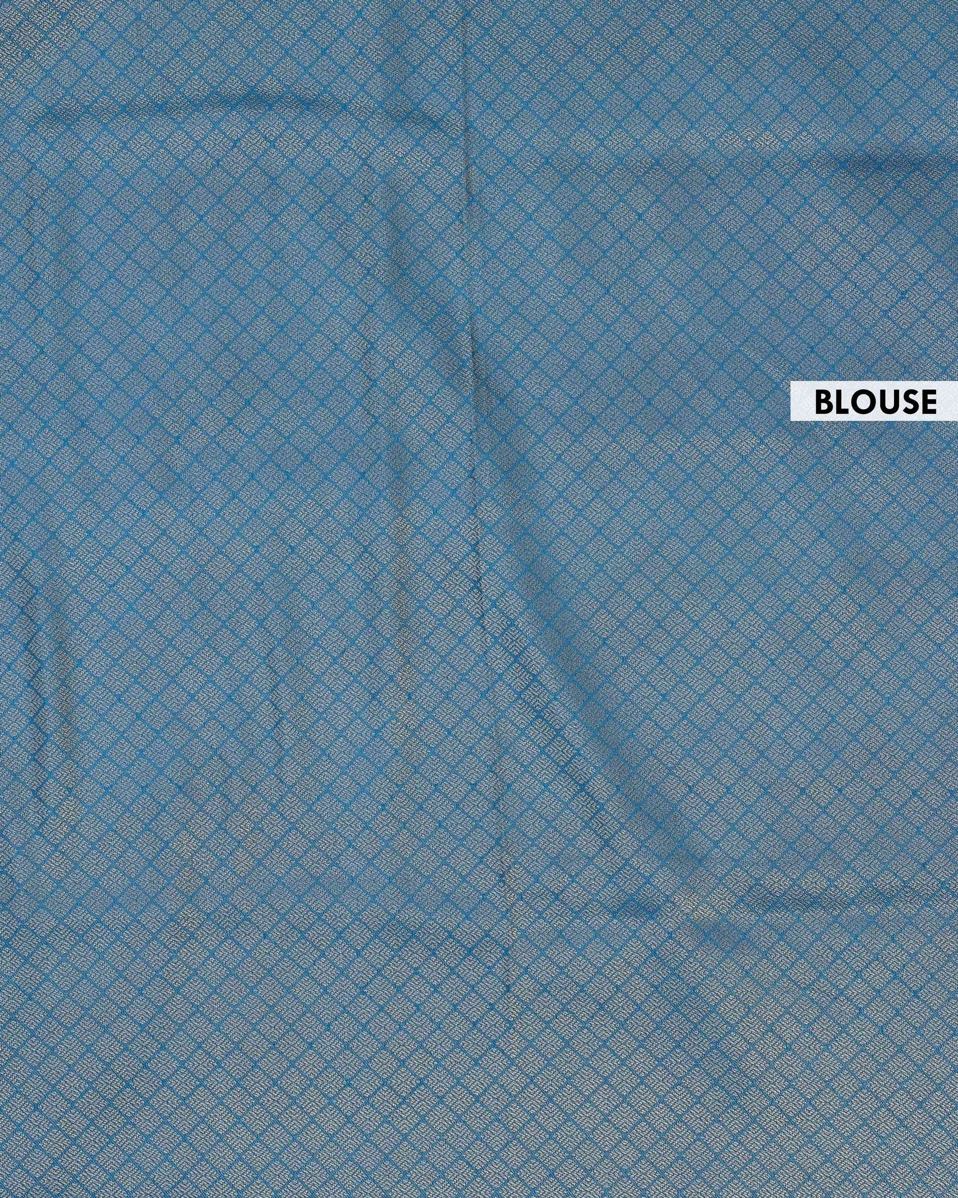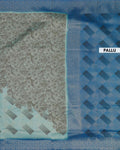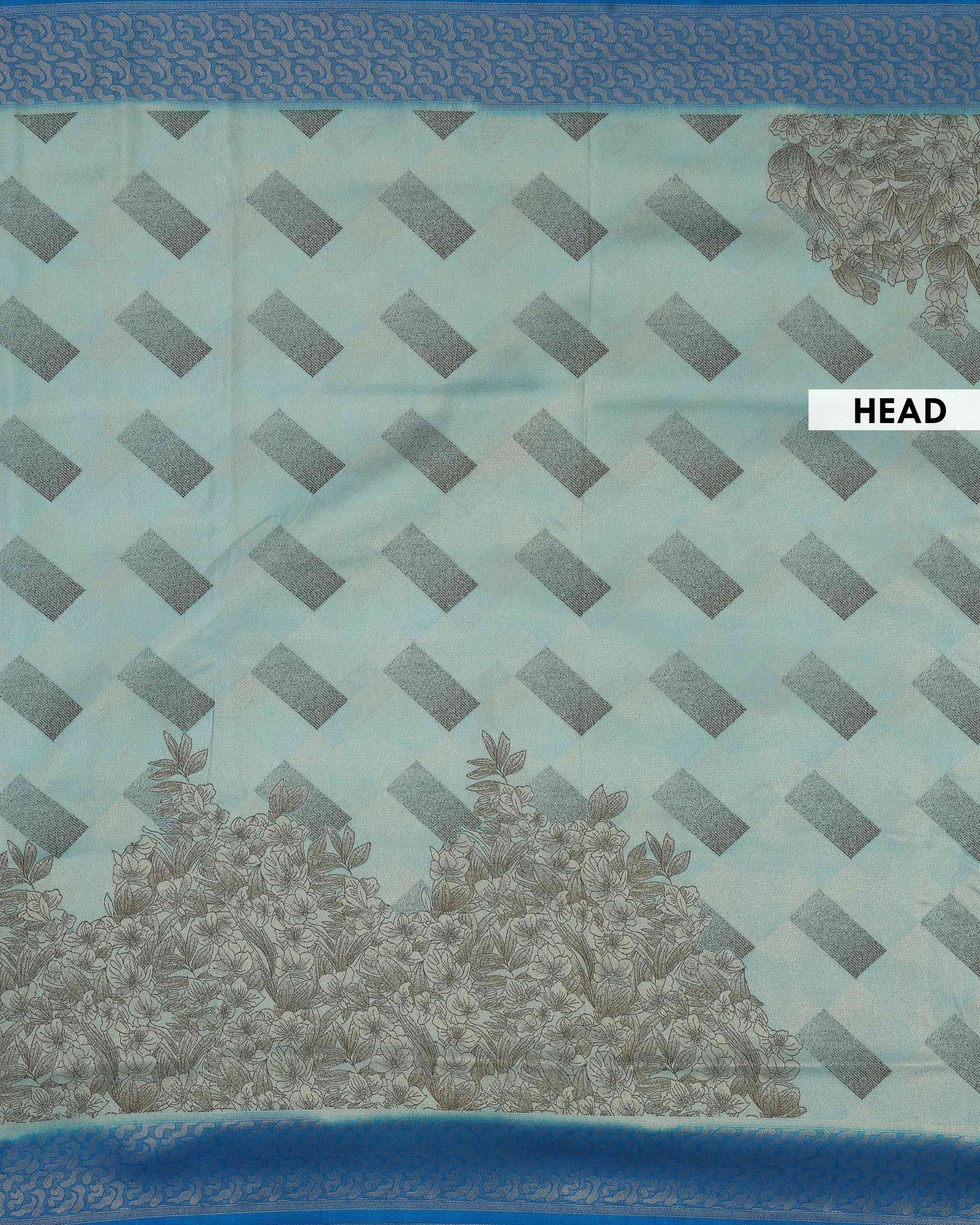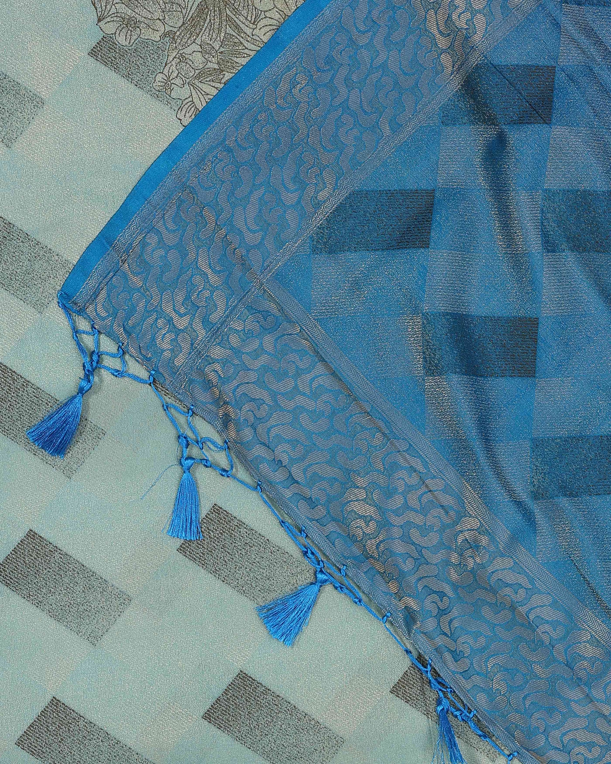 - This elegant art silk saree features a subtle floral pattern on a muted greenish-grey body, complemented by a vibrant, solid blue pallu