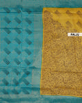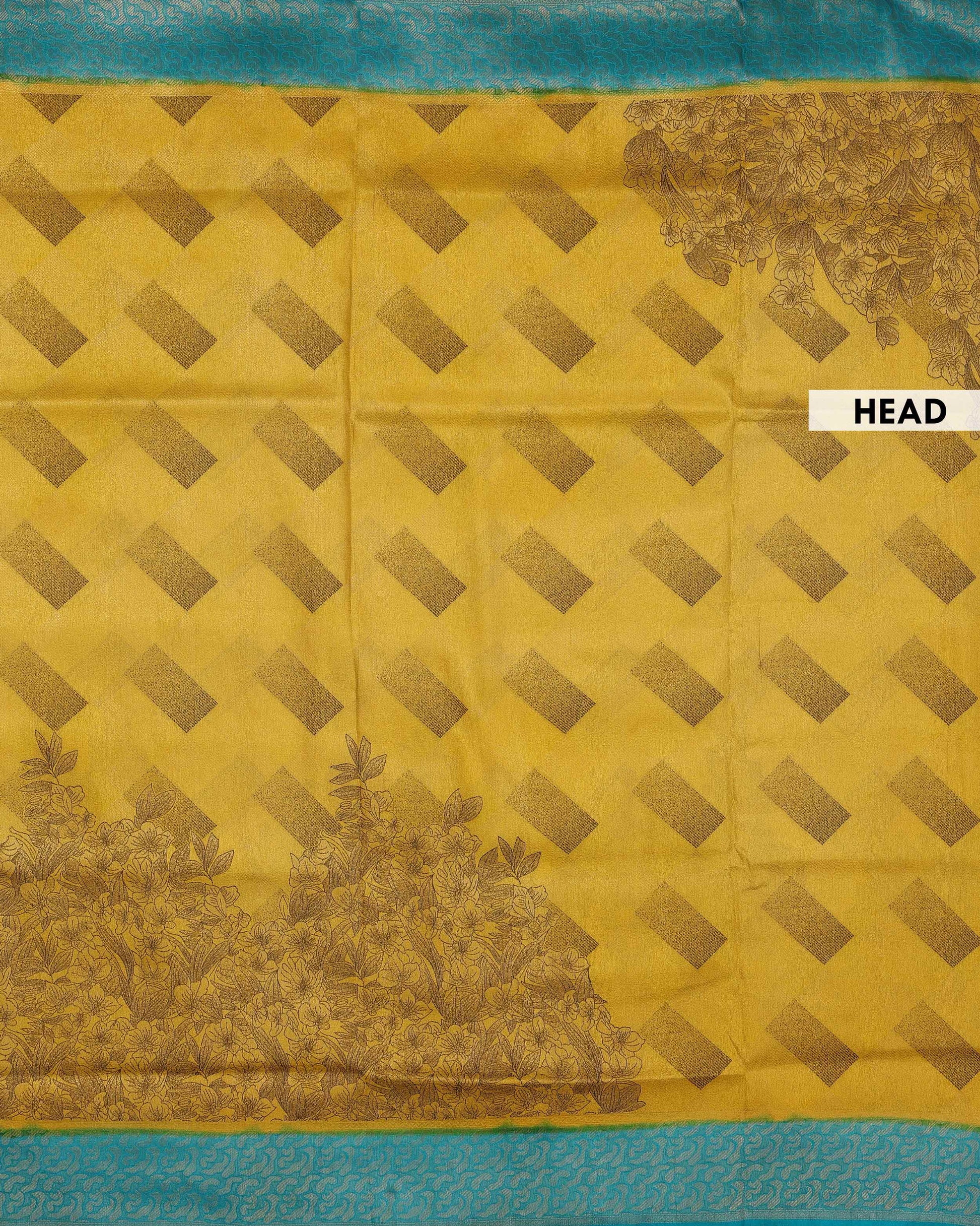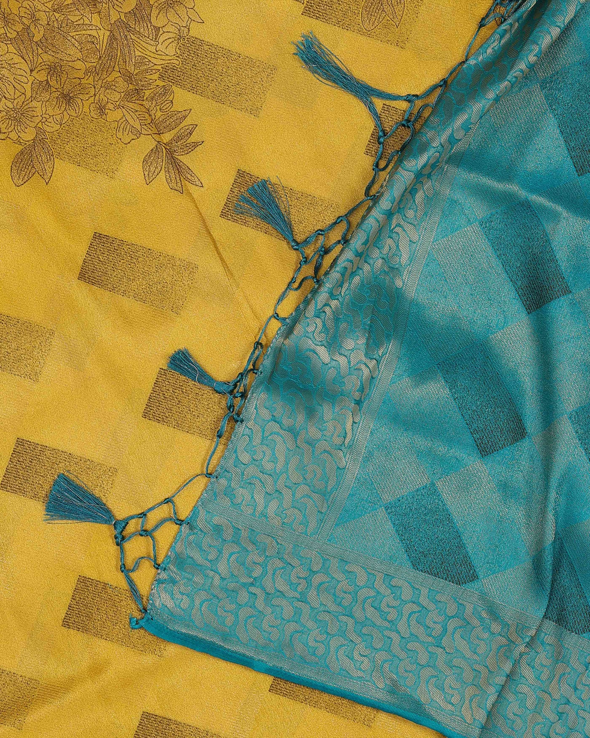 - Elevate your style with this elegant art silk saree, featuring a rich mustard yellow body with intricate floral designs and a contrasting turquoise blue border