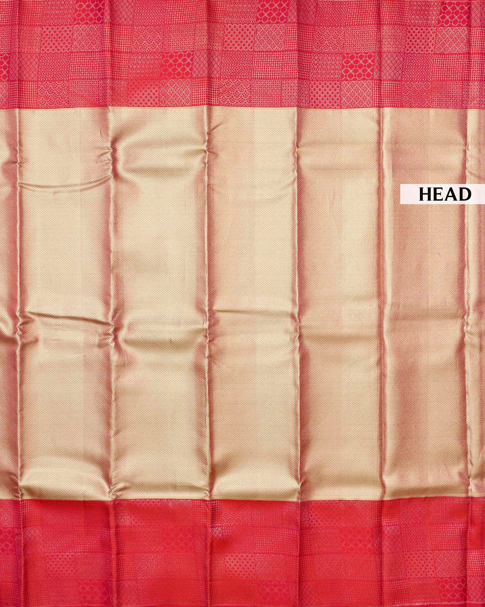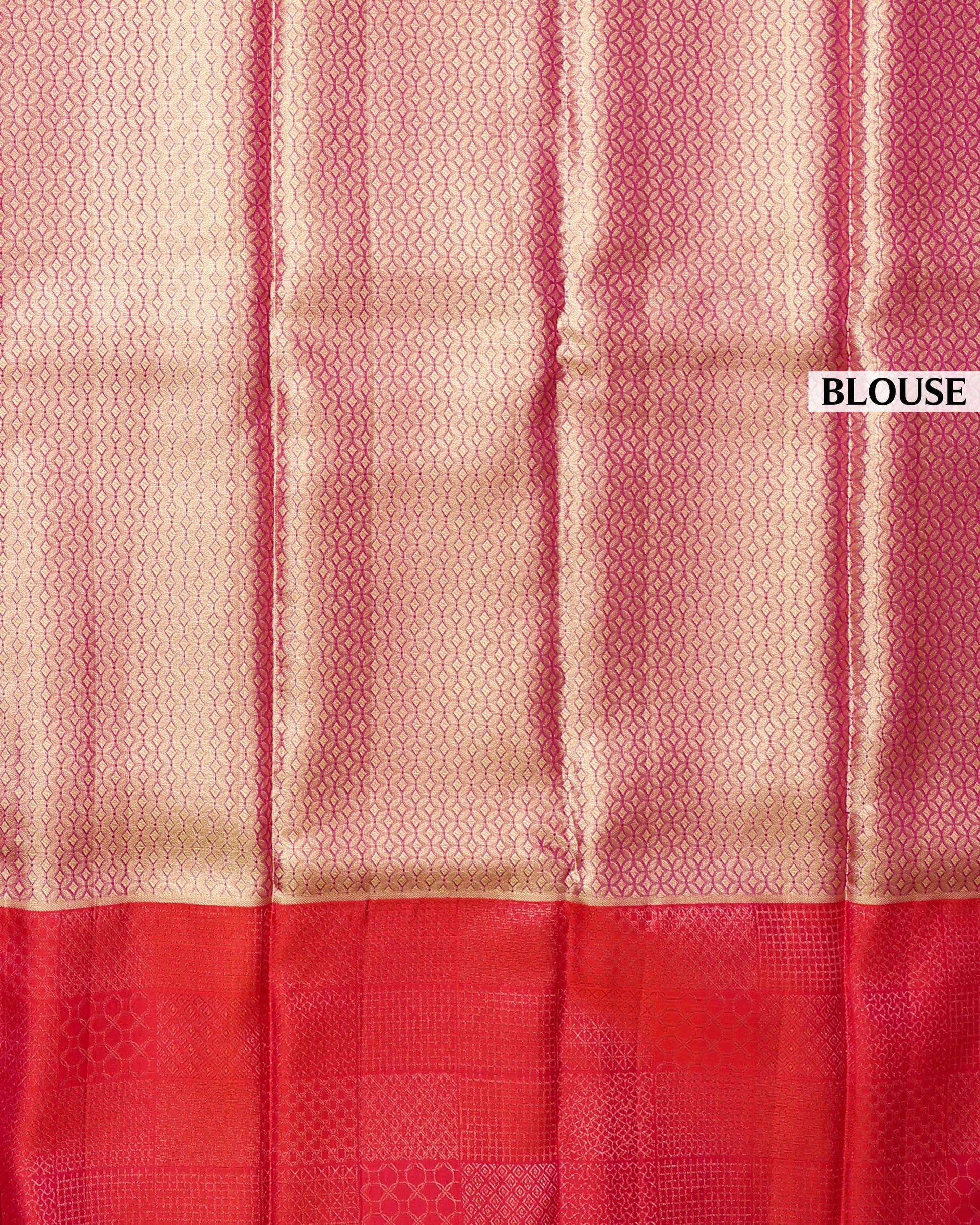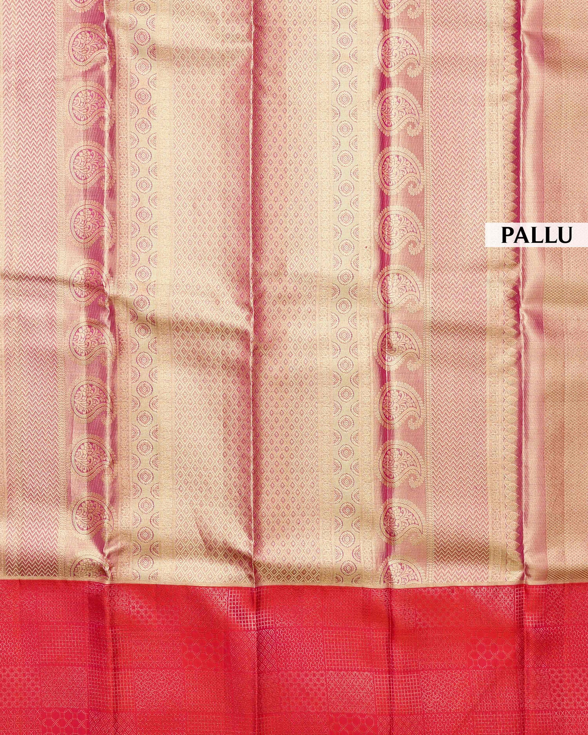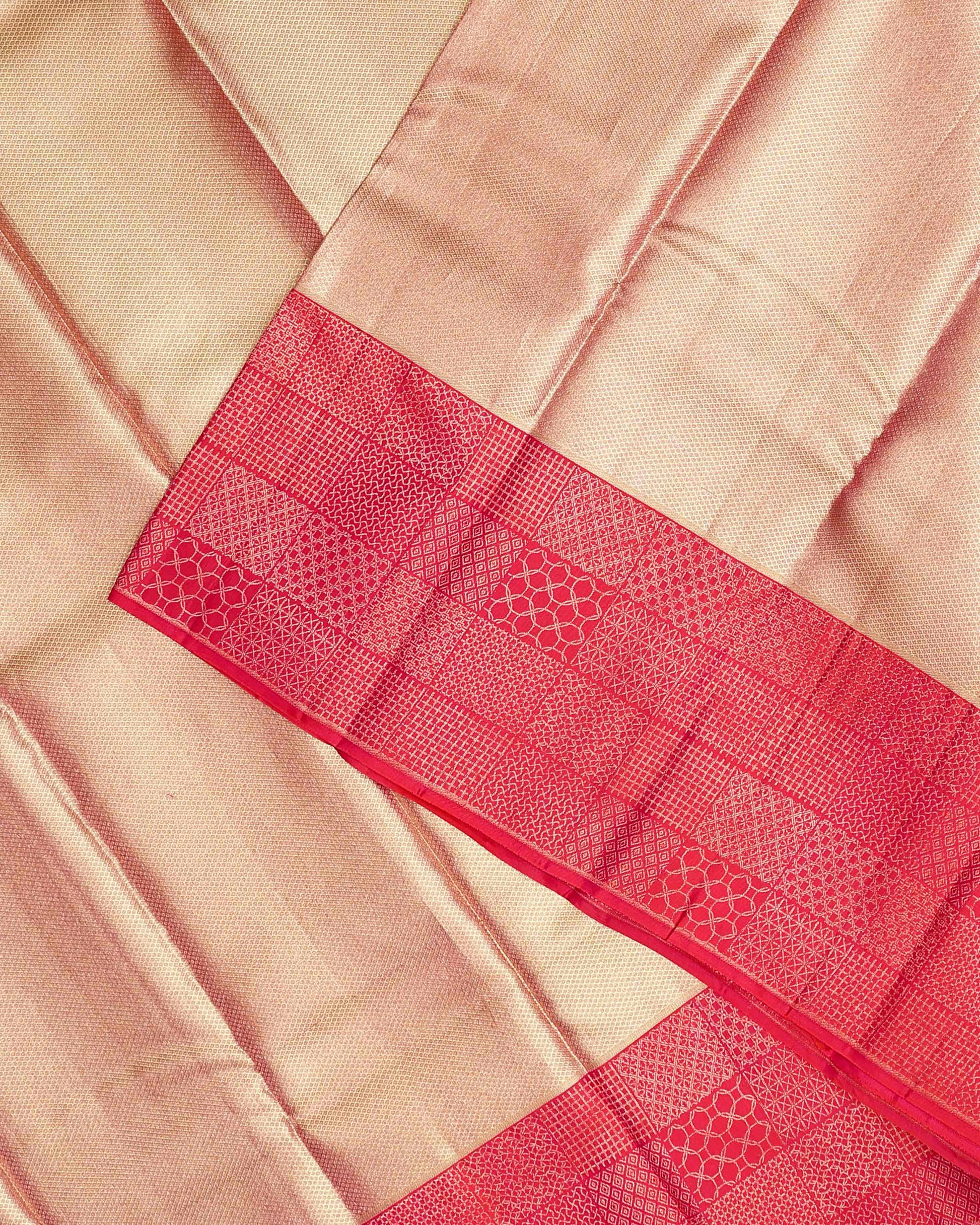 - This is a traditional silk saree, likely a Kanchipuram Pure Silk saree, a shimmering golden body and a contrasting reddish-pink pallu with intricate gold zari work