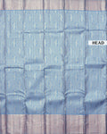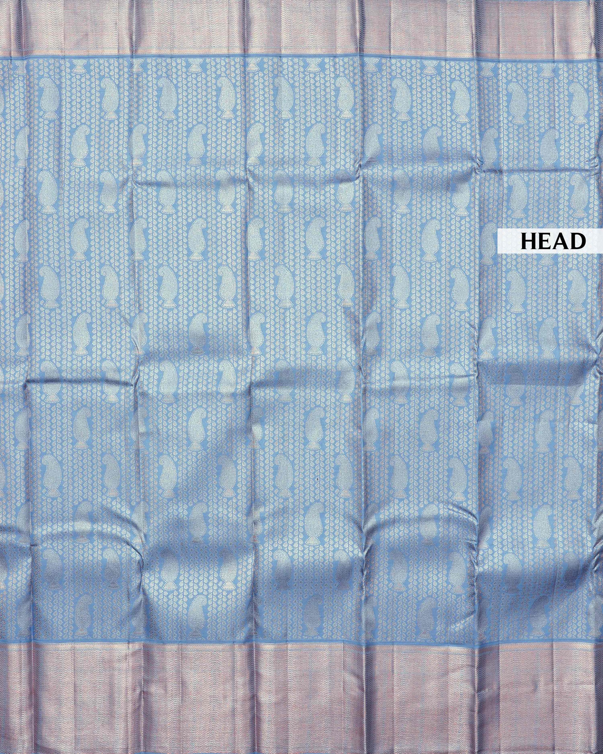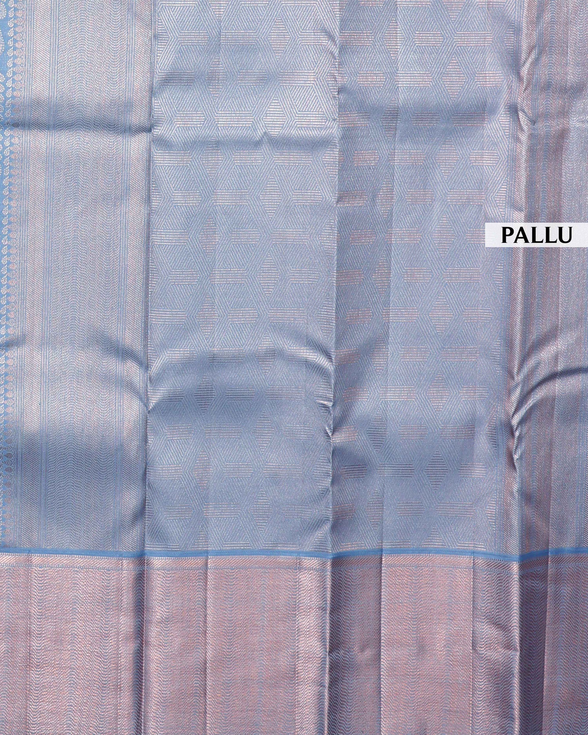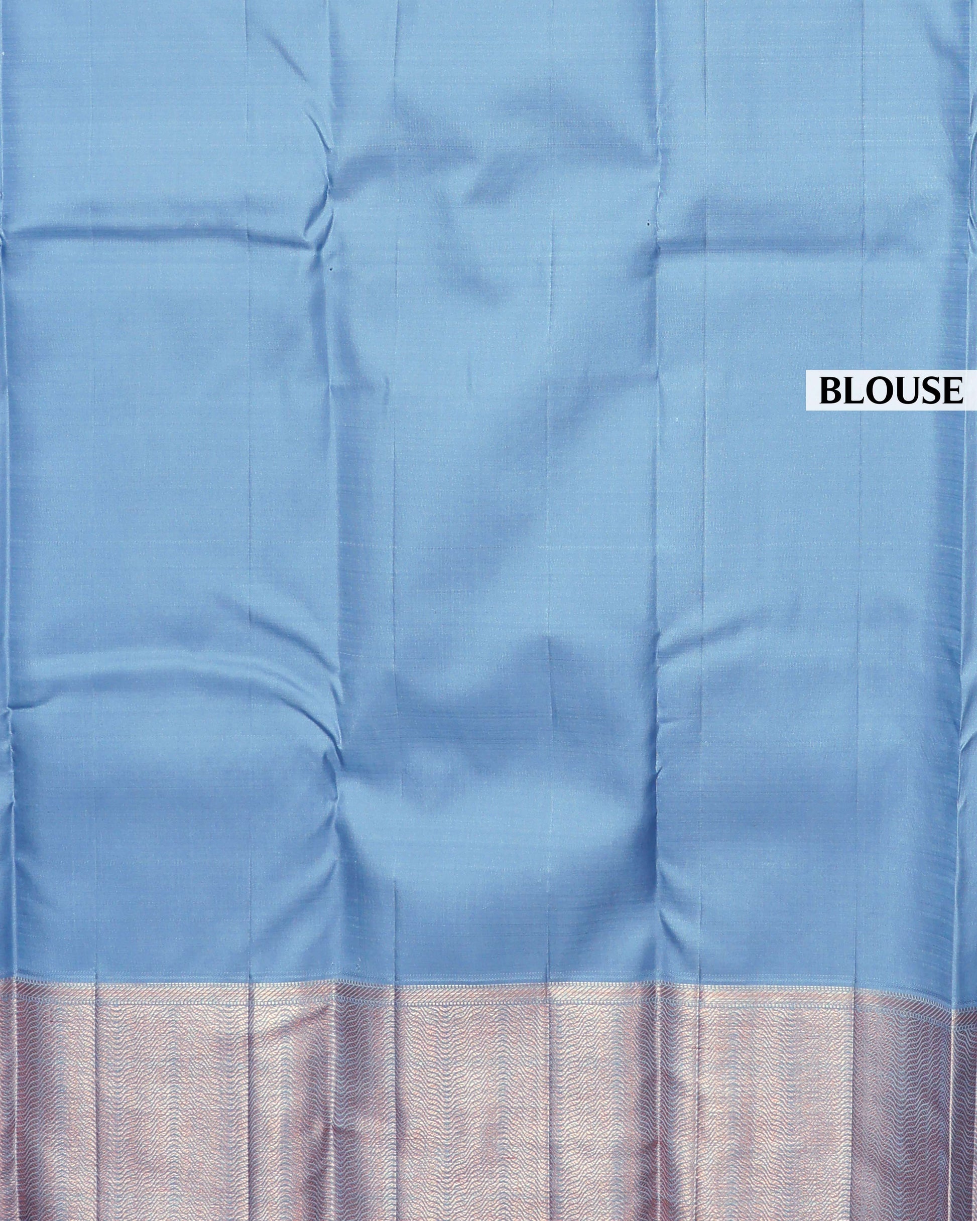 - This exquisite Kanchipuram pure silk saree a refreshing sky blue shade with intricate silver zari weaving.