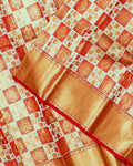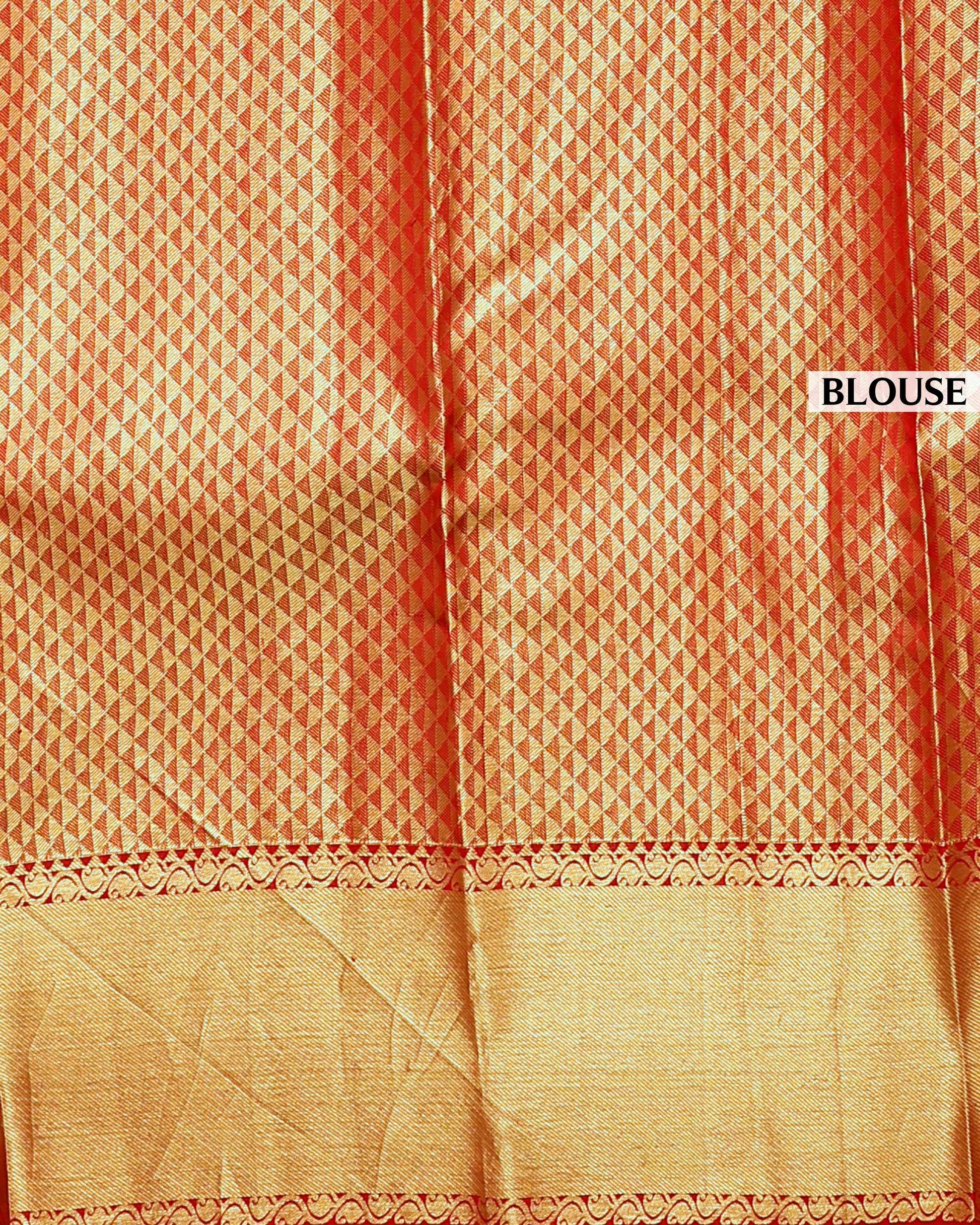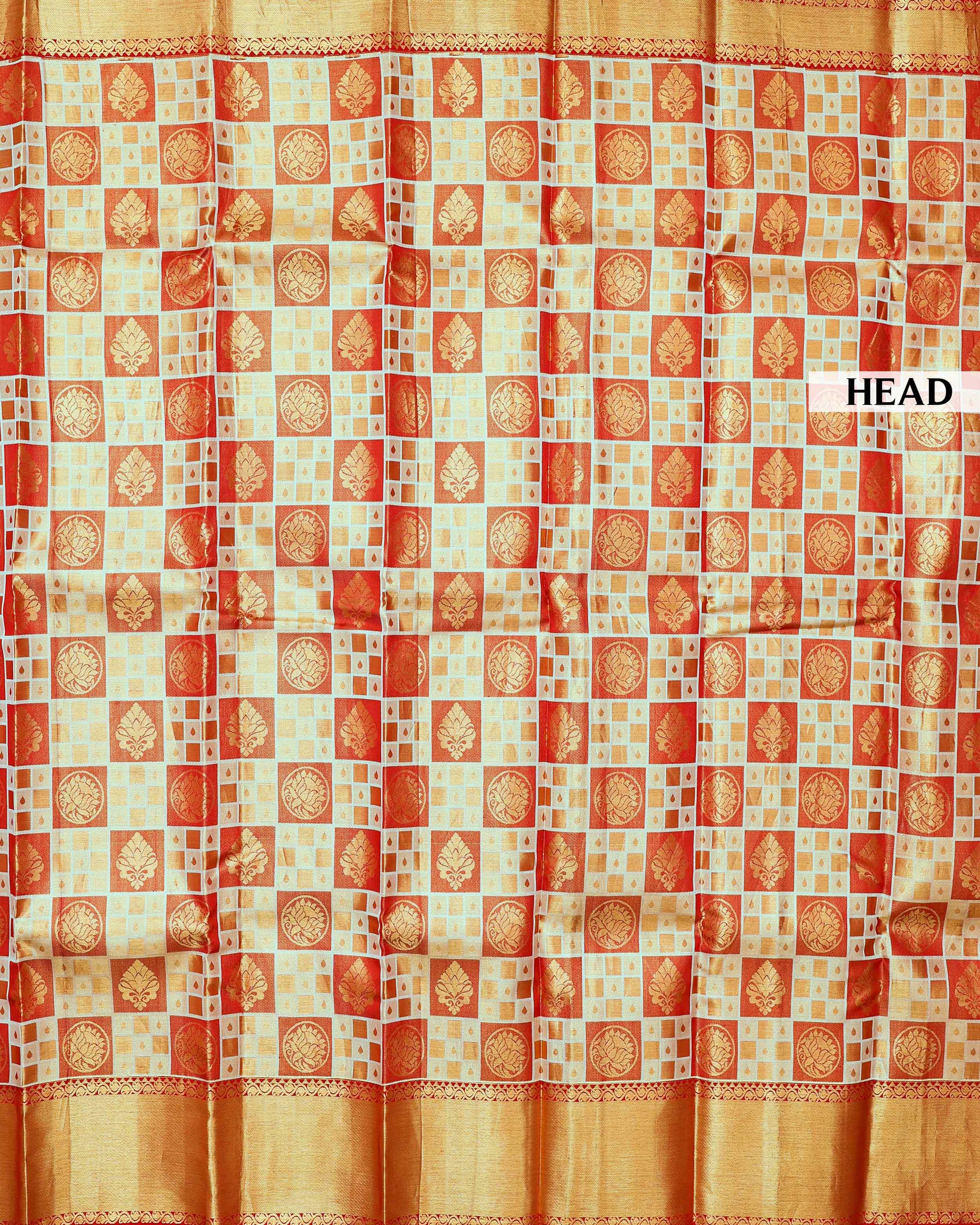 - This exquisite Kanchipuram silk saree a stunning checkered pattern with intricate motifs and a rich, contrasting border