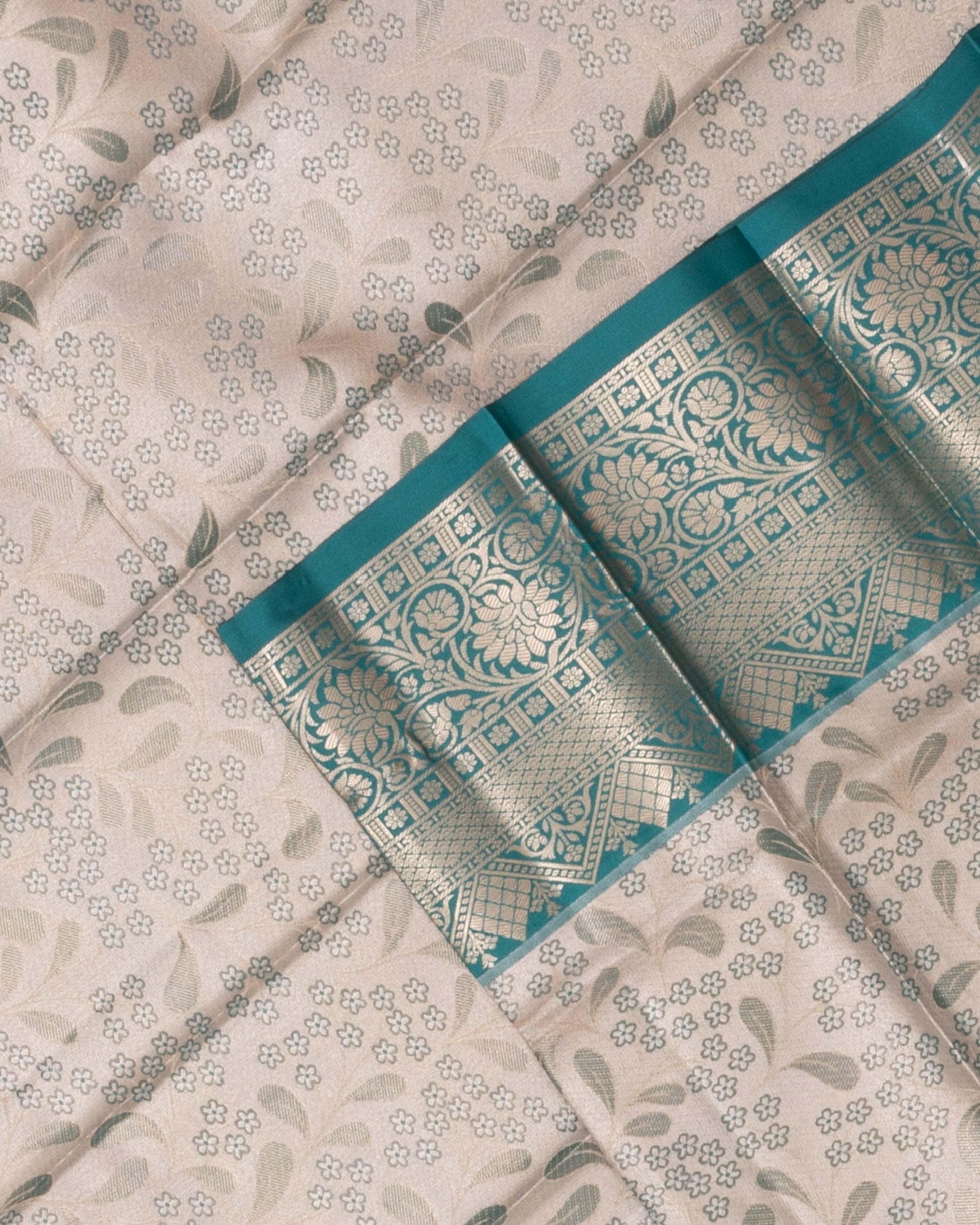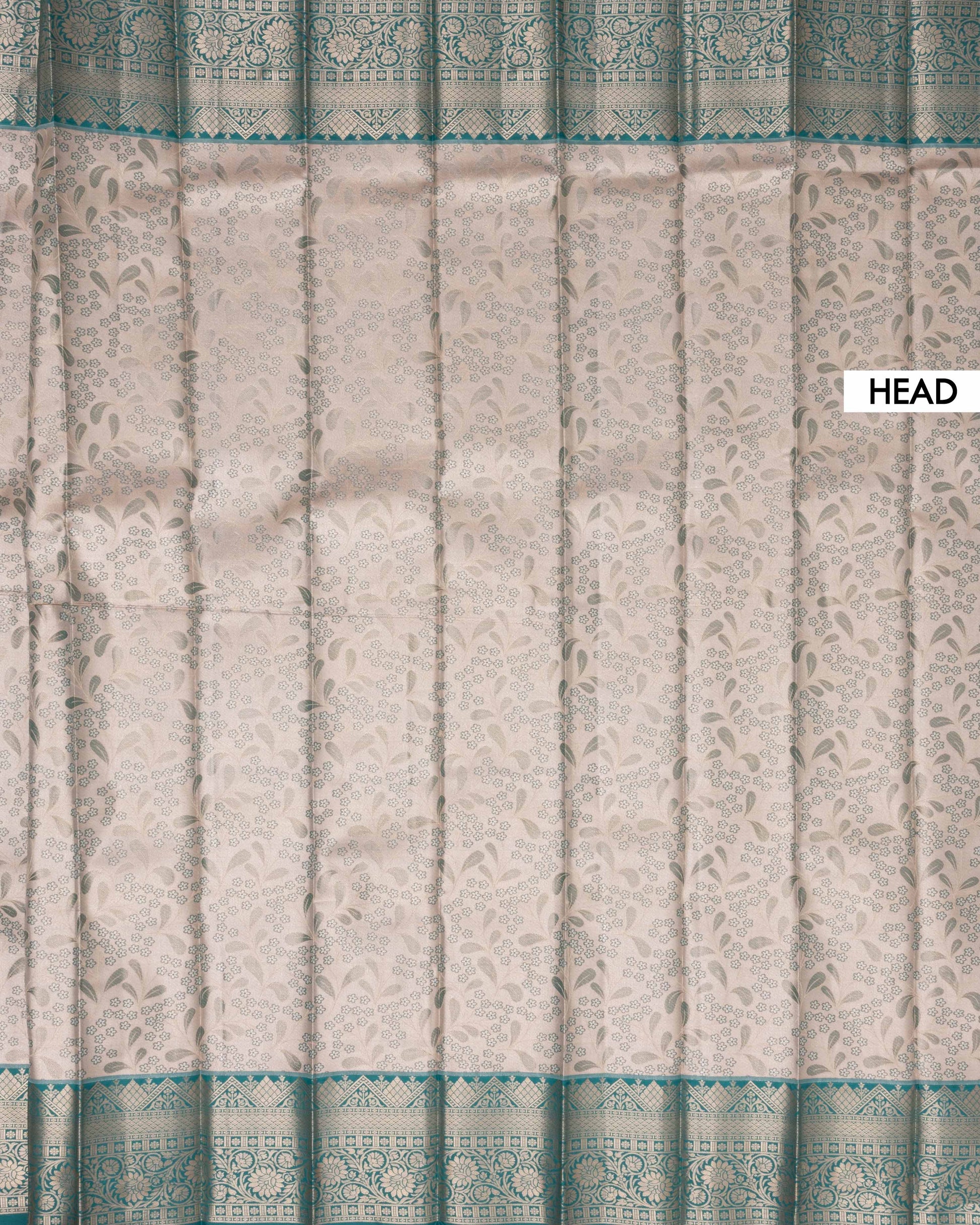 - This exquisite Kanchipuram Tissue silk saree a delicate Cream body with intricate floral motifs.
