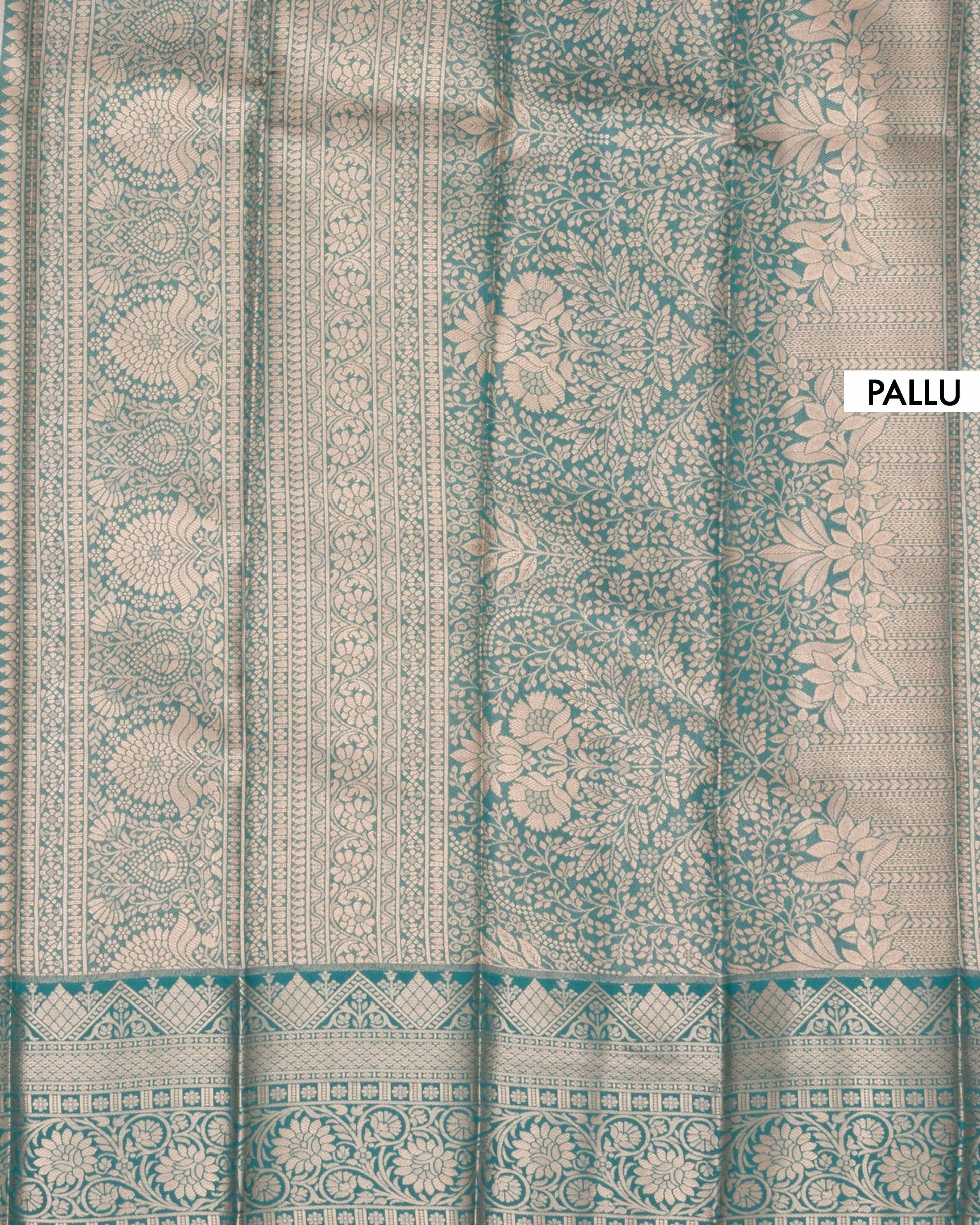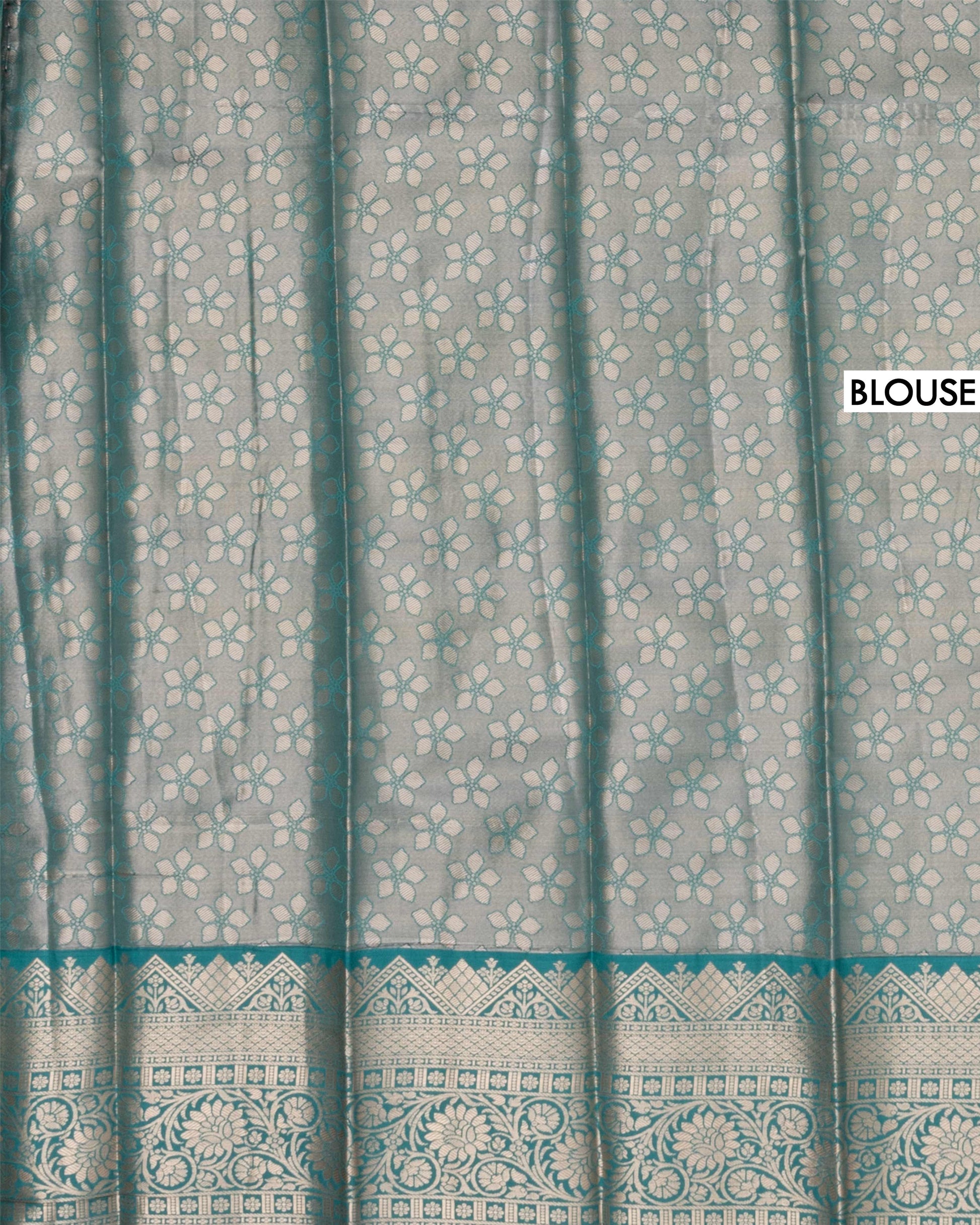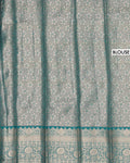 - The vibrant turquoise blue border is adorned with rich gold and silver zari work, making it a perfect blend of traditional elegance and modern style.