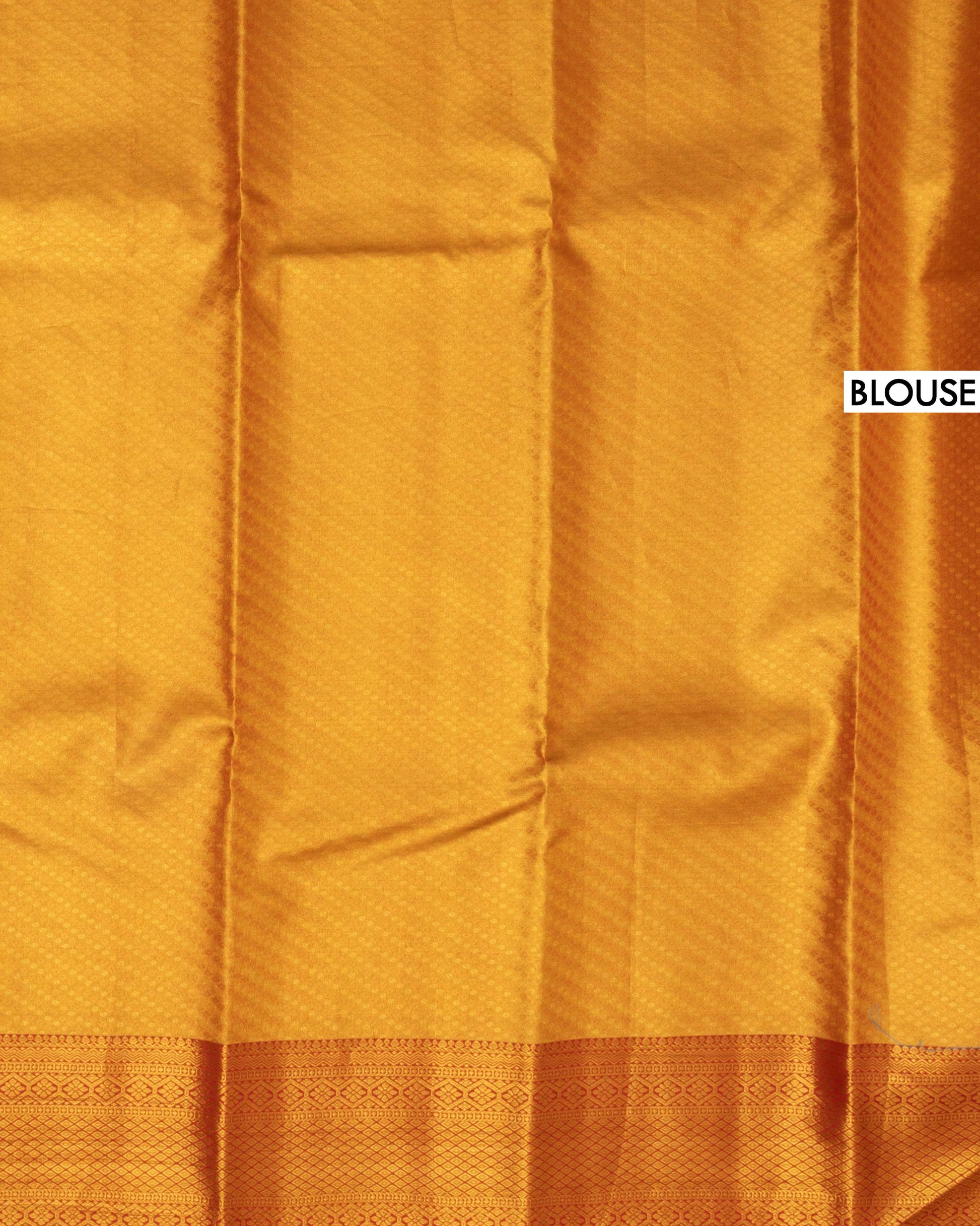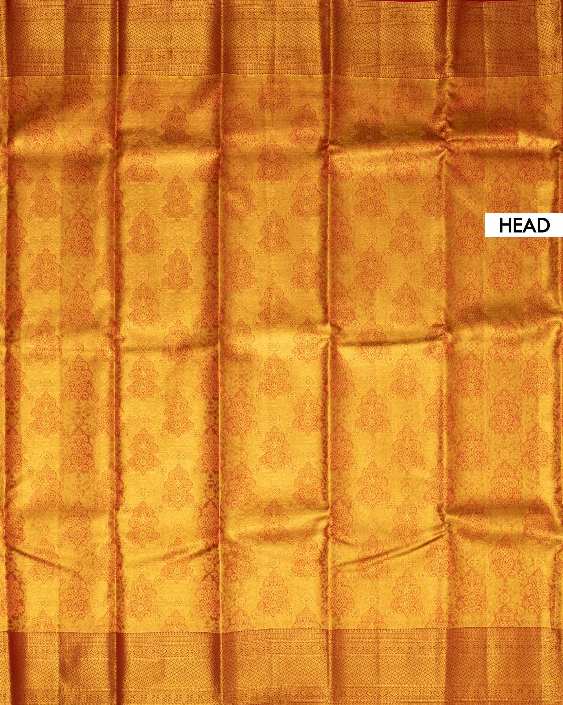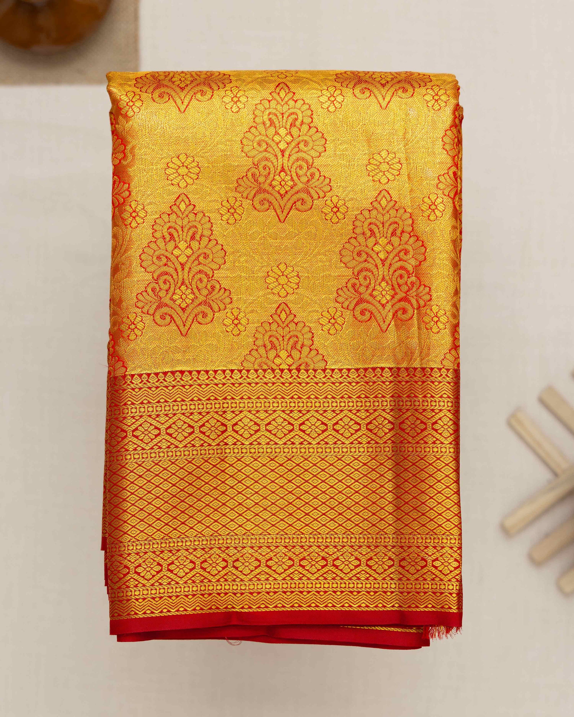 - This radiant Kanchipuram Tissue silk saree a shimmering golden body with intricate floral brocade work