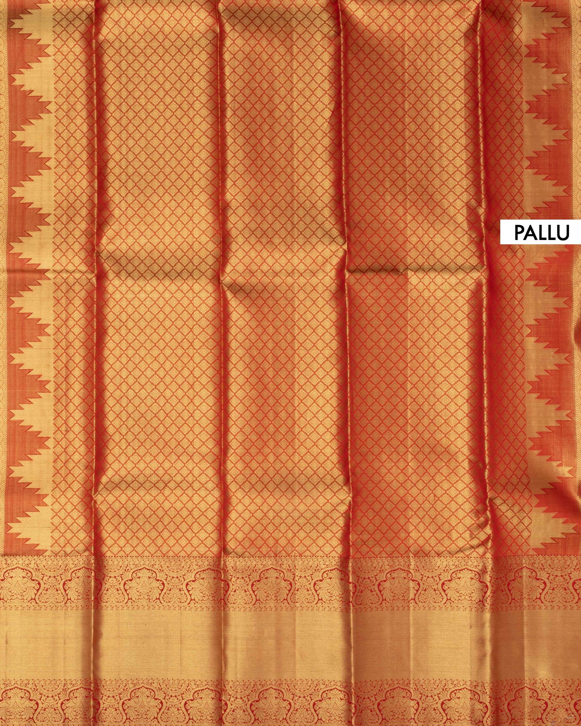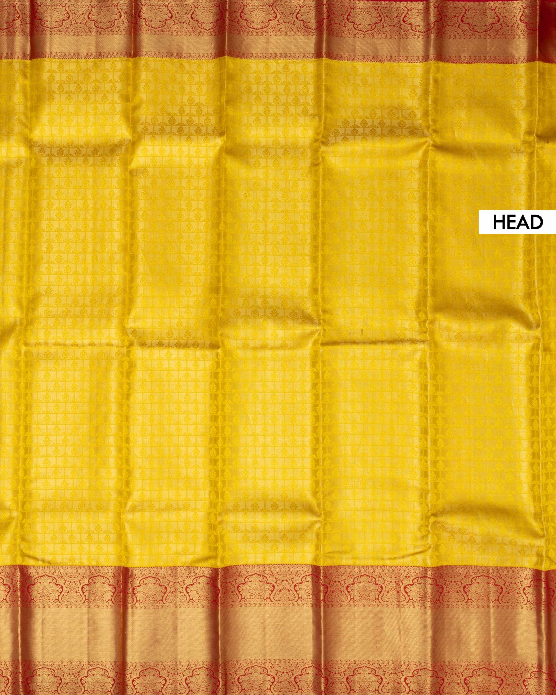 - This radiant Kanchipuram Tissue Silk Saree a luminous yellow body with a rich red and gold zari border, perfect for festive occasions and weddings