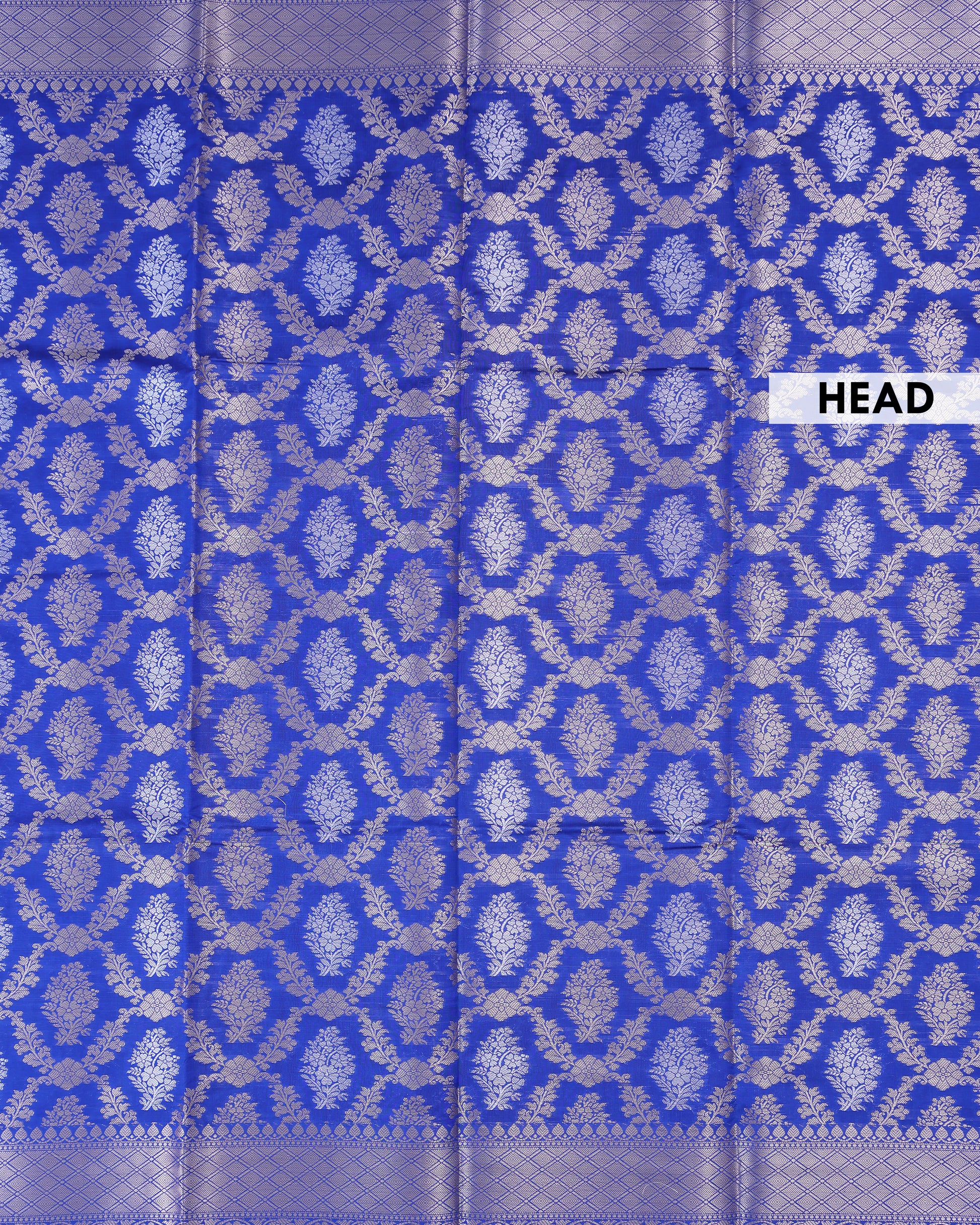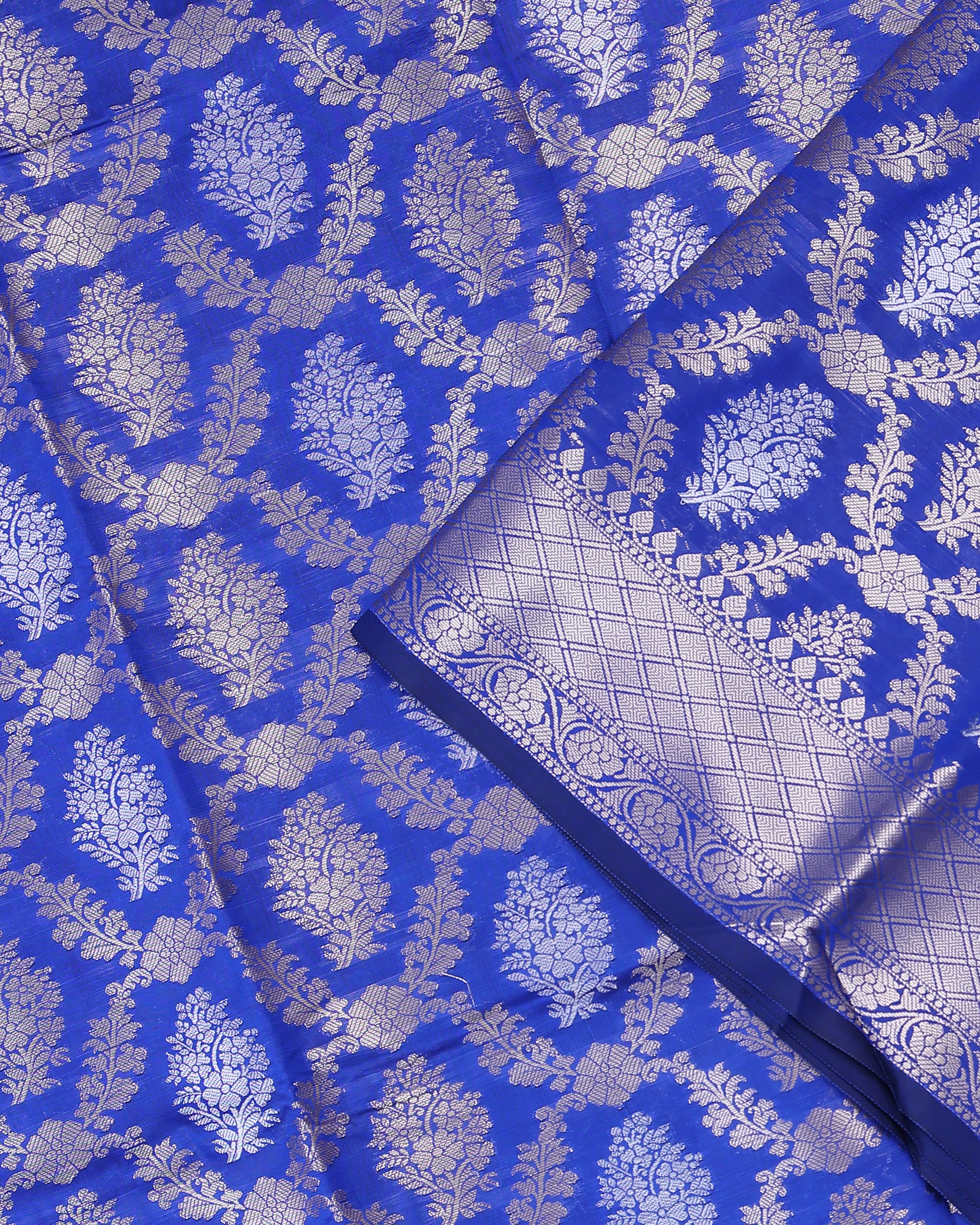 - This stunning royal blue tissue saree intricate gold zari work with traditional floral and paisley motifs