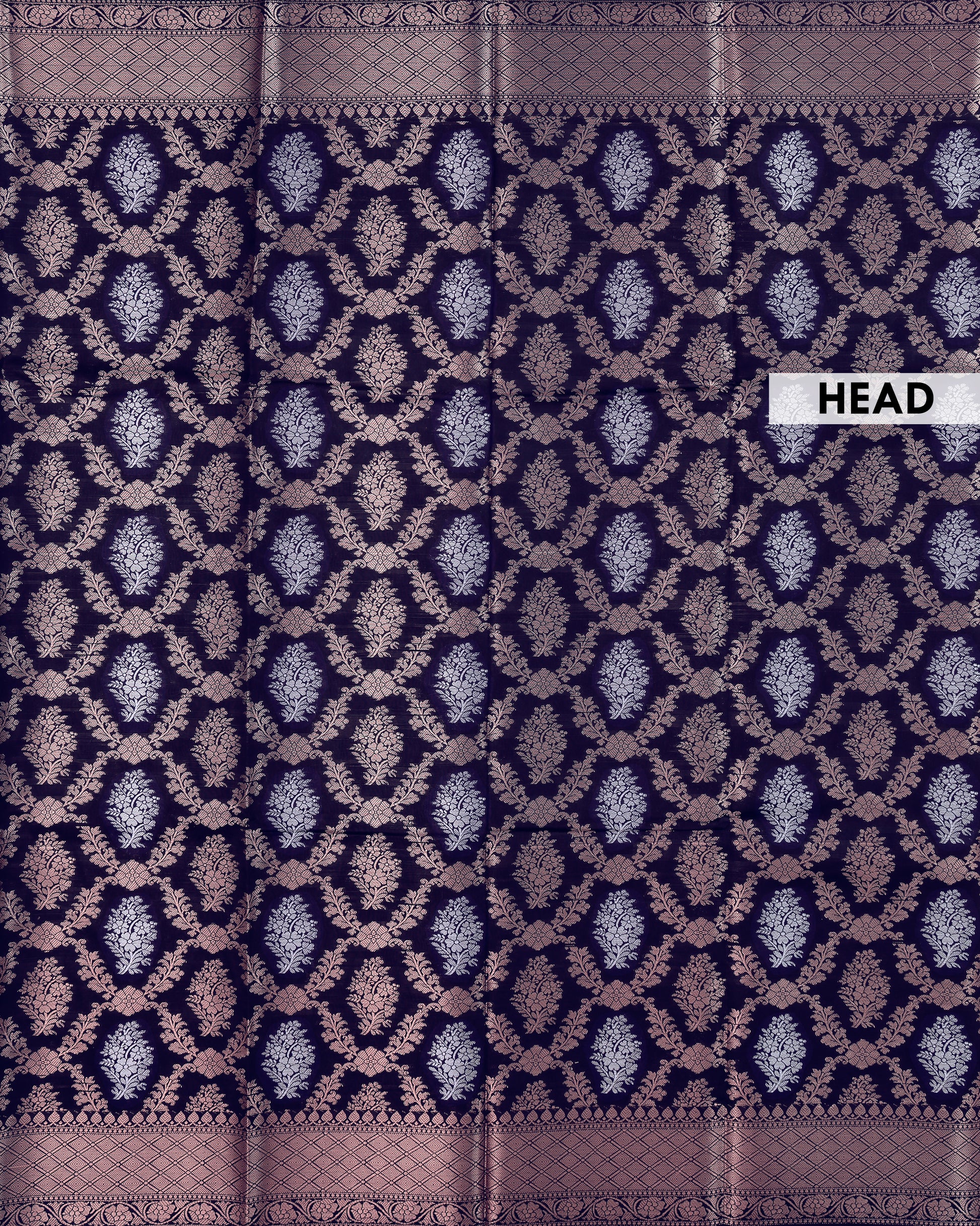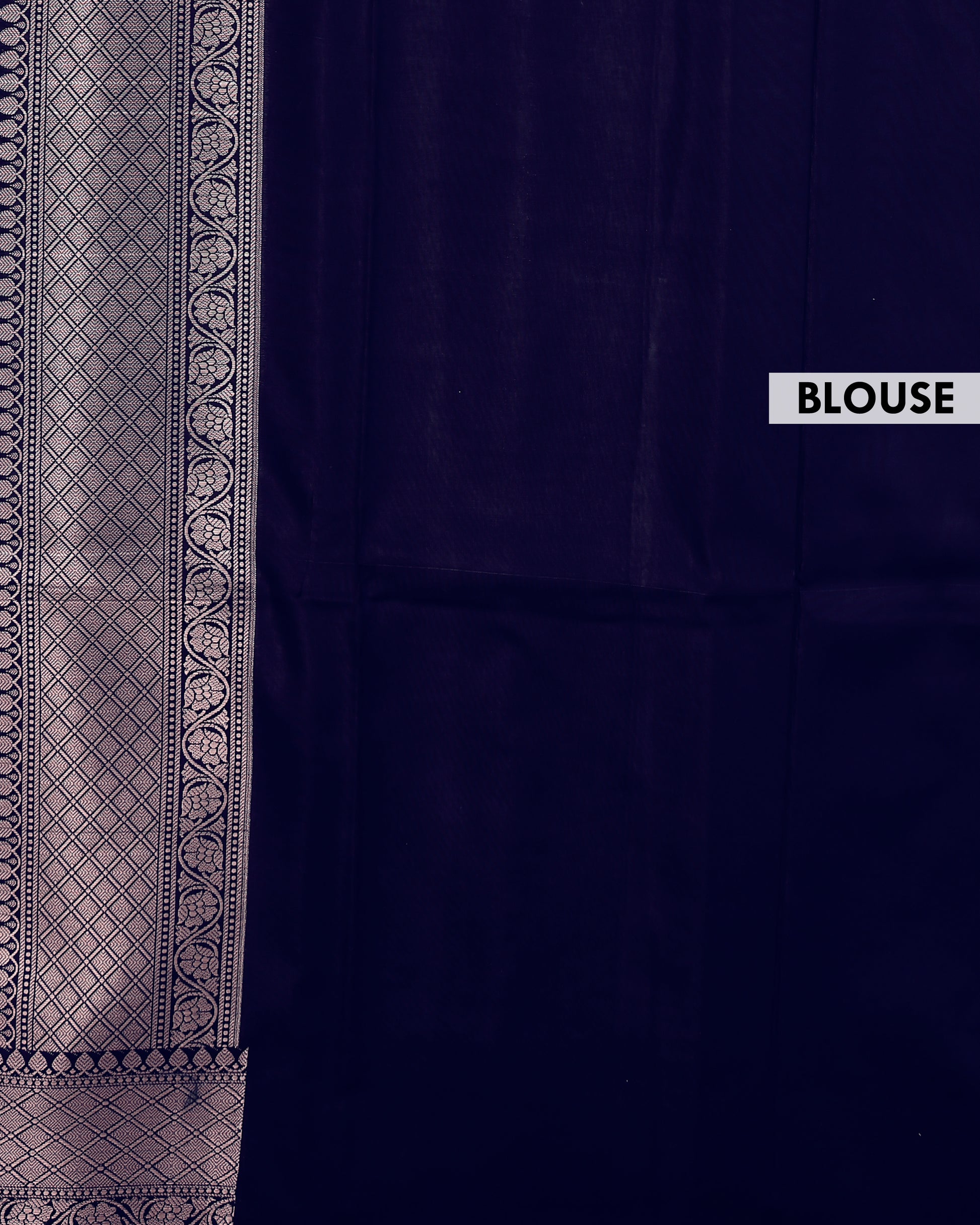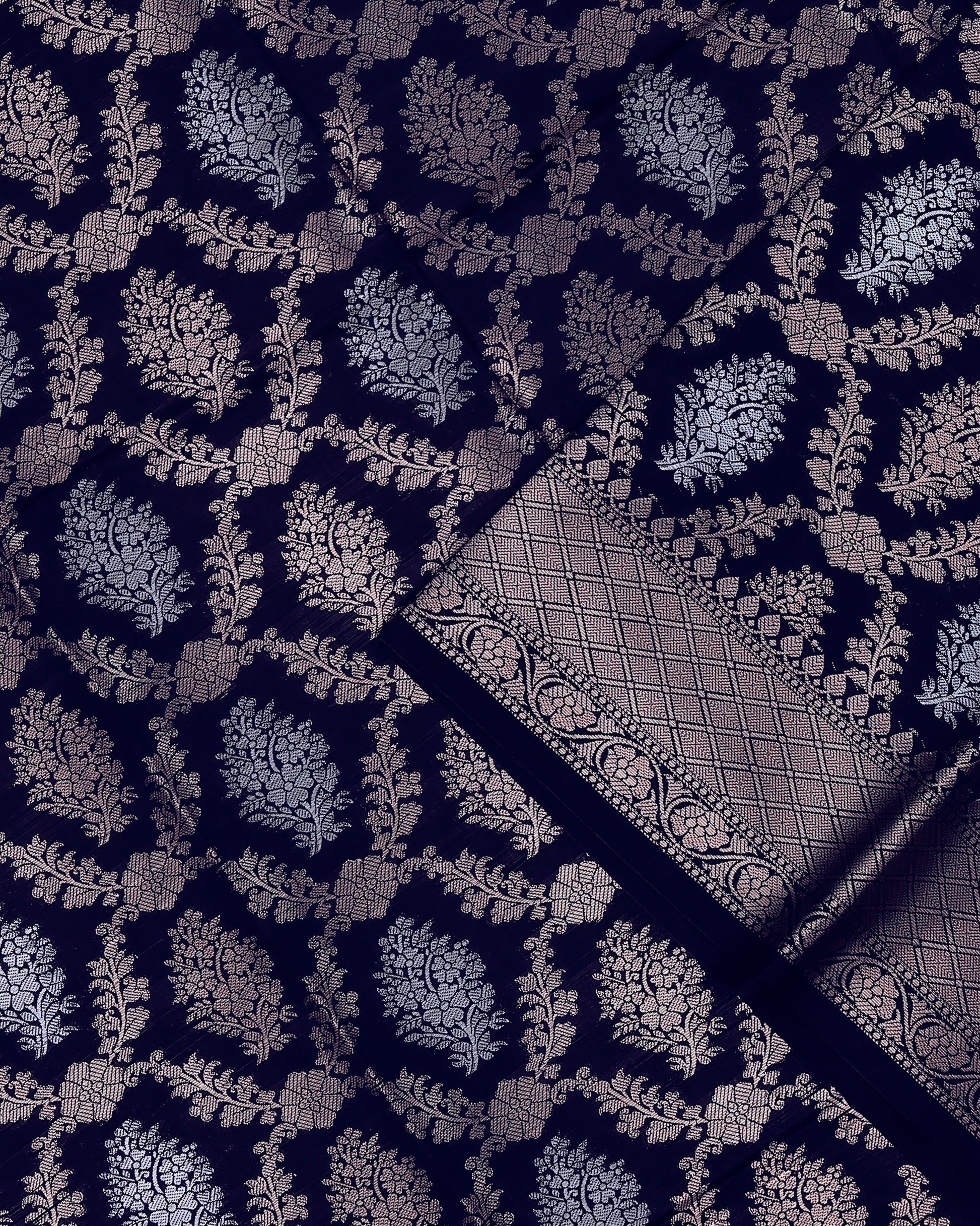 - This navy blue tissue silk saree a rich golden zari floral jacquard design, making it a perfect choice for festive occasions.