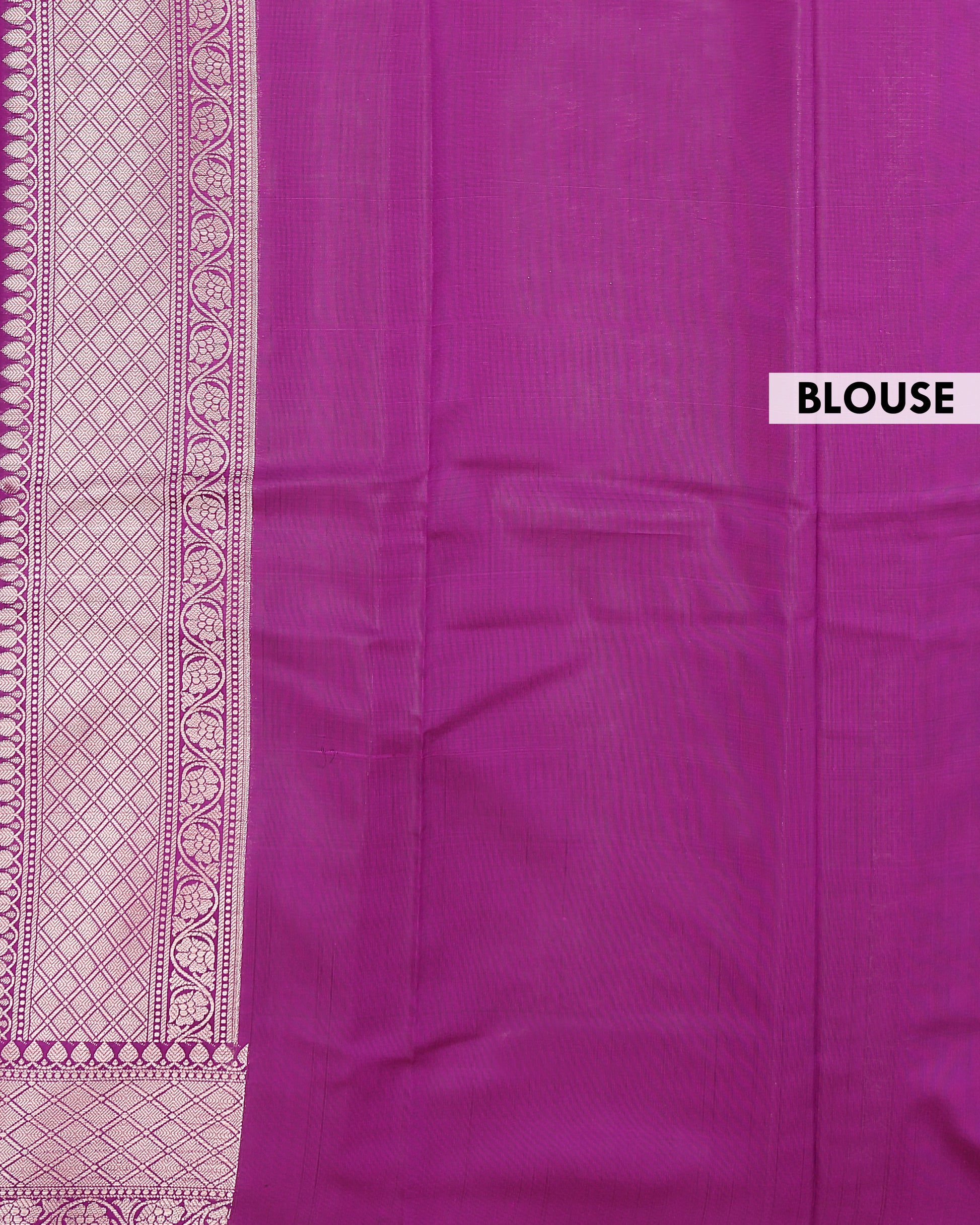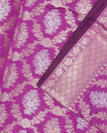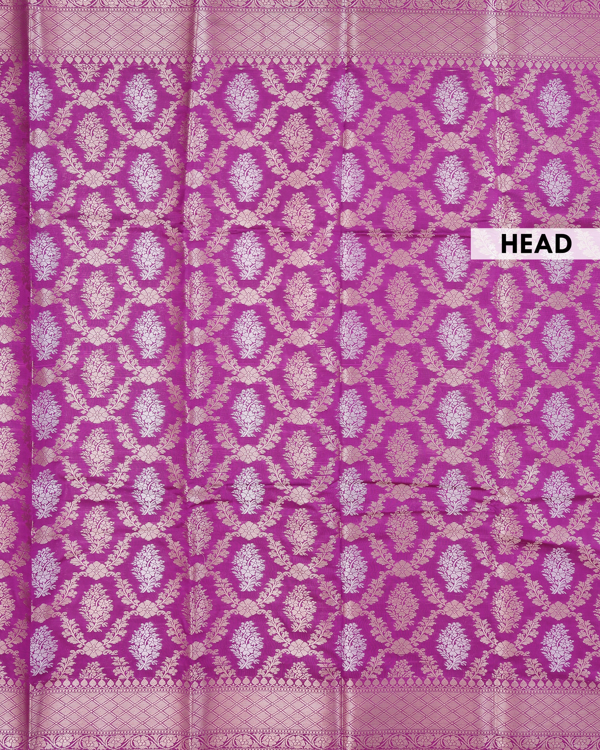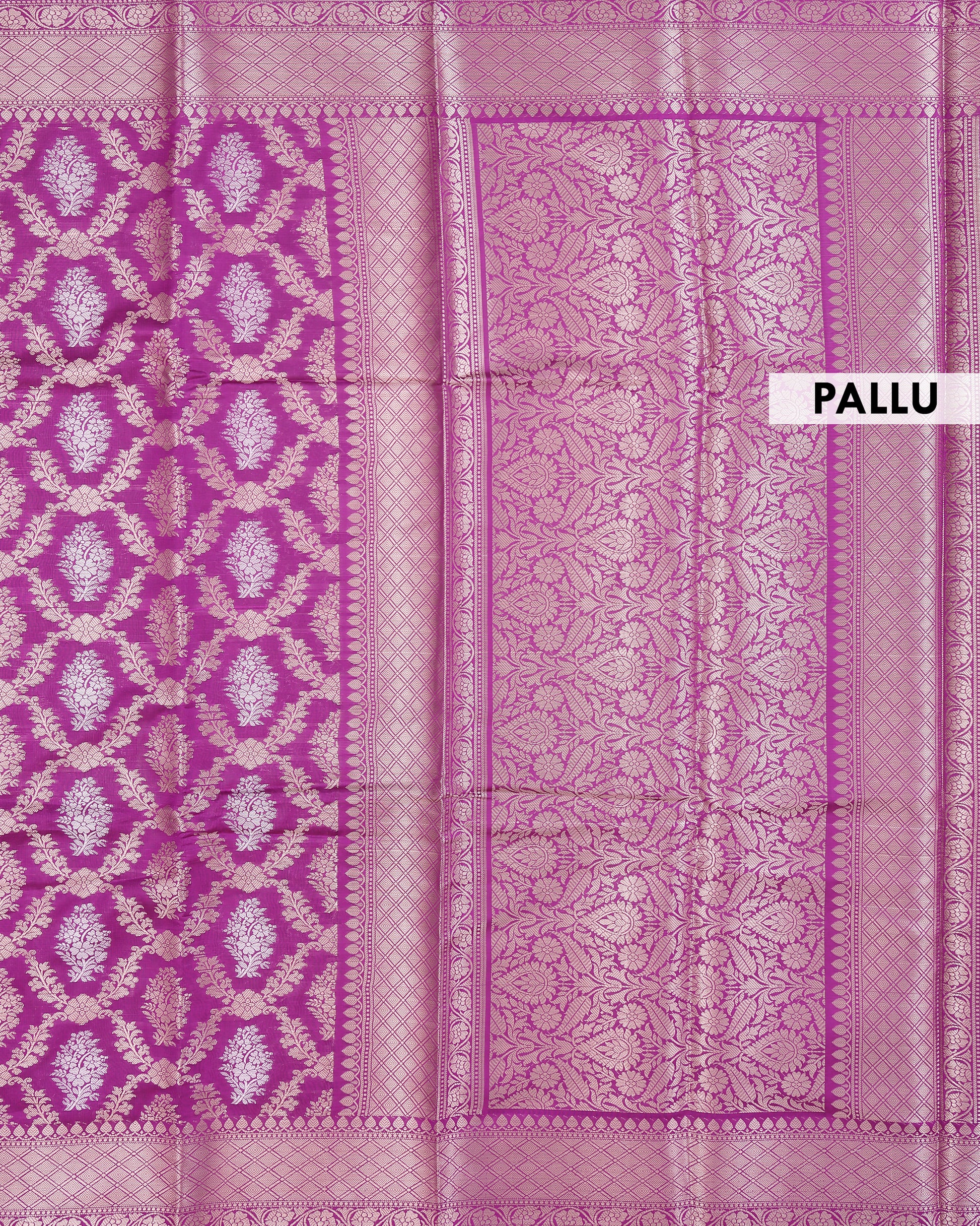 - This handwoven Banarasi Katan silk saree in a stunning purple hue is adorned with an intricate floral jaal woven with gold and silver zari