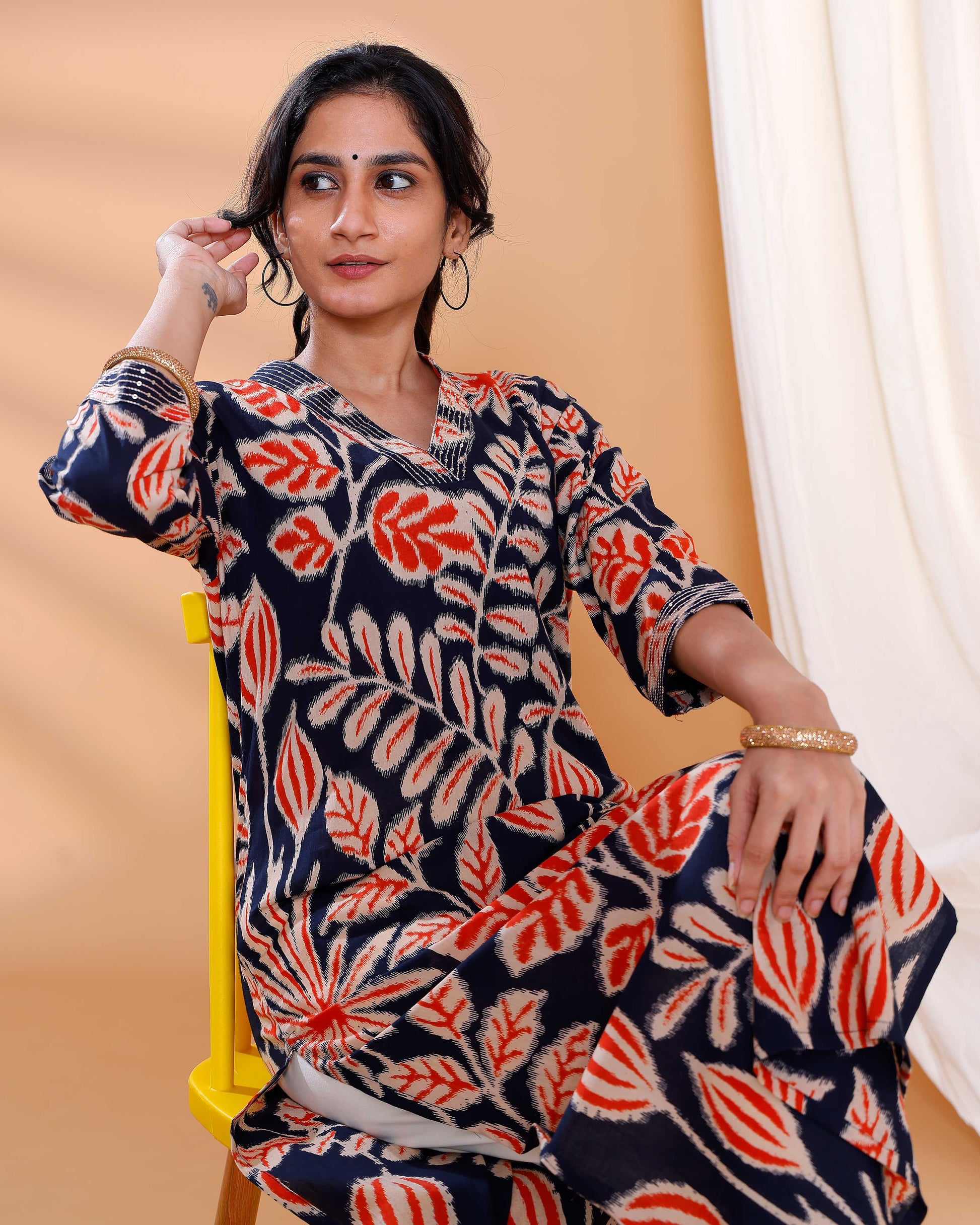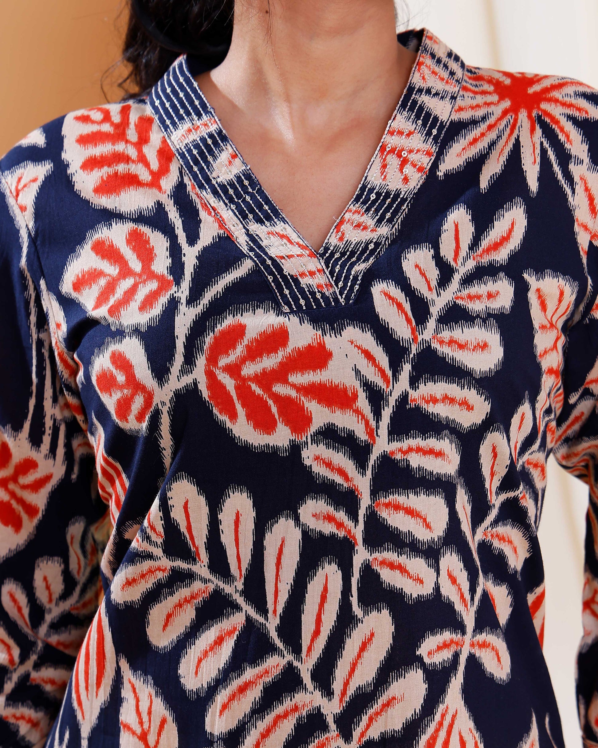 - Elevate your everyday style with this navy blue cotton floral printed straight kurta a V-neckline and 3/4th sleeves.