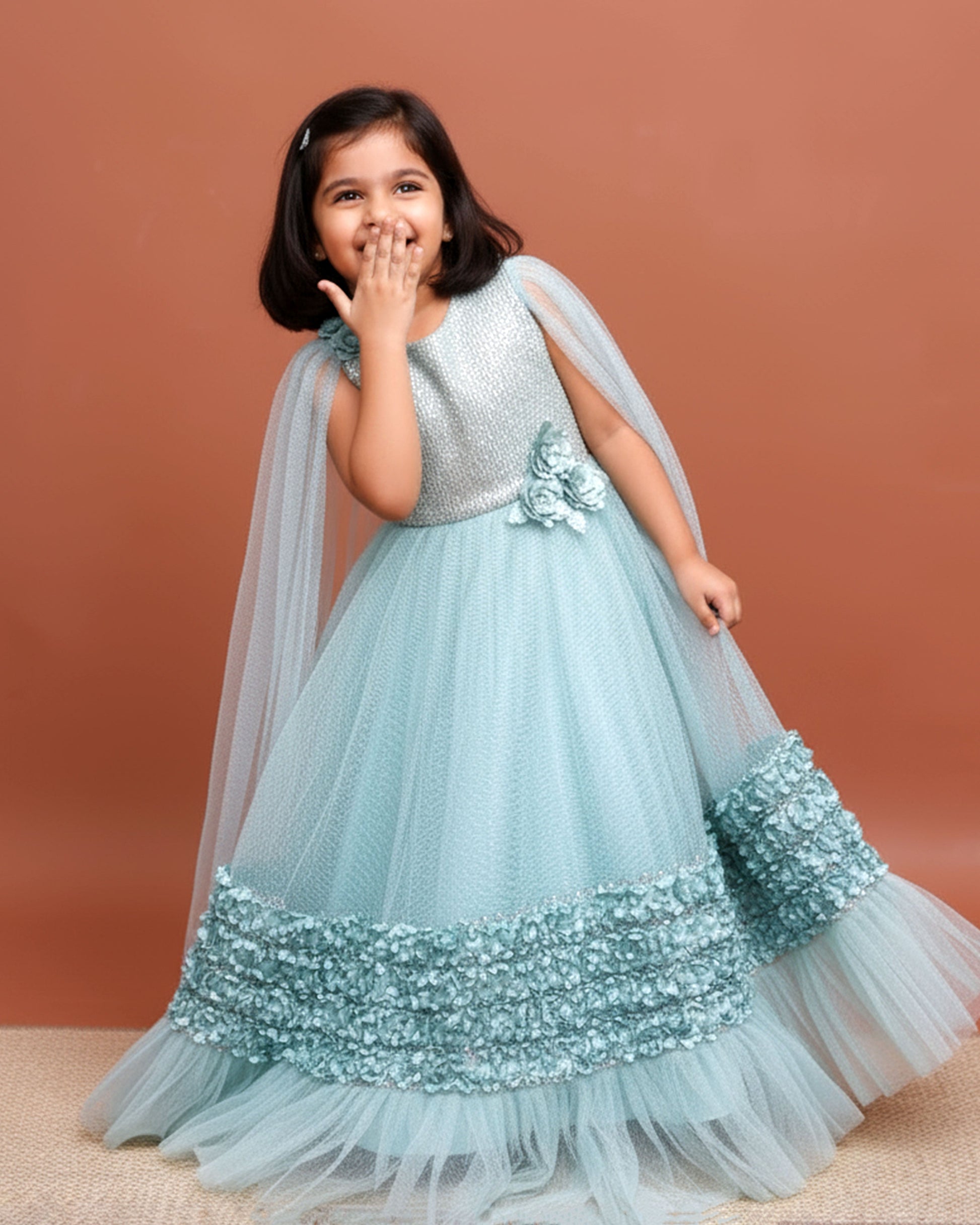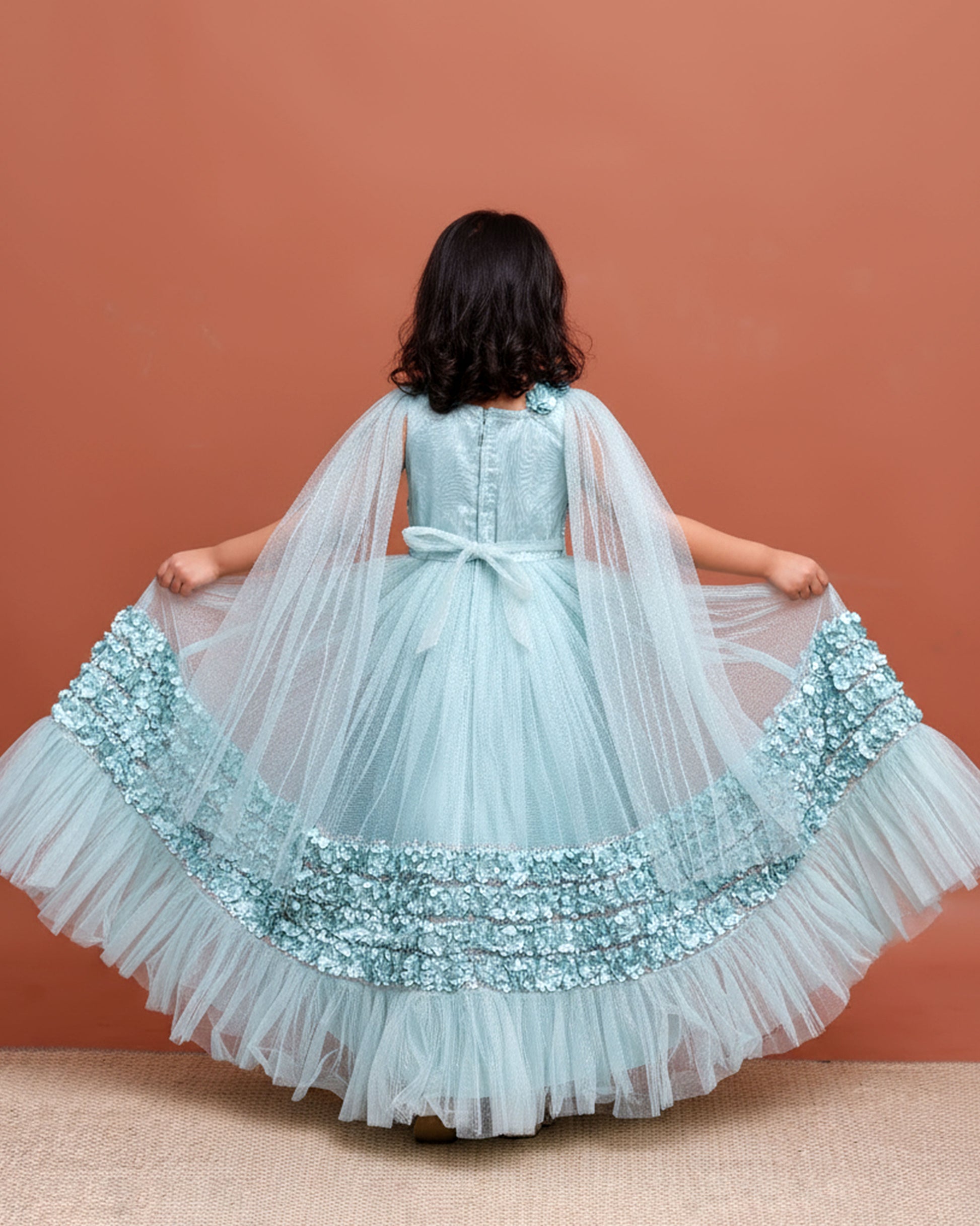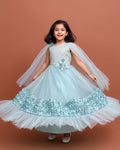 Girls Embellished Net Frock with Cape Sleeves and Ruffled - Green