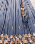 - A stunning grey silk blend lehenga choli intricate gold zari and sequin work, perfect for festive occasions.