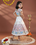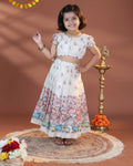 - This charming dhavani set for girls features a beautiful floral-printed lehenga and a classic white blouse with delicate embroidery