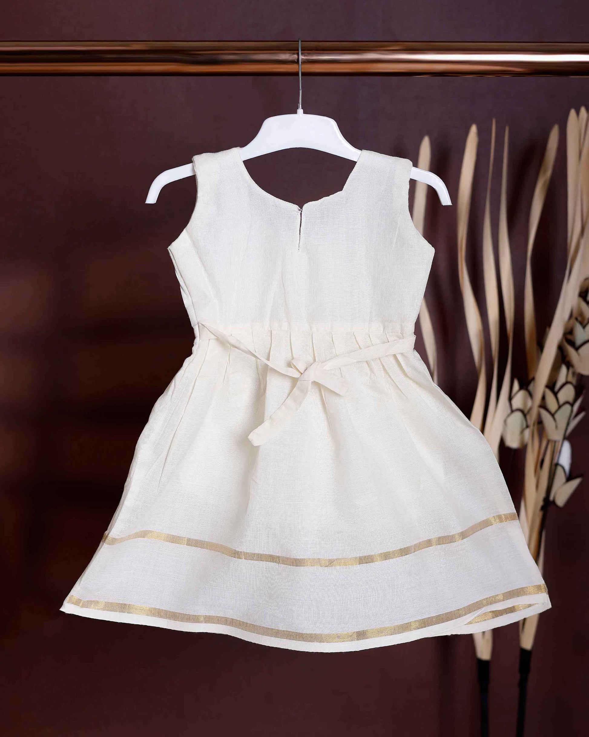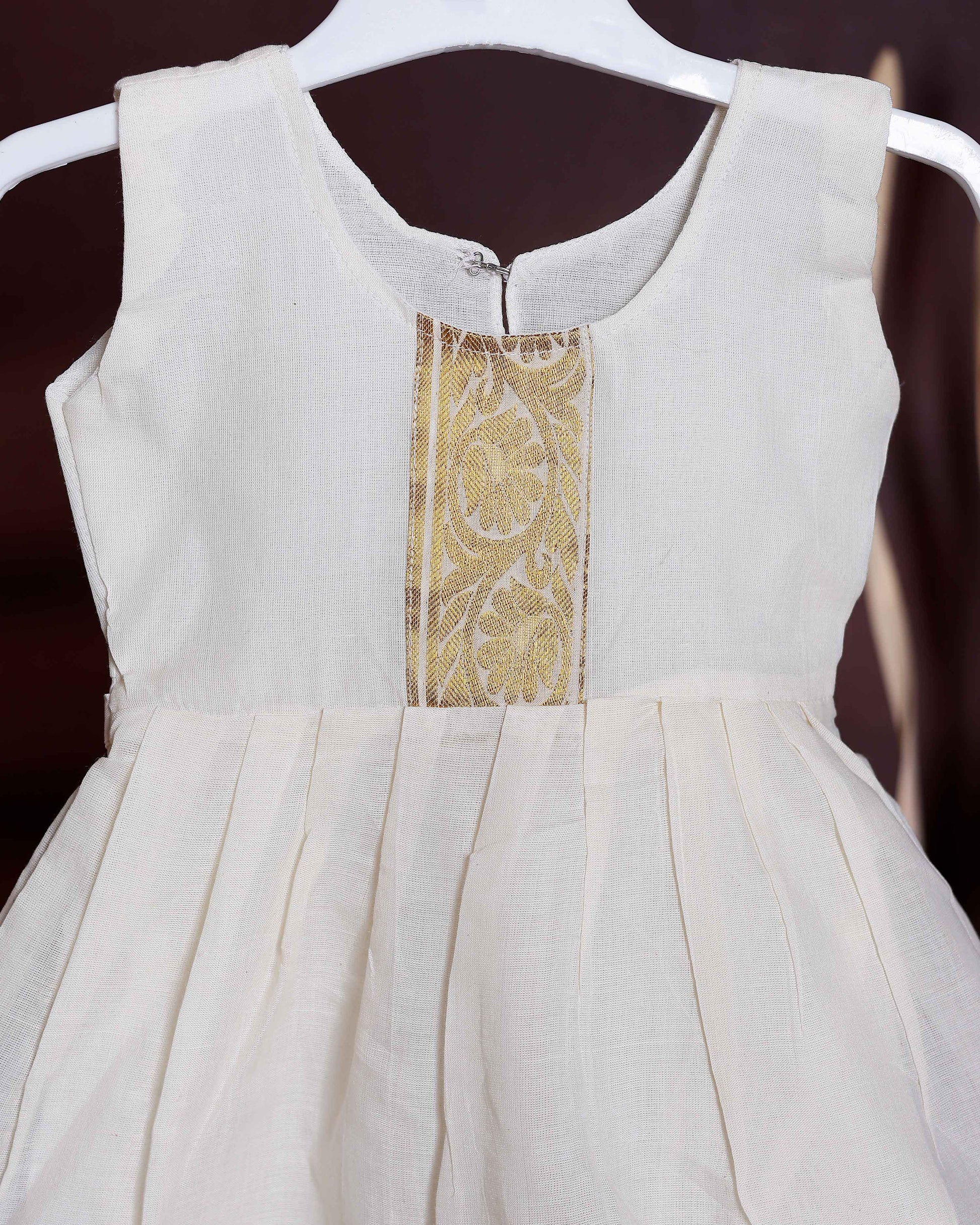 Traditional Kerala Kasavu Style Girls' Frock with Gold Zari Border and Neckline Embellishment - Cream