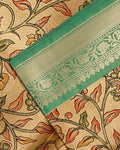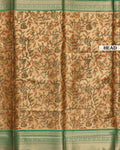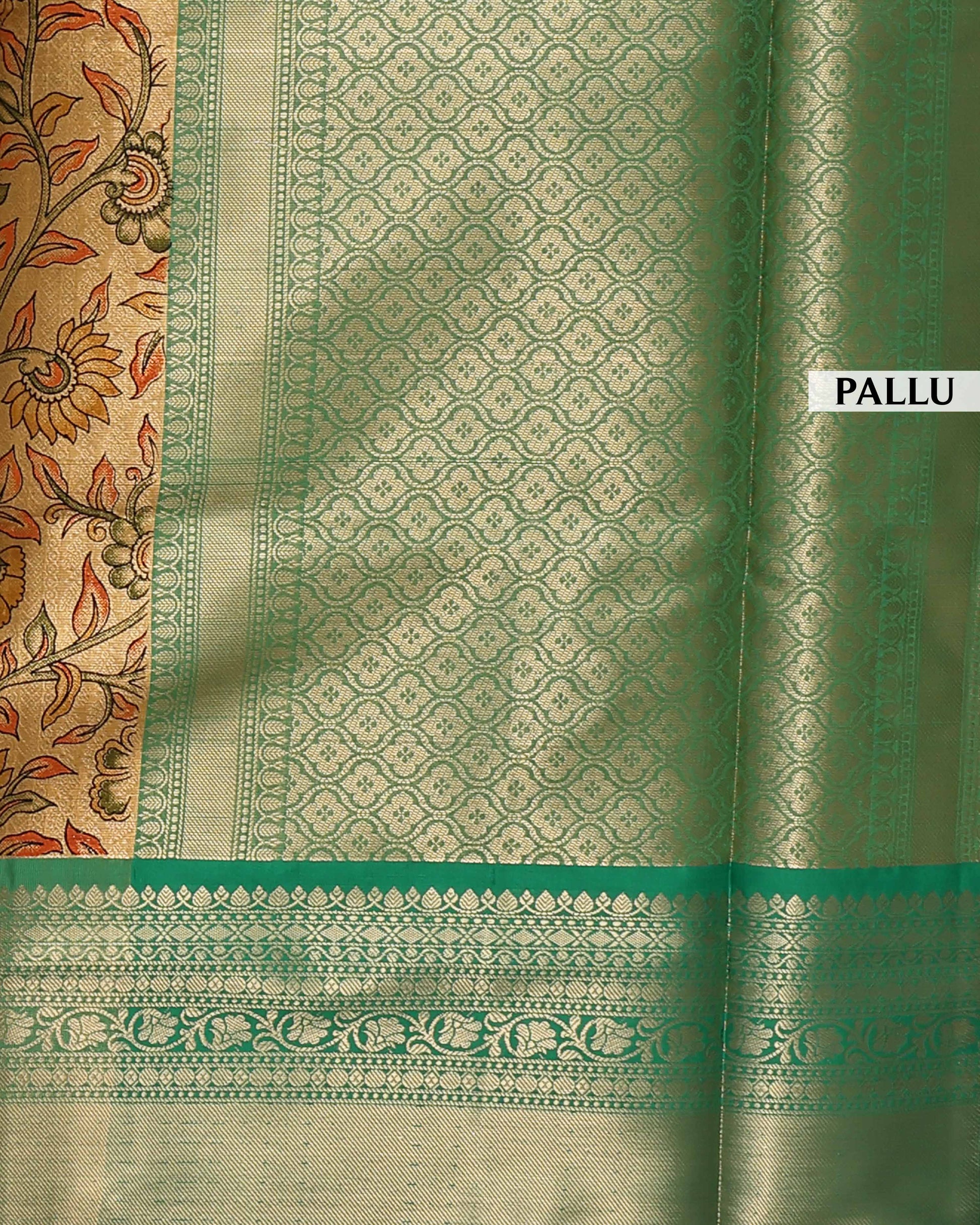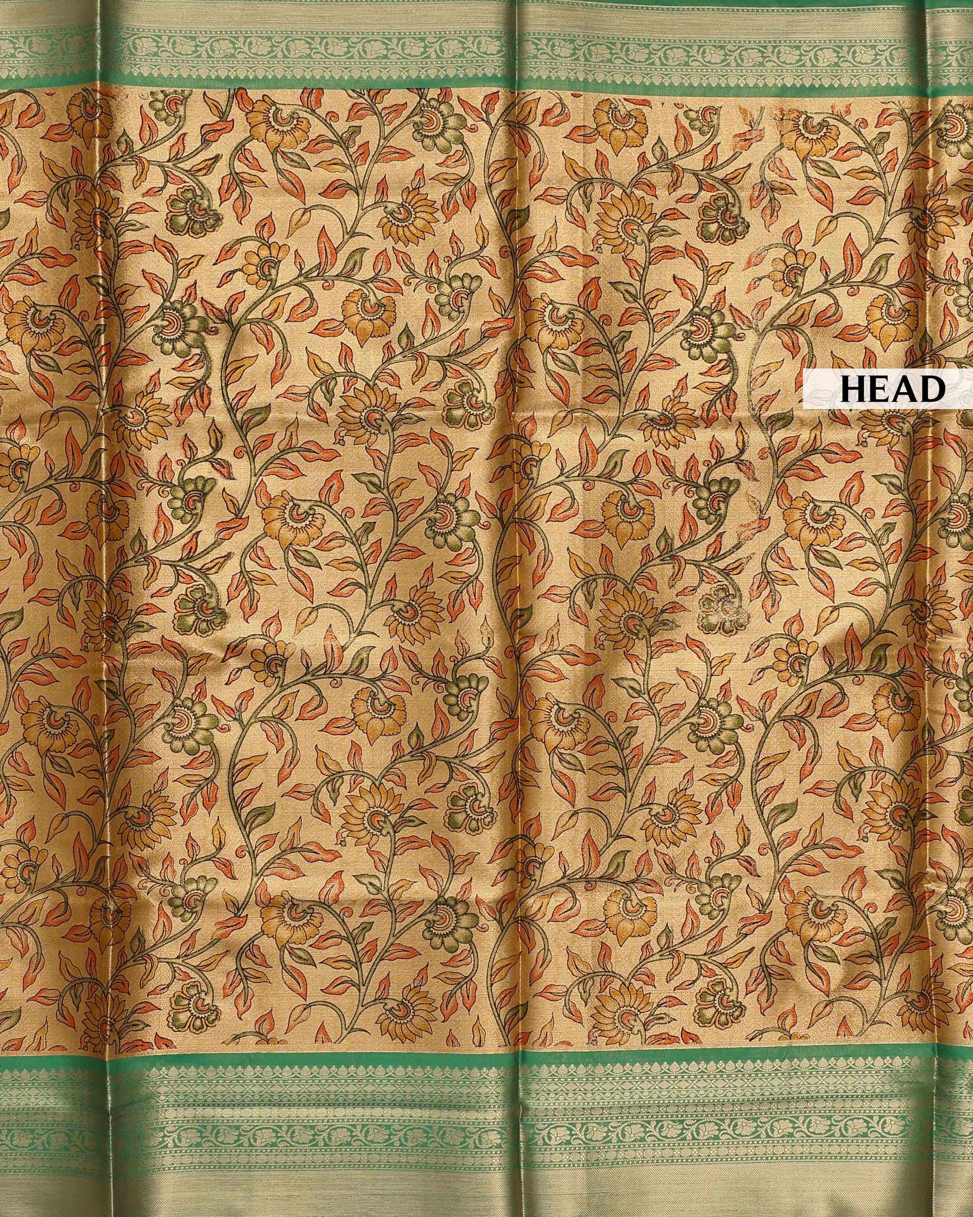 The saree in the image a detailed floral pattern with a color palette of gold, orange, and green