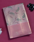- This is a light pink tissue silk saree with a woven paisley pattern on the body and a contrasting solid pink border.