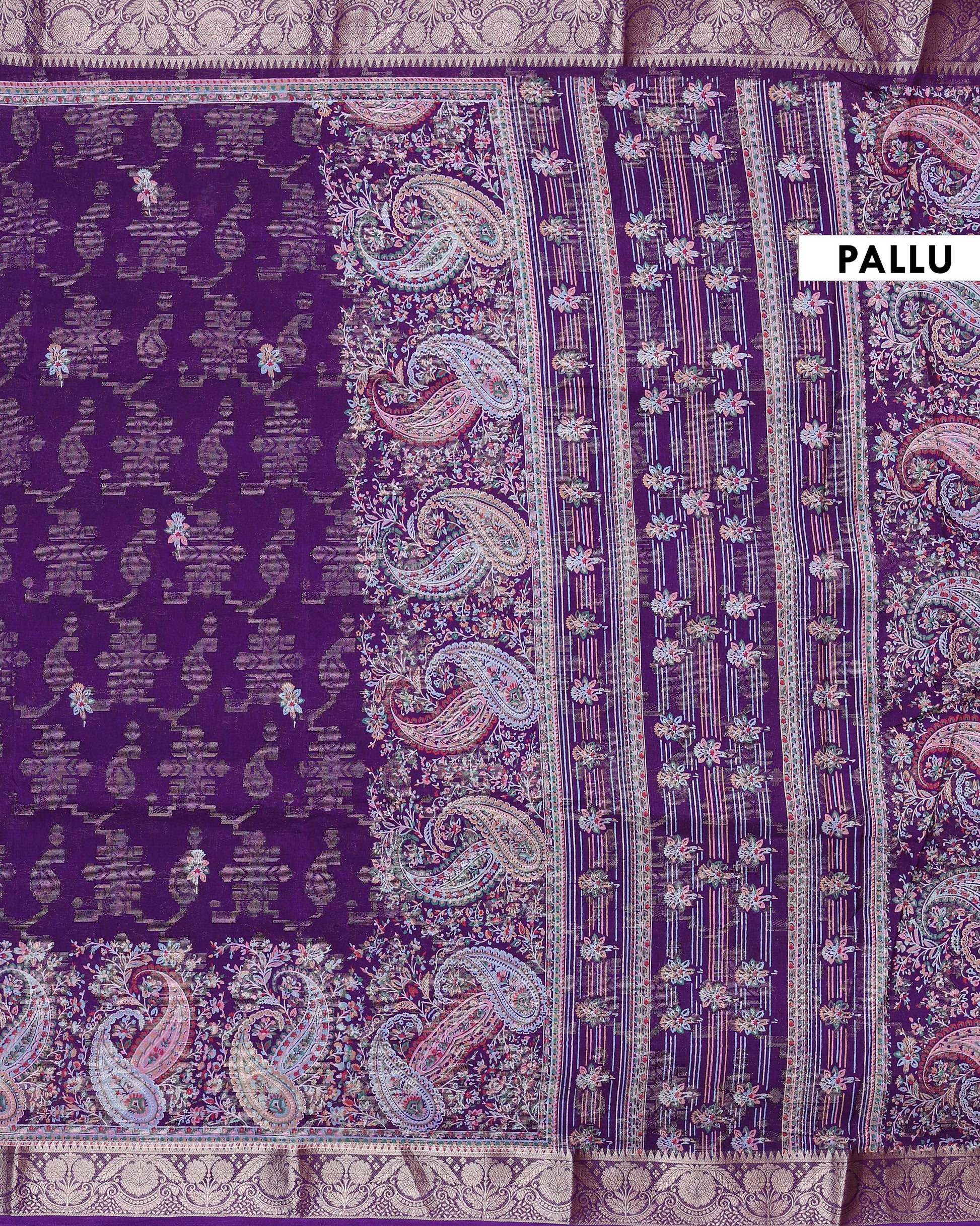 - Elevate your ethnic wardrobe with this royal wine purple Dola silk saree, adorned with a rich, intricate golden zari border