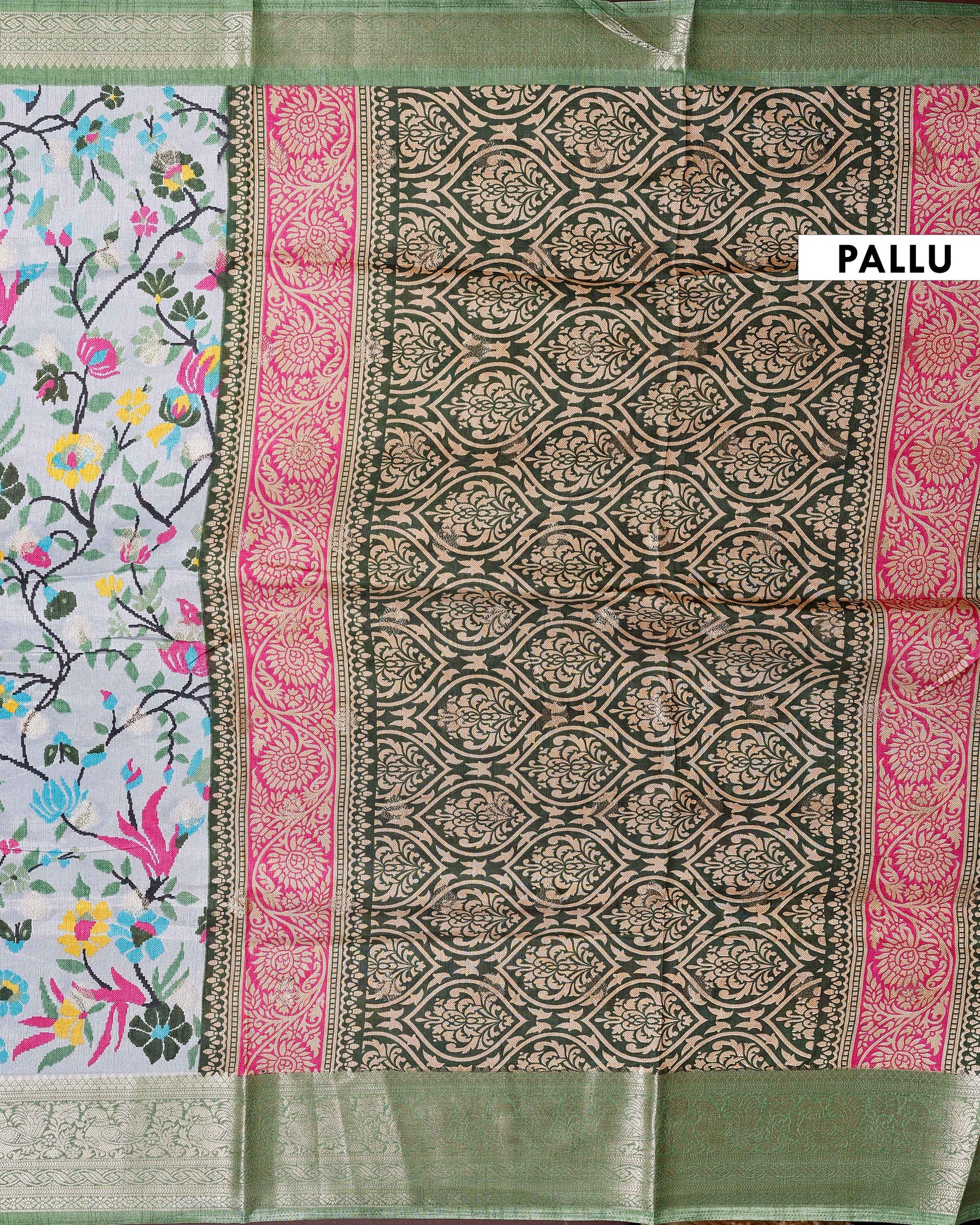 - This is an elegant fancy silk saree an all-over floral weaving on a light background
