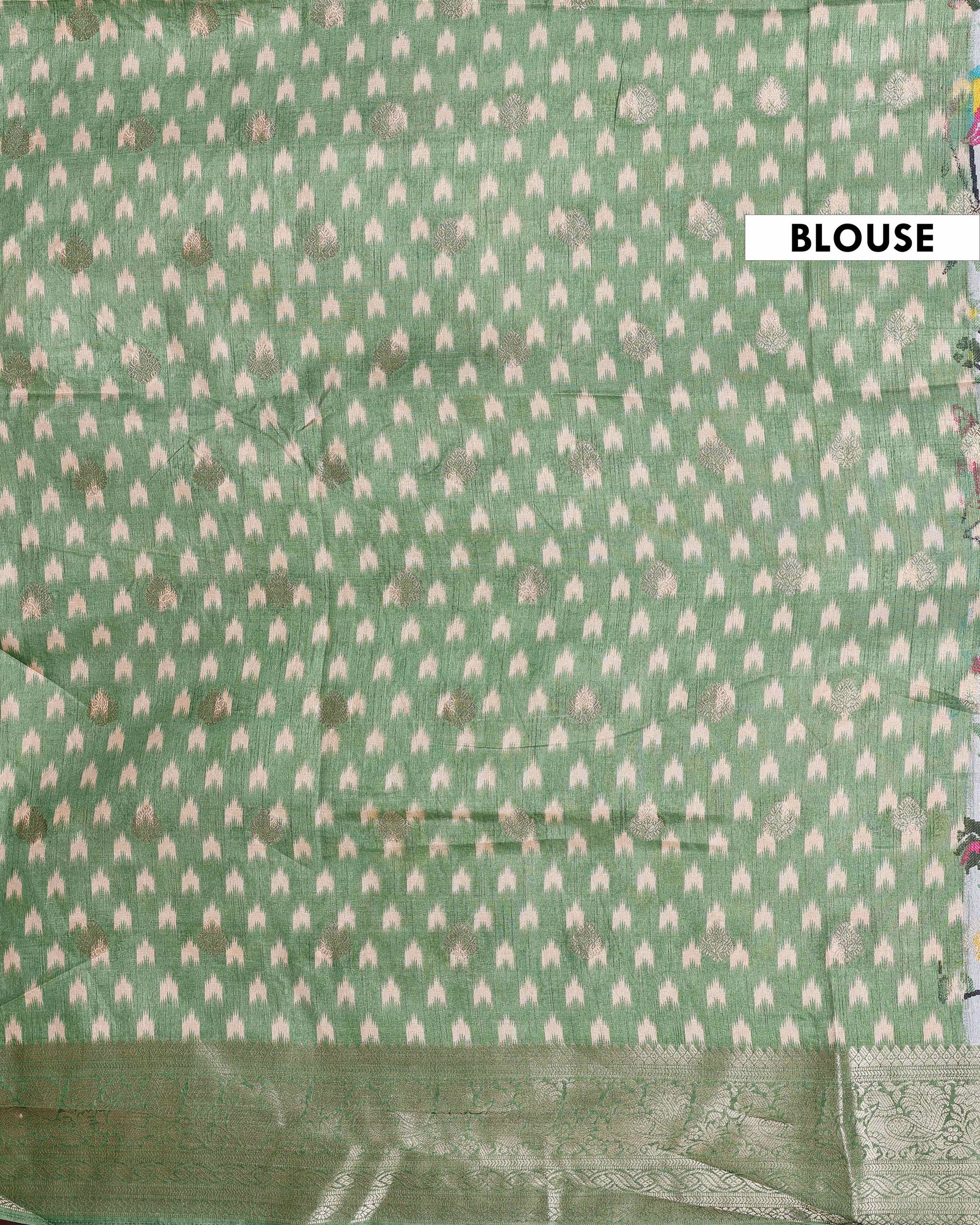 It is complemented by a contrasting zari border in green and a detailed pallu with pink and dark green patterns.
