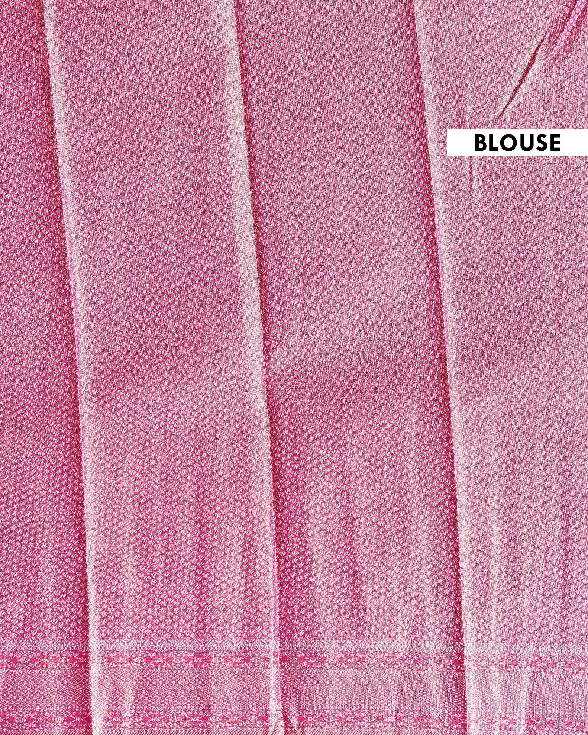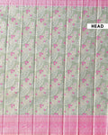 - This elegant mint green Niranjana silk saree delicate floral motifs woven throughout the body complemented by a striking contrasting pink border