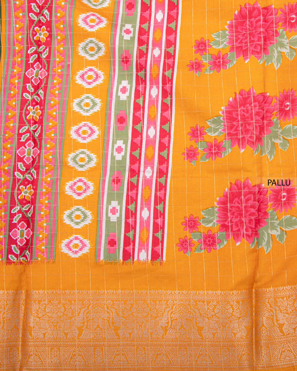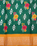 - This Dola silk saree a vibrant green checkered body with bold floral prints complemented by a golden woven border